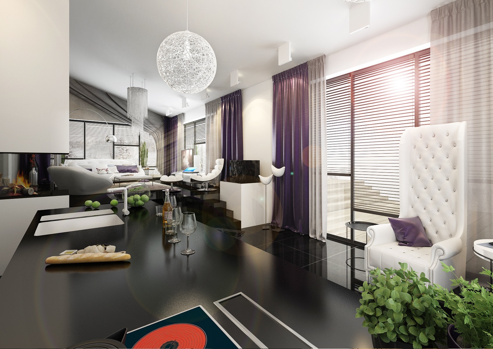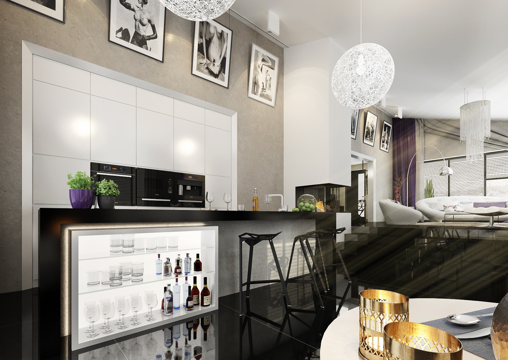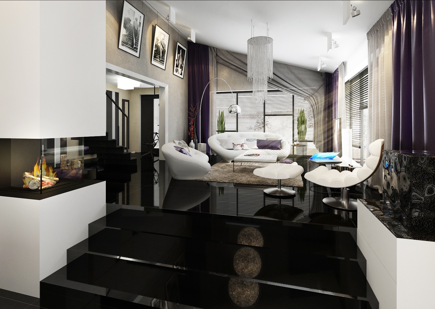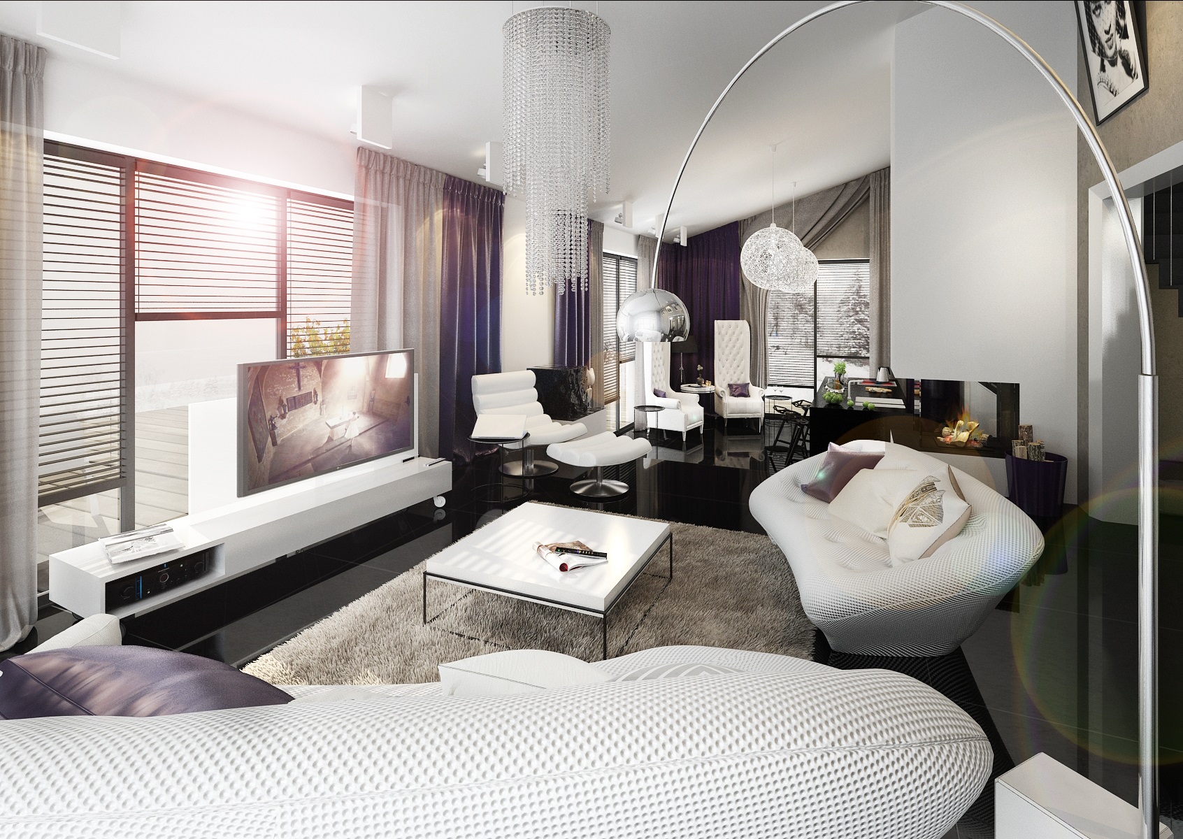 Dark purple, blue and gold accents. Upon entering the villa, the large-format tiles in black gloss are immediately fascinating, and in the next row there is a large space for the living room, kitchen and hallway with a staircase. There are magnificent chandeliers, extravagant white upholstered seats and armchairs.