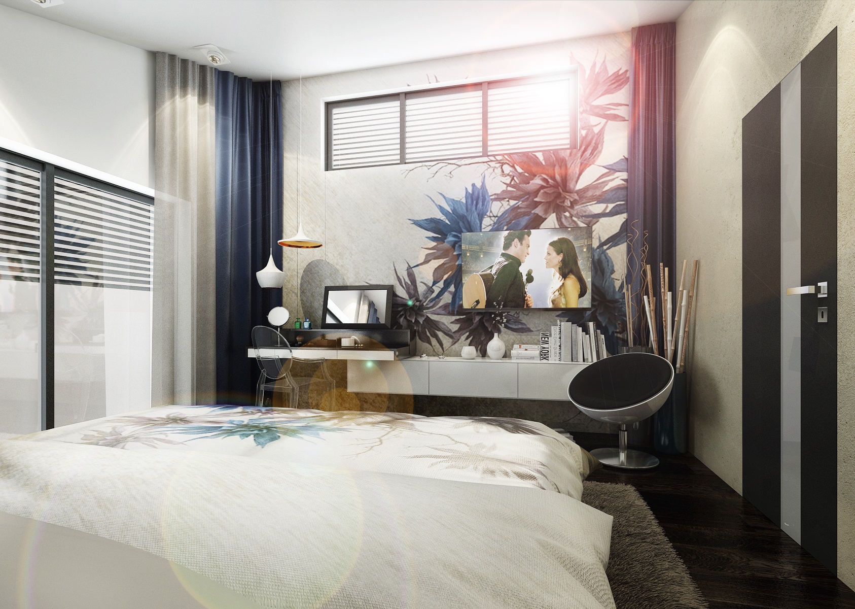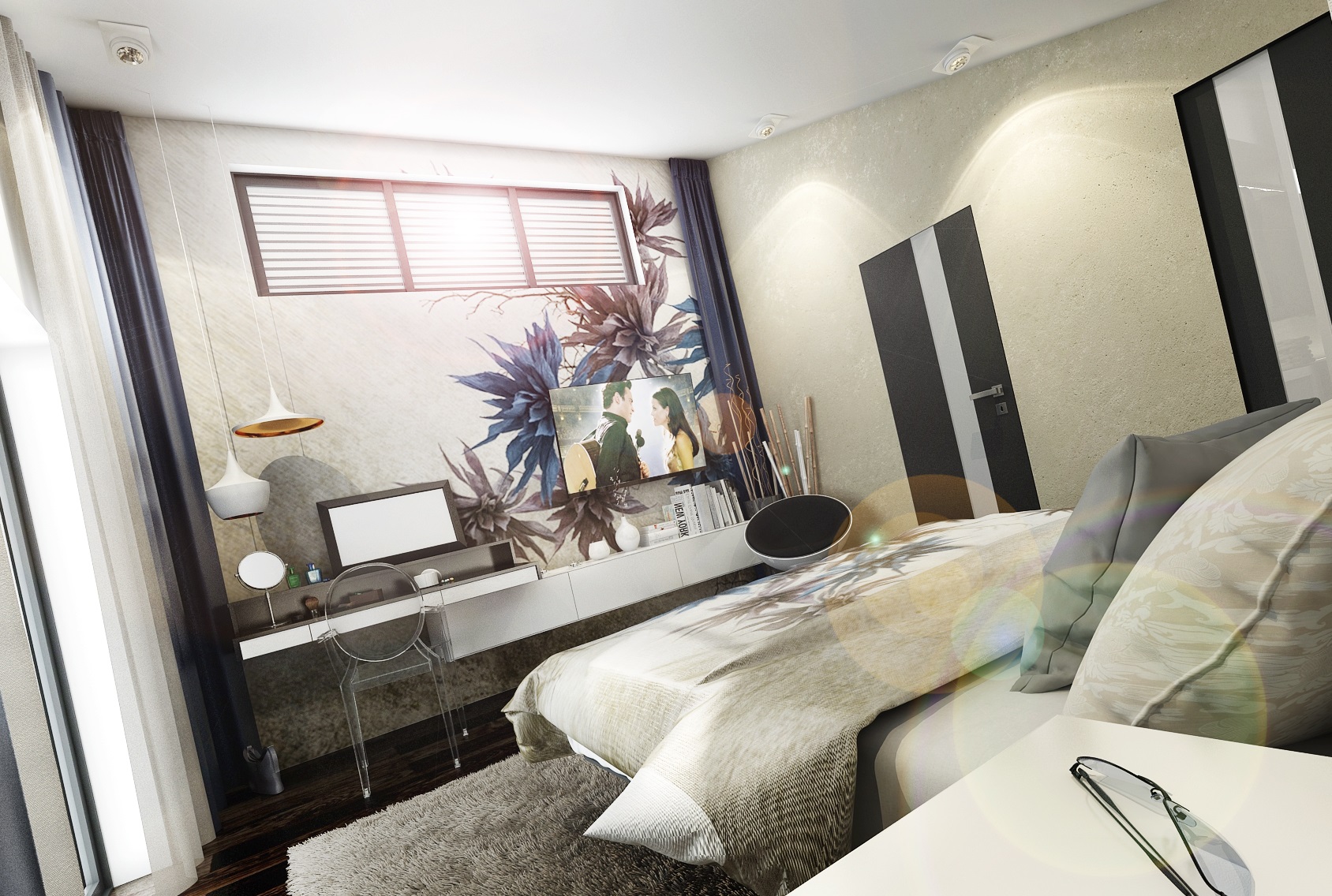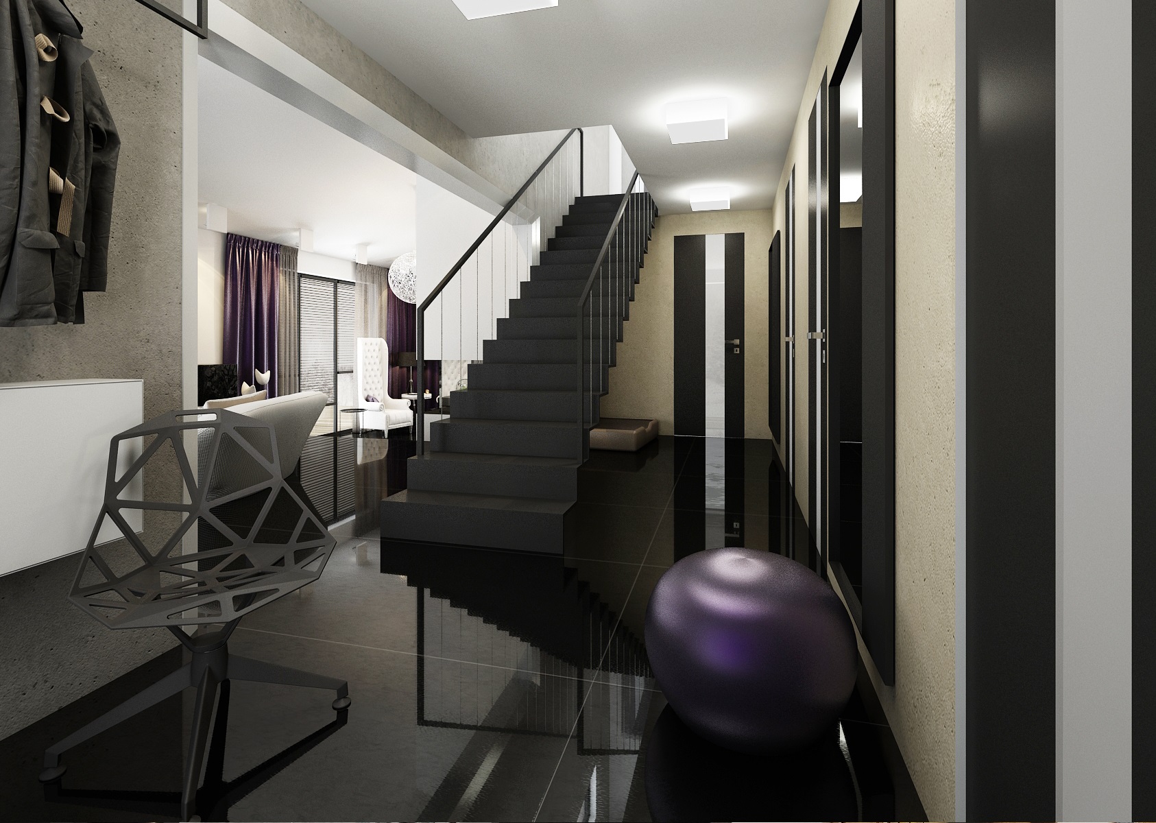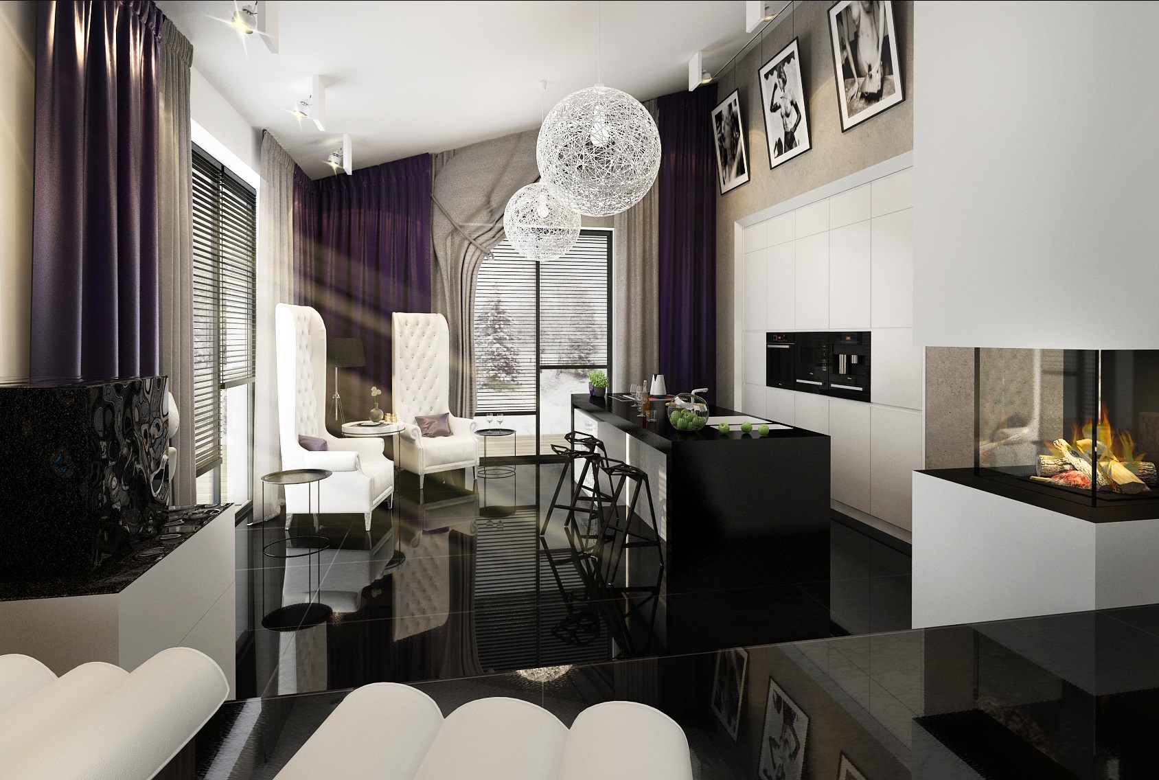 Dark purple, blue and gold accents. Upon entering the villa, the large-format tiles in black gloss are immediately fascinating, and in the next row there is a large space for the living room, kitchen and hallway with a staircase. There are magnificent chandeliers, extravagant white upholstered seats and armchairs.