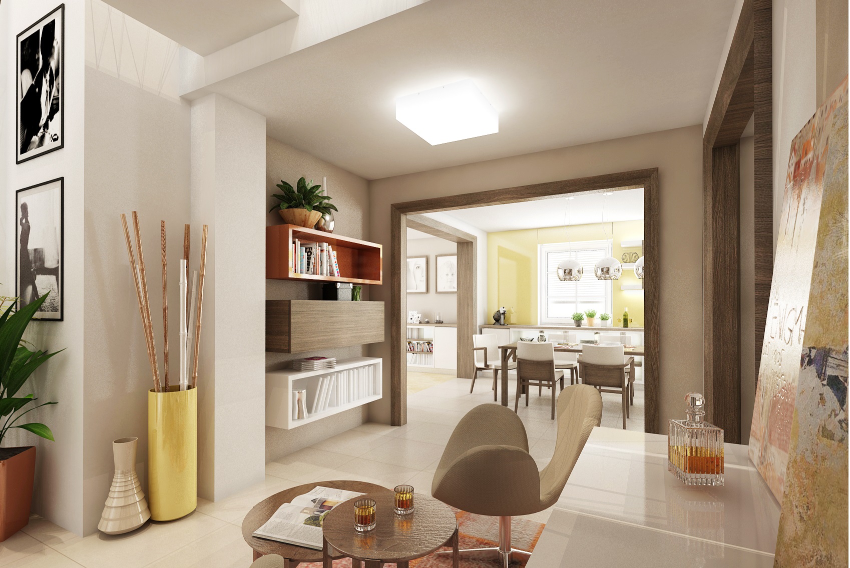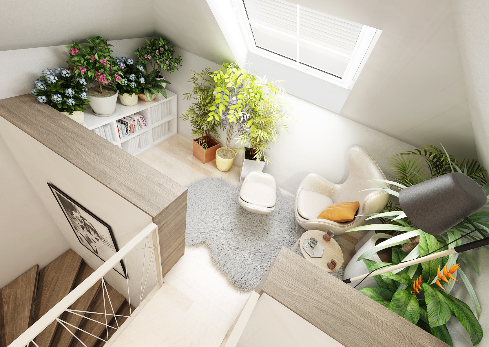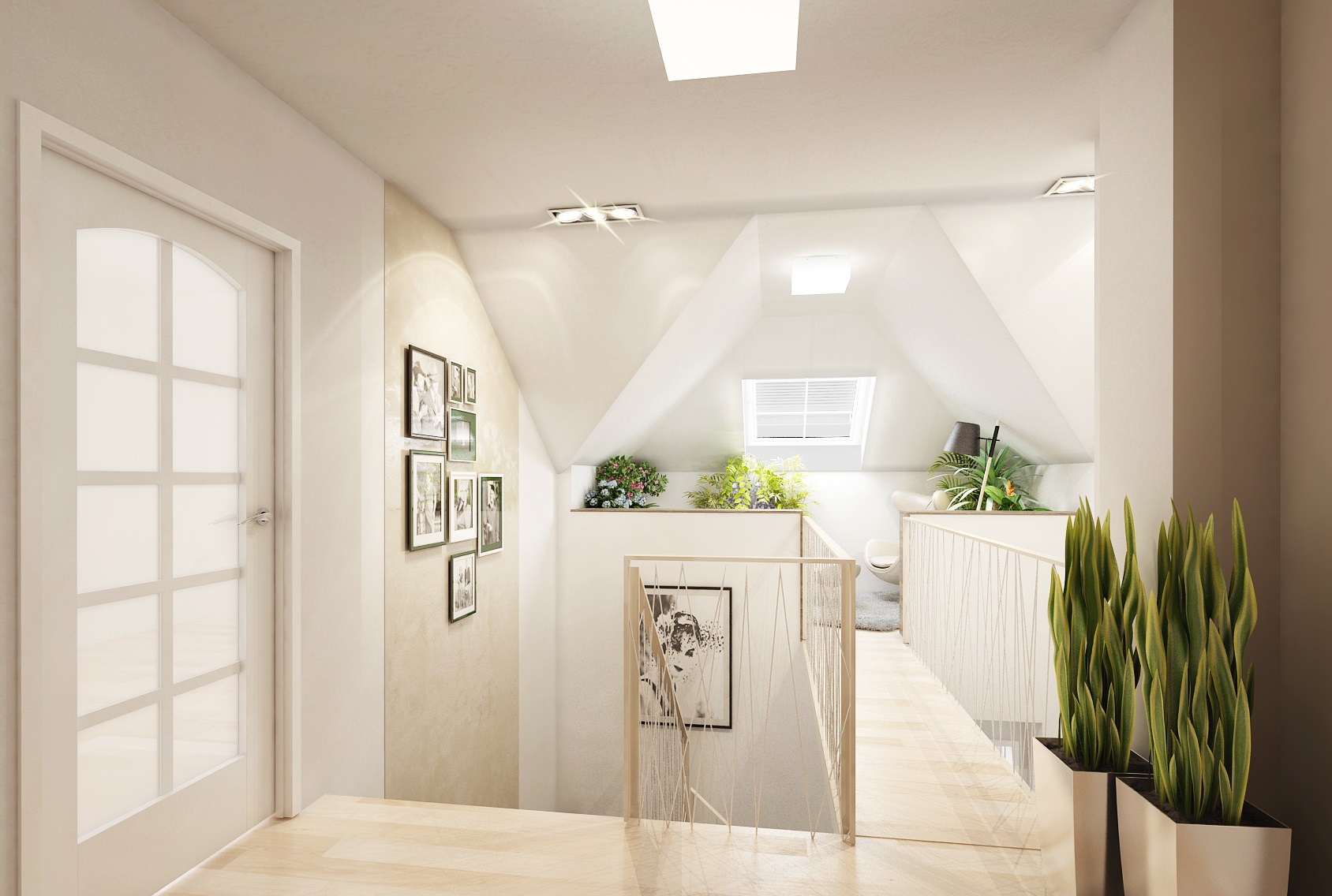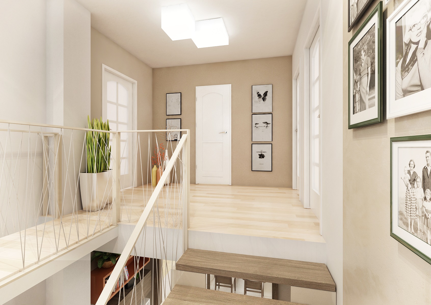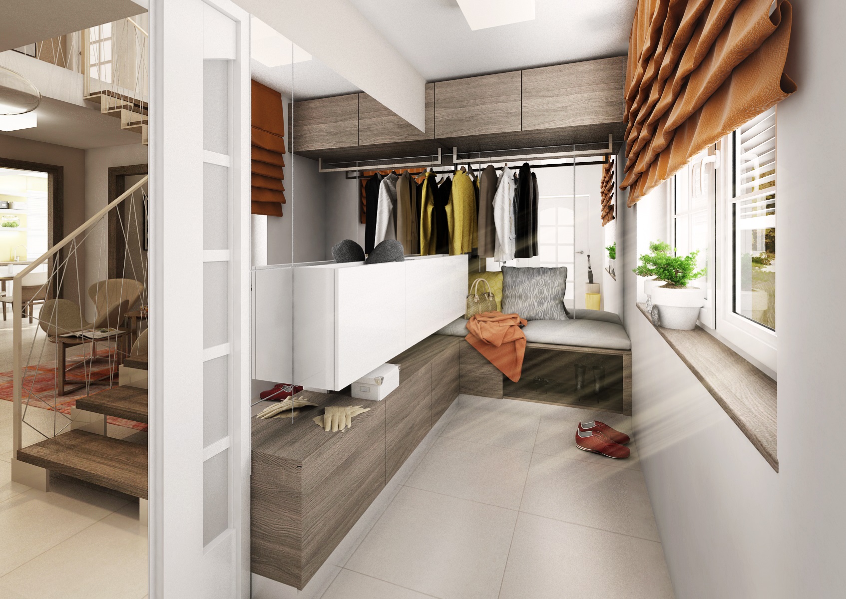 spacious kitchen is followed by an equally representative hall with a staircase. The frame of the railing is made of steel strip and the filling is made of variously intertwined steel cables. The hall is tuned to beige tones in combination with orange and yellow elements. Above the staircase is a bridge leading to a rest room in the attic.
