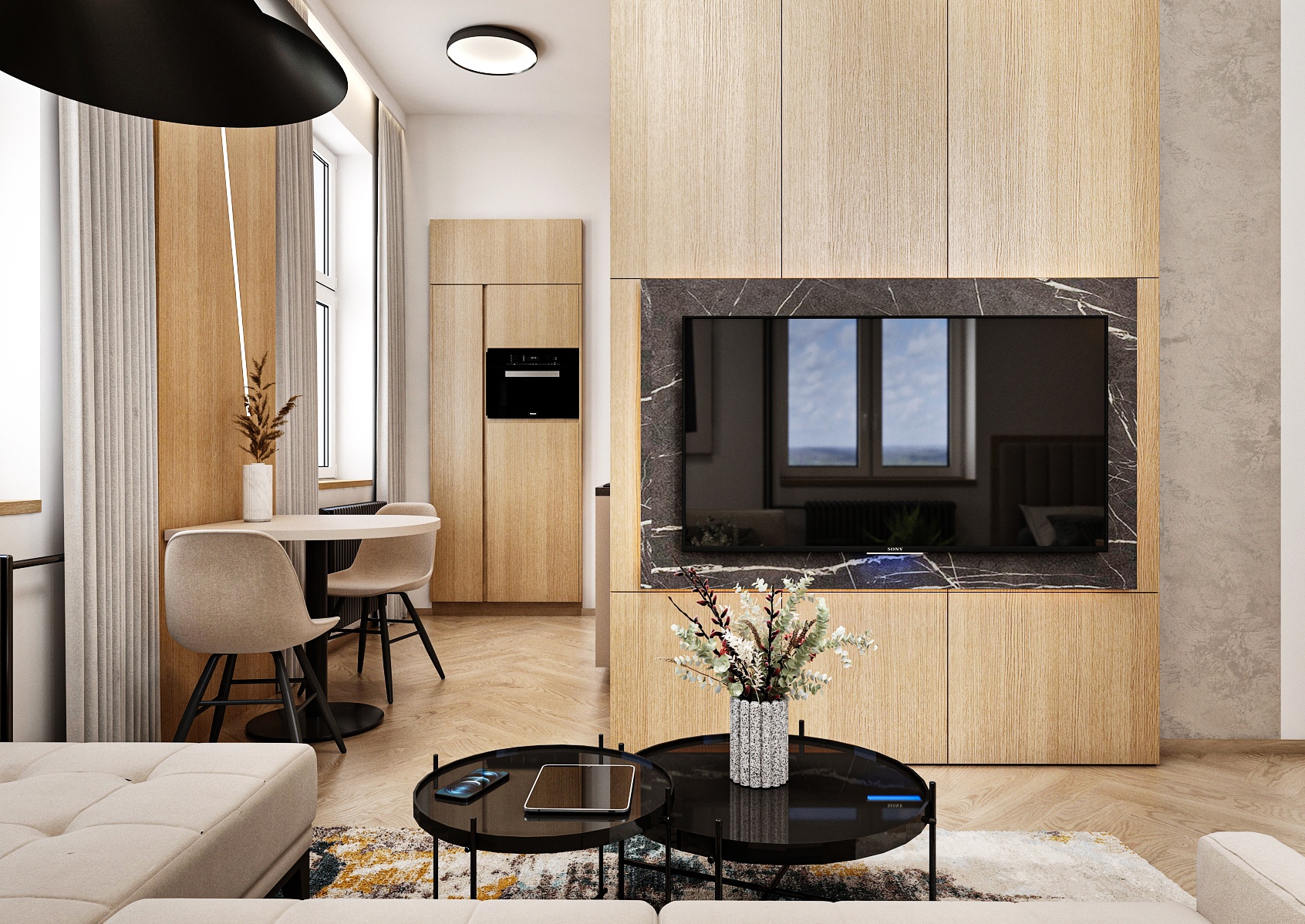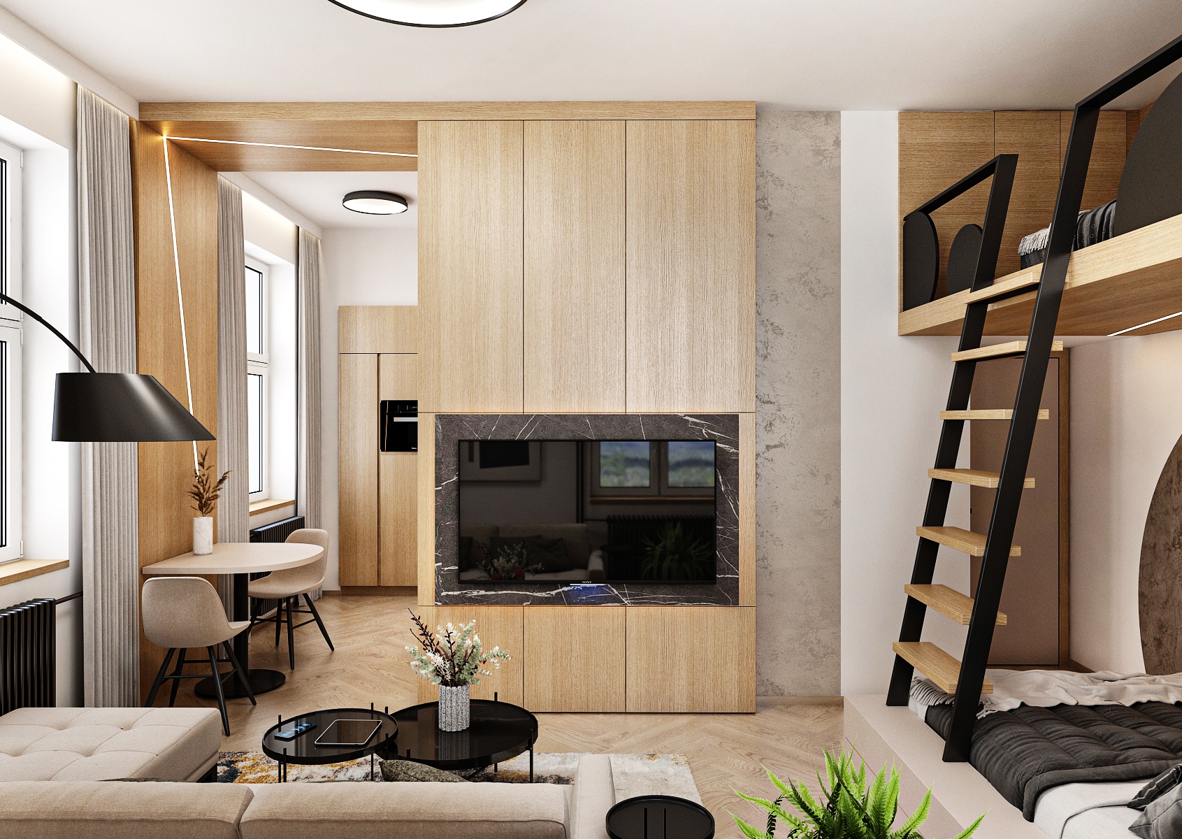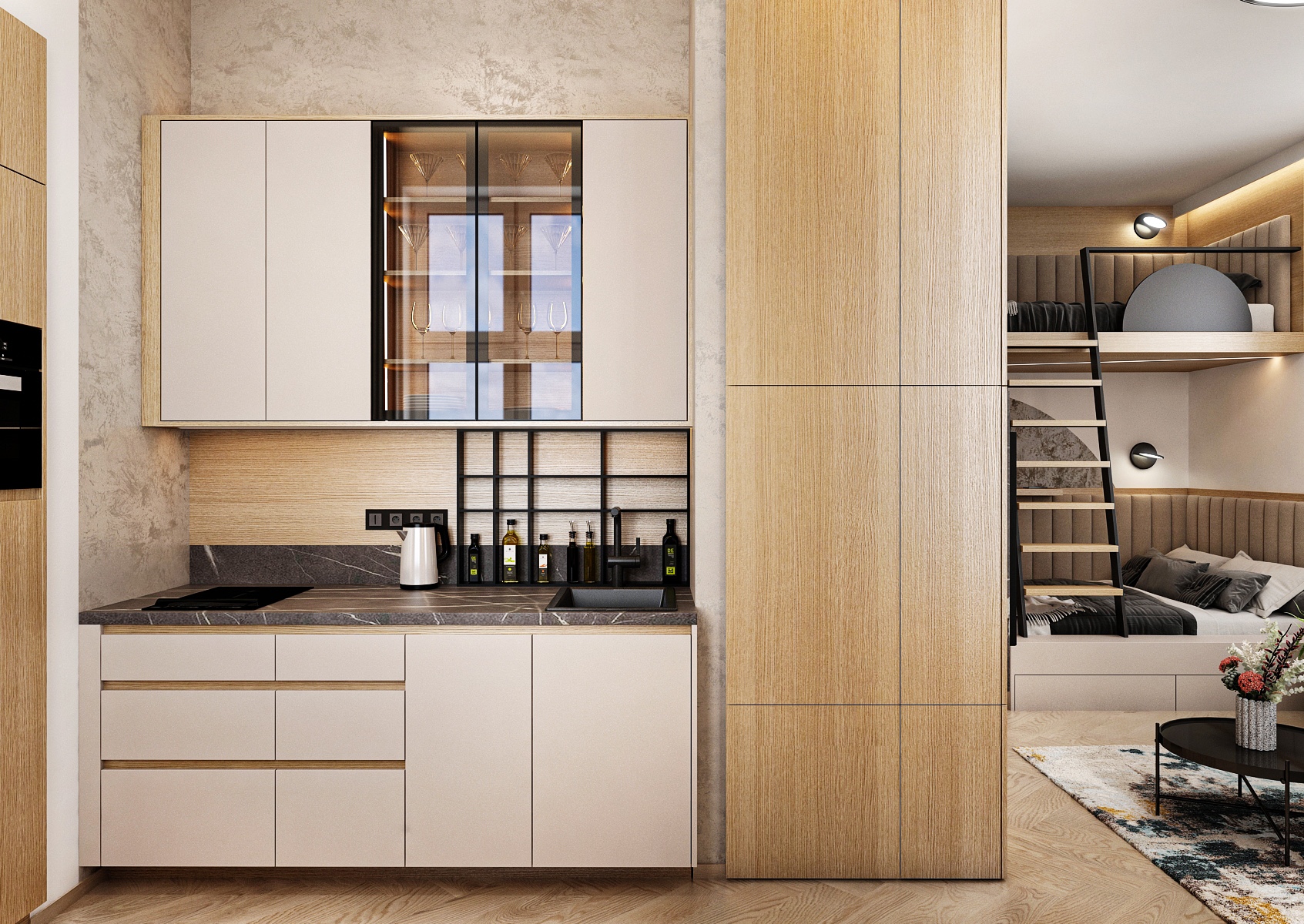 The interior of this studio apartment is designed with an emphasis on a modern and compact arrangement that maximizes the use of space.