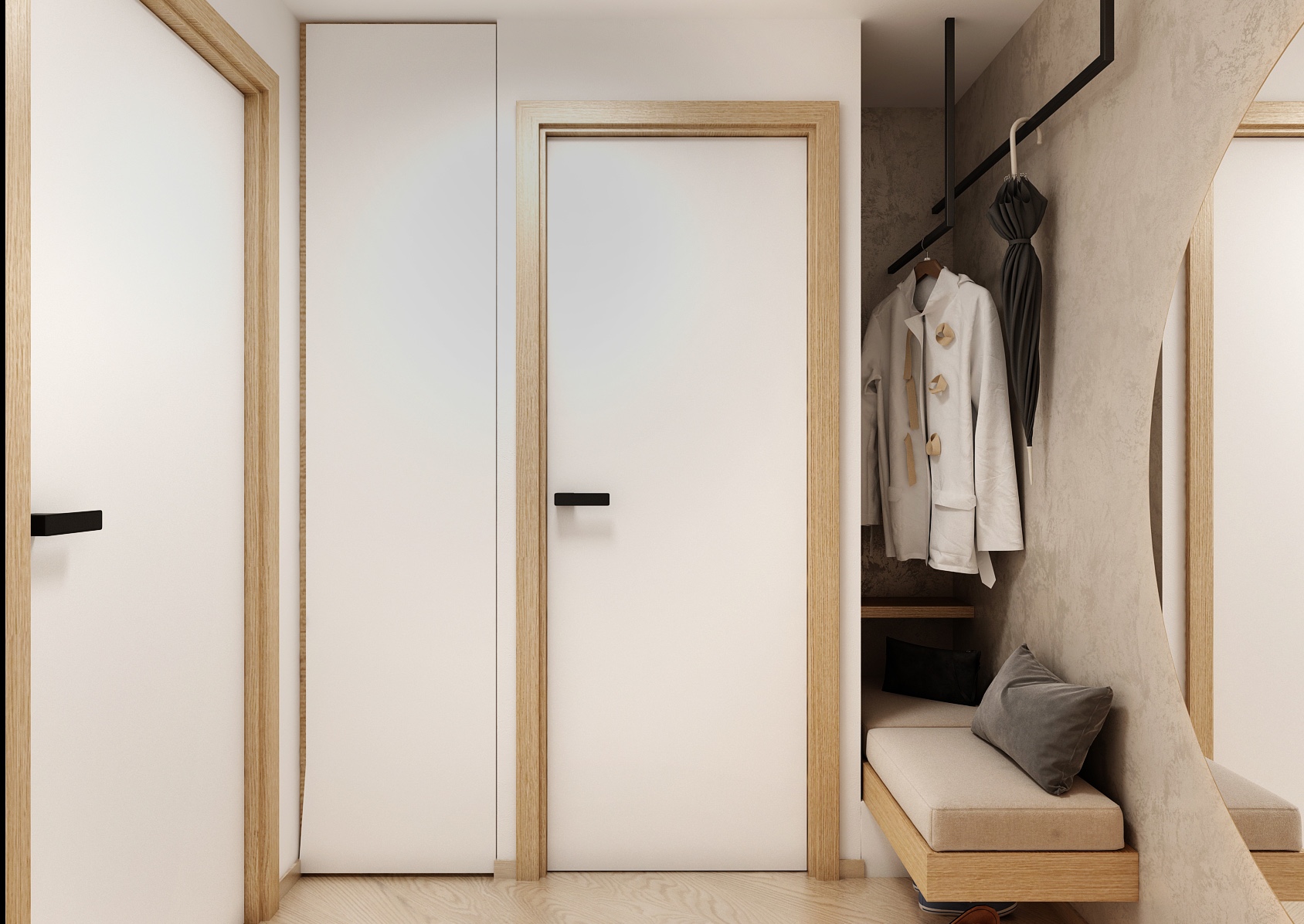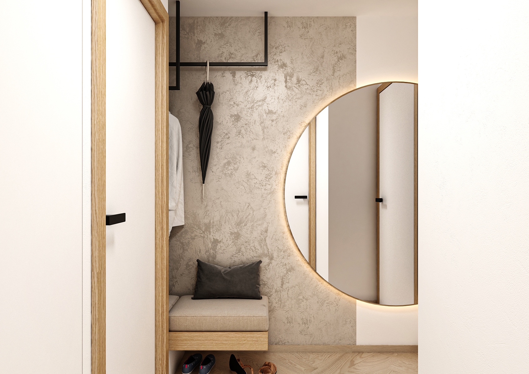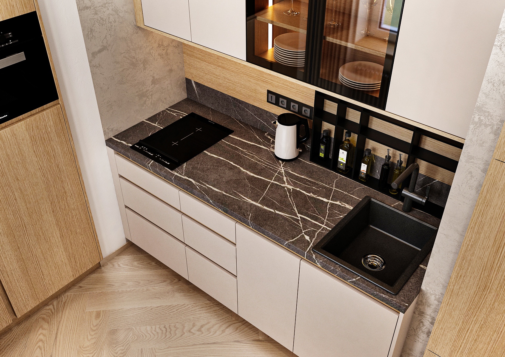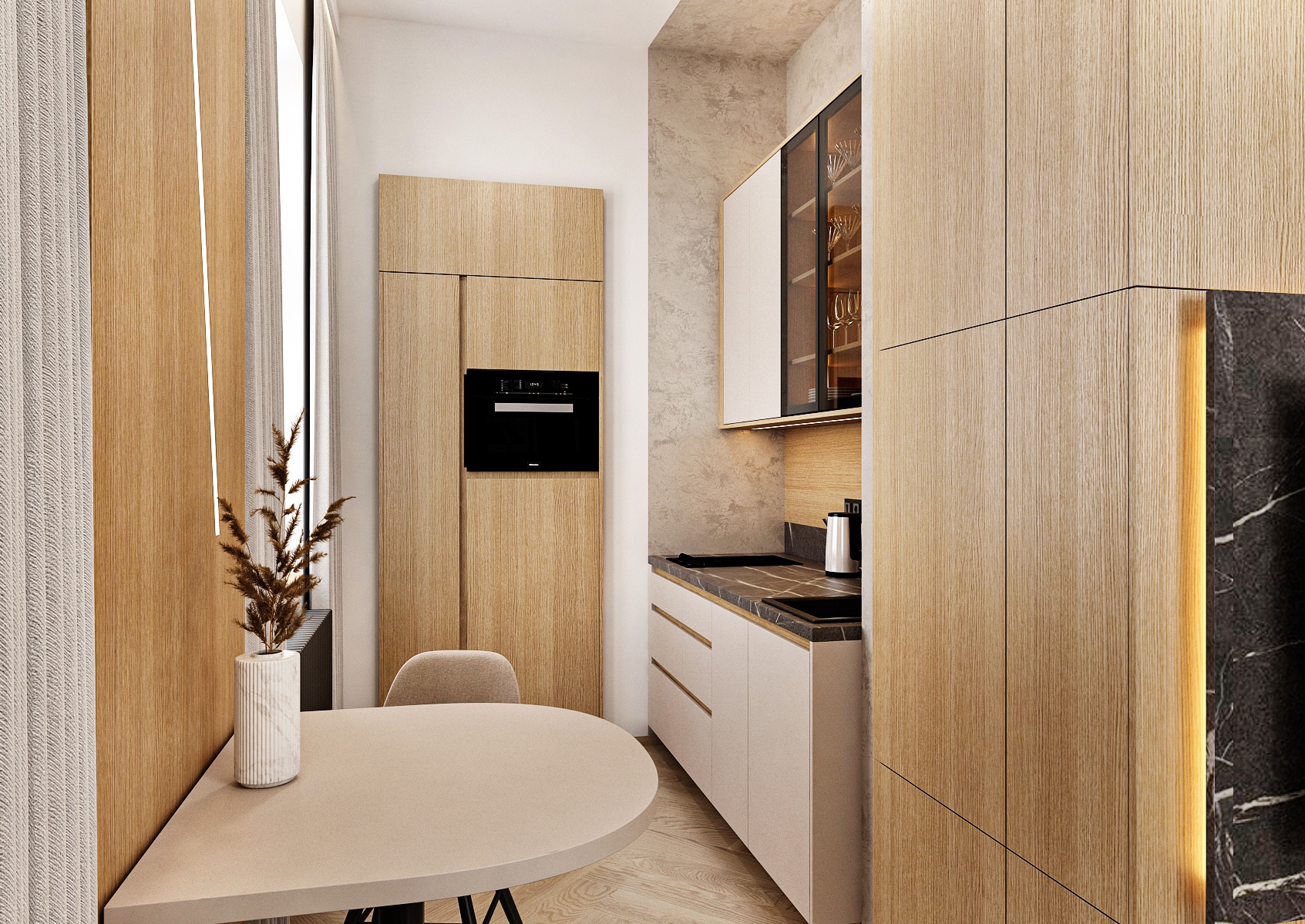 The interior of this studio apartment is designed with an emphasis on a modern and compact arrangement that maximizes the use of space.