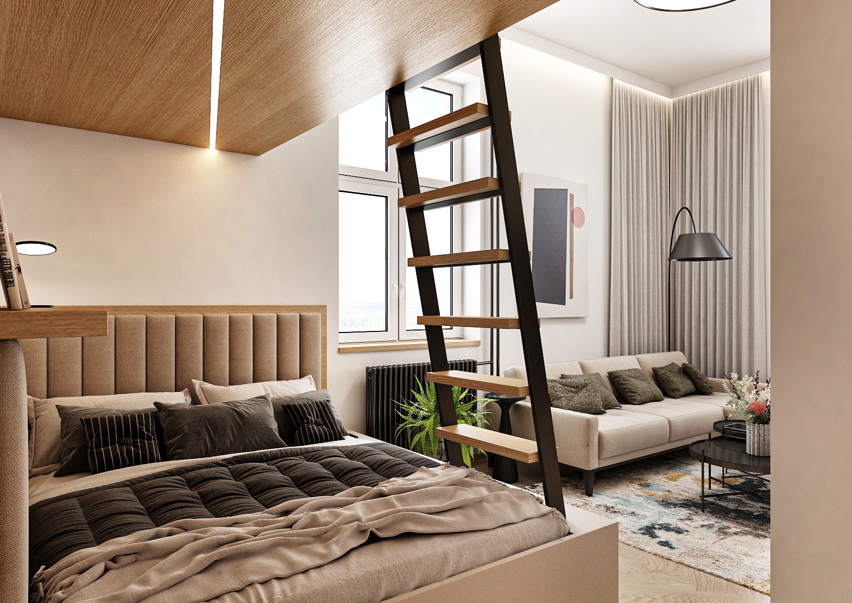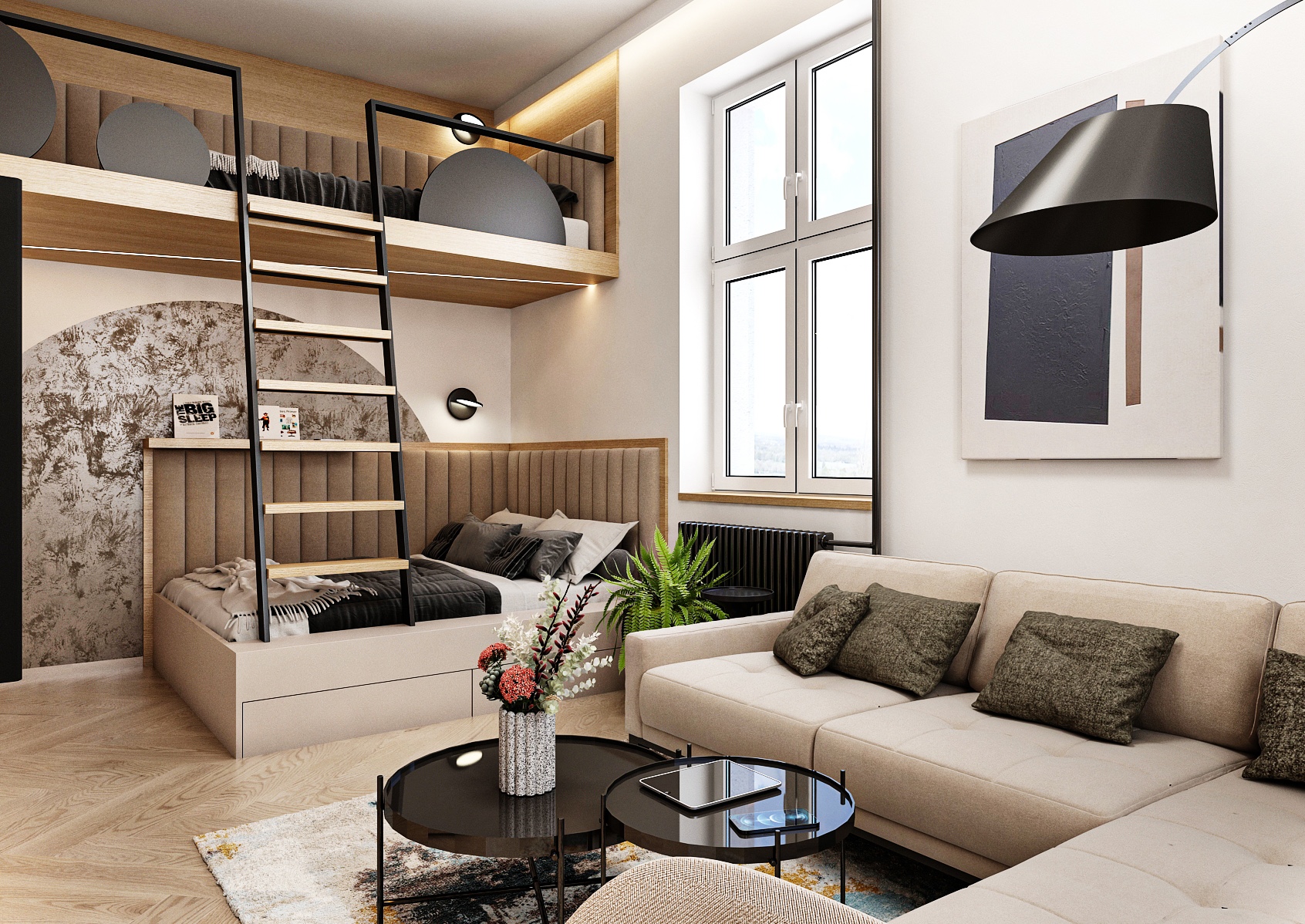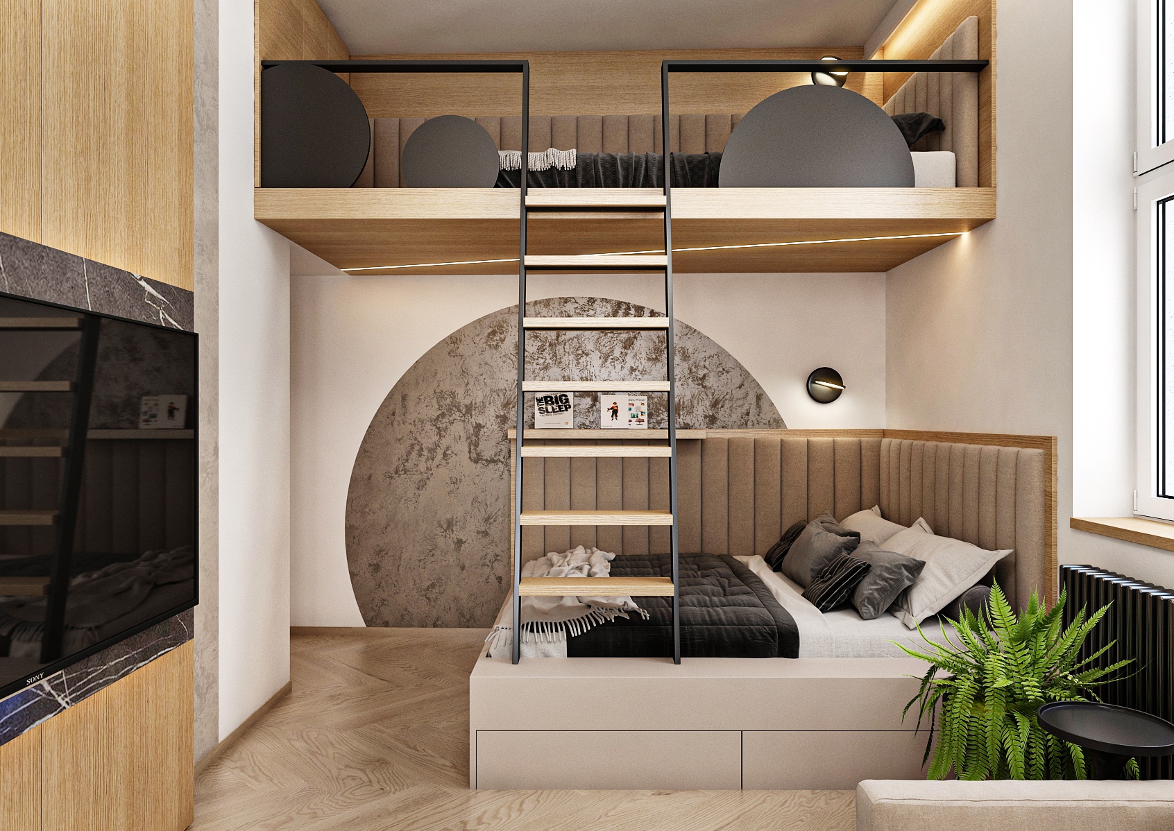 A bunk bed is a smart solution for small spaces, which allows you to use the area under the bed for other functions, such as a work or relaxation zone. The lower part of the bed is designed as a comfortable sleeping corner with soft upholstery and enough pillows for maximum comfort. The upper floor is accessed by an elegant wooden ladder with a metal frame, which gives the structure robustness and a modern look. This multifunctional space is ideal for young professionals or students who appreciate a practical and aesthetic solution in one.