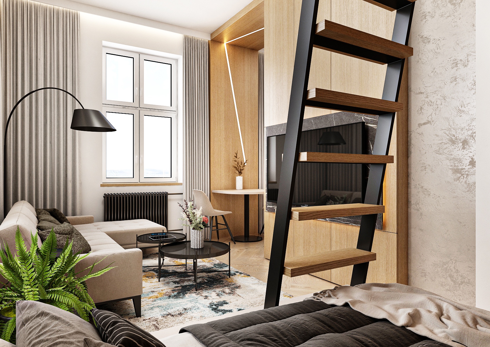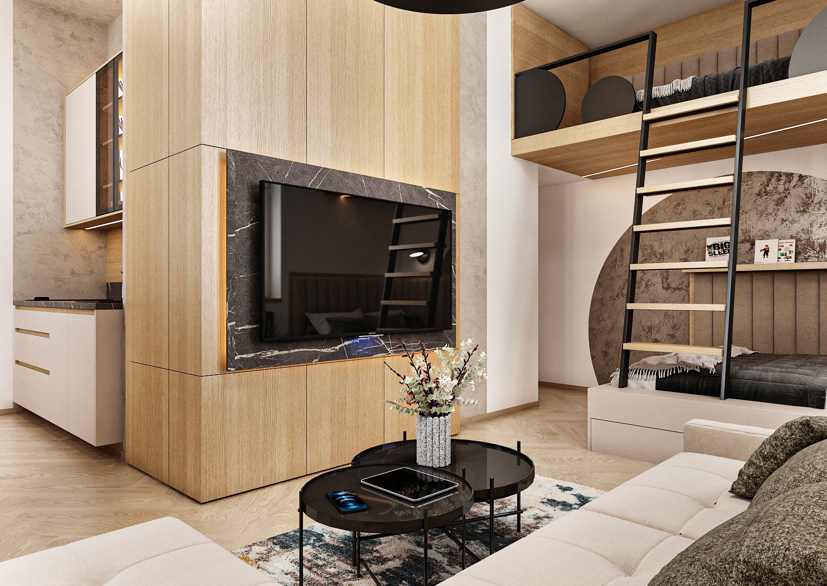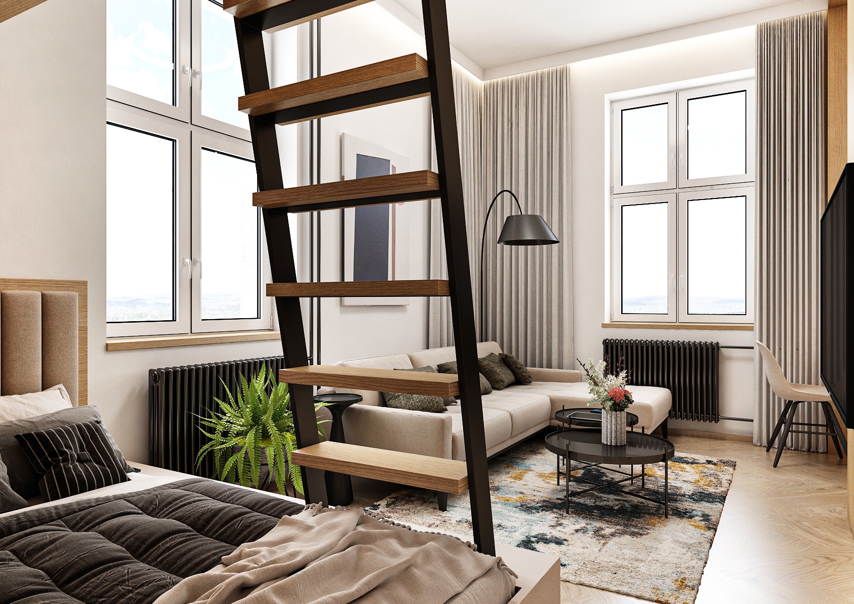 A bunk bed is a smart solution for small spaces, which allows you to use the area under the bed for other functions, such as a work or relaxation zone. The lower part of the bed is designed as a comfortable sleeping corner with soft upholstery and enough pillows for maximum comfort. The upper floor is accessed by an elegant wooden ladder with a metal frame, which gives the structure robustness and a modern look. This multifunctional space is ideal for young professionals or students who appreciate a practical and aesthetic solution in one.