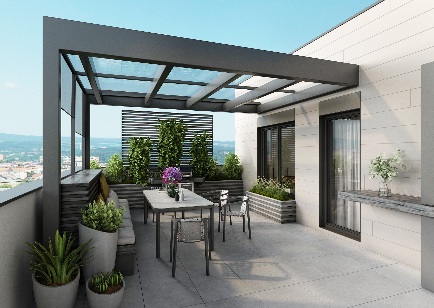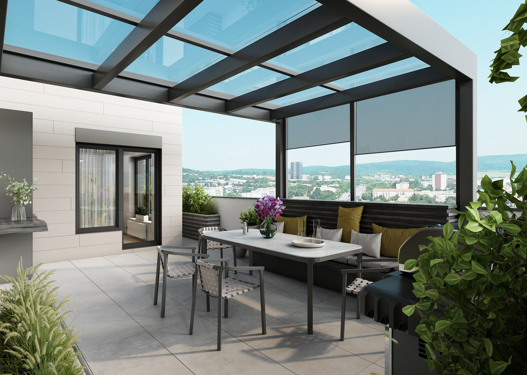 The spacious rooftop apartment offers not only comfortable and modern facilities, but also an attractive view of the city from the terrace.