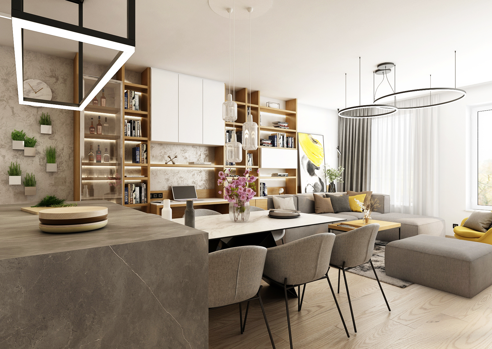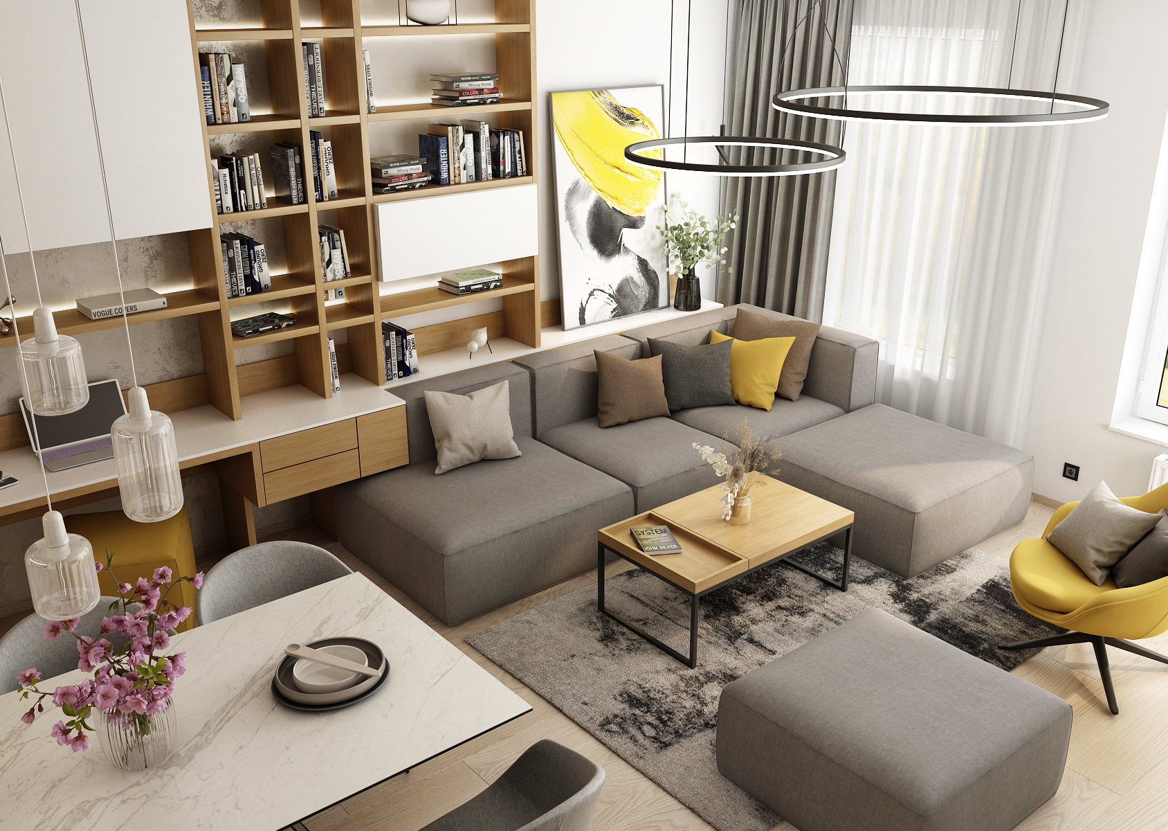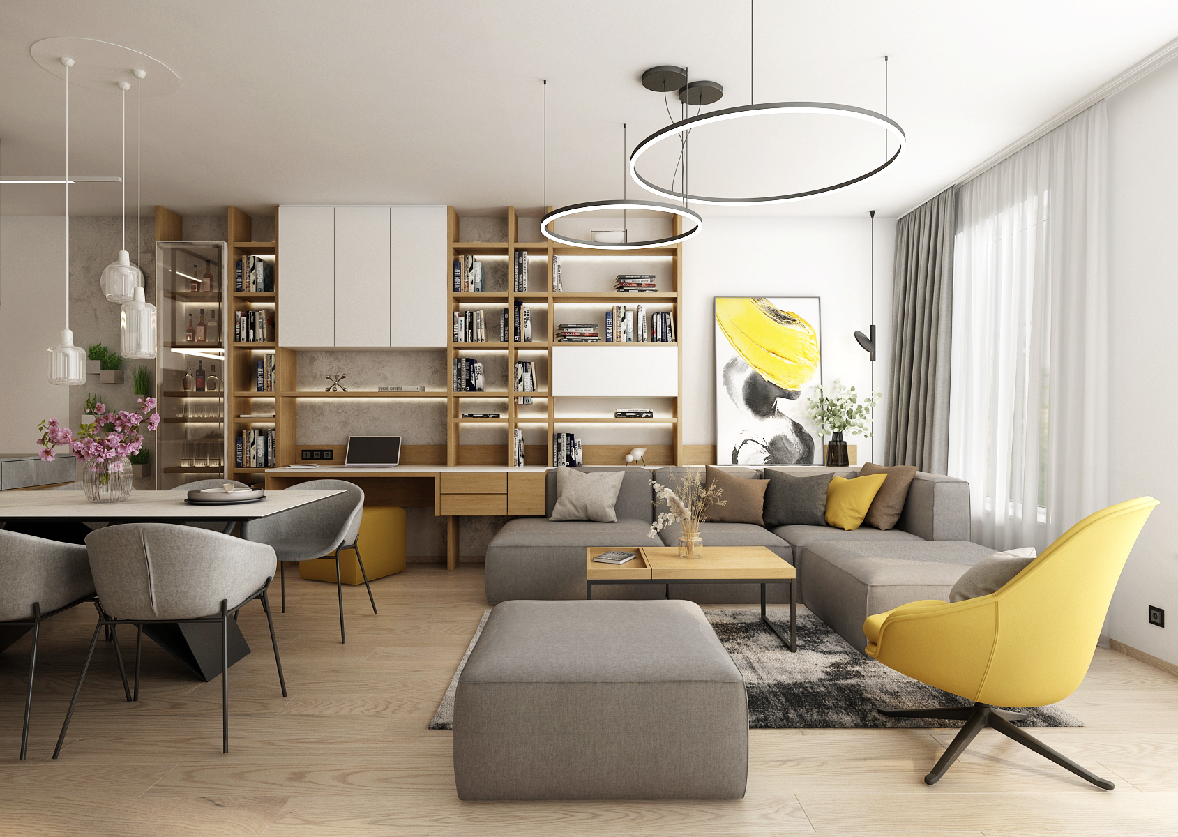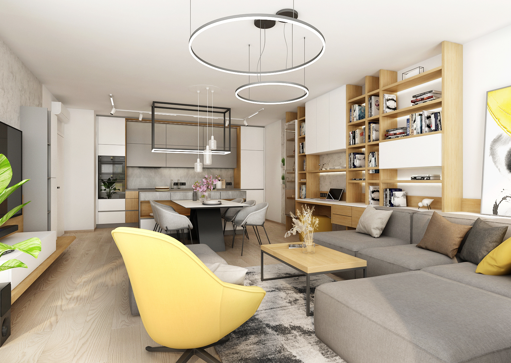 A living space with a yellow accent, which dominates the interior mainly in the form of decorations or furniture elements. A spacious kitchen with a kitchen island connected vertically to a dining table with six dining chairs.