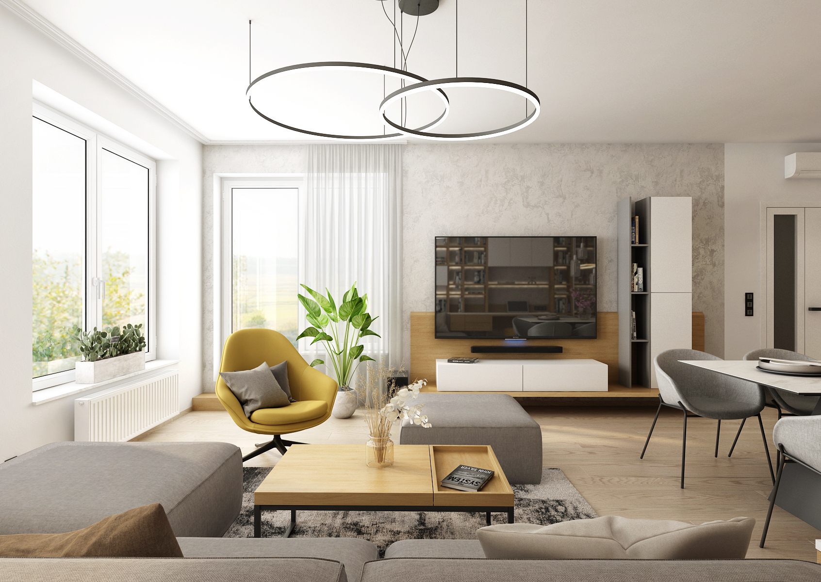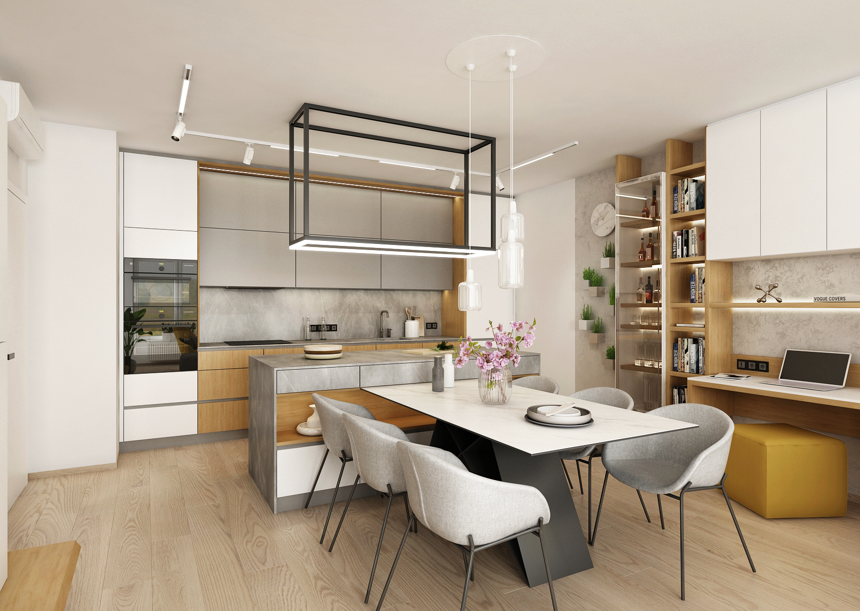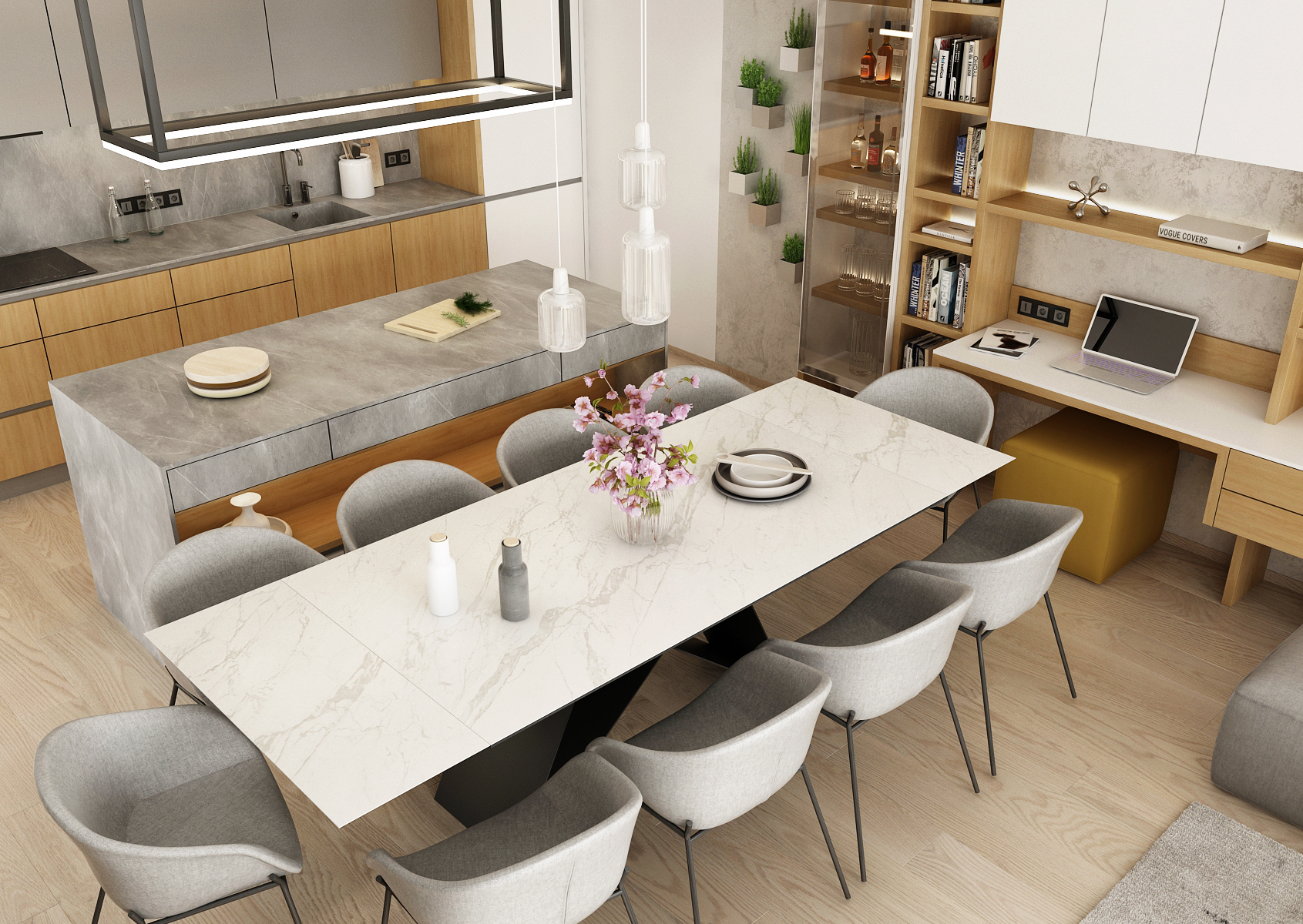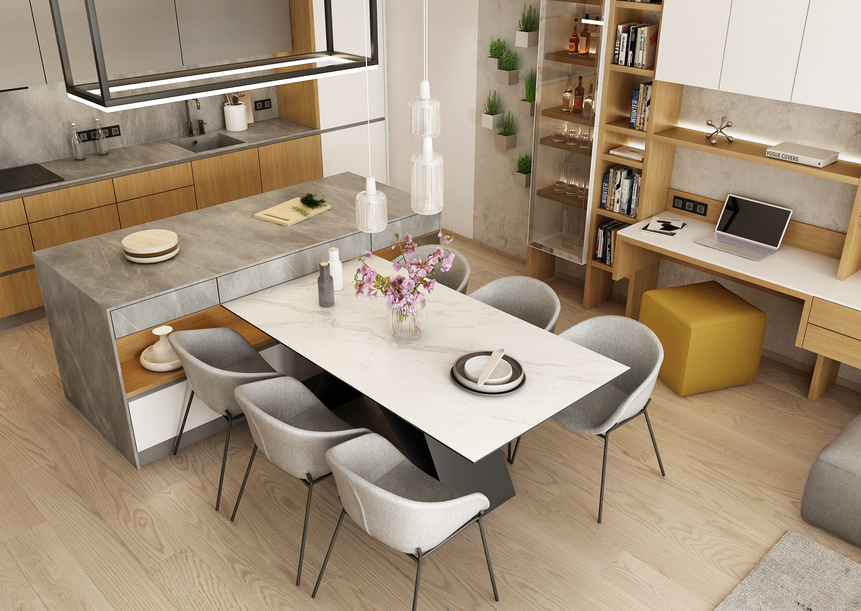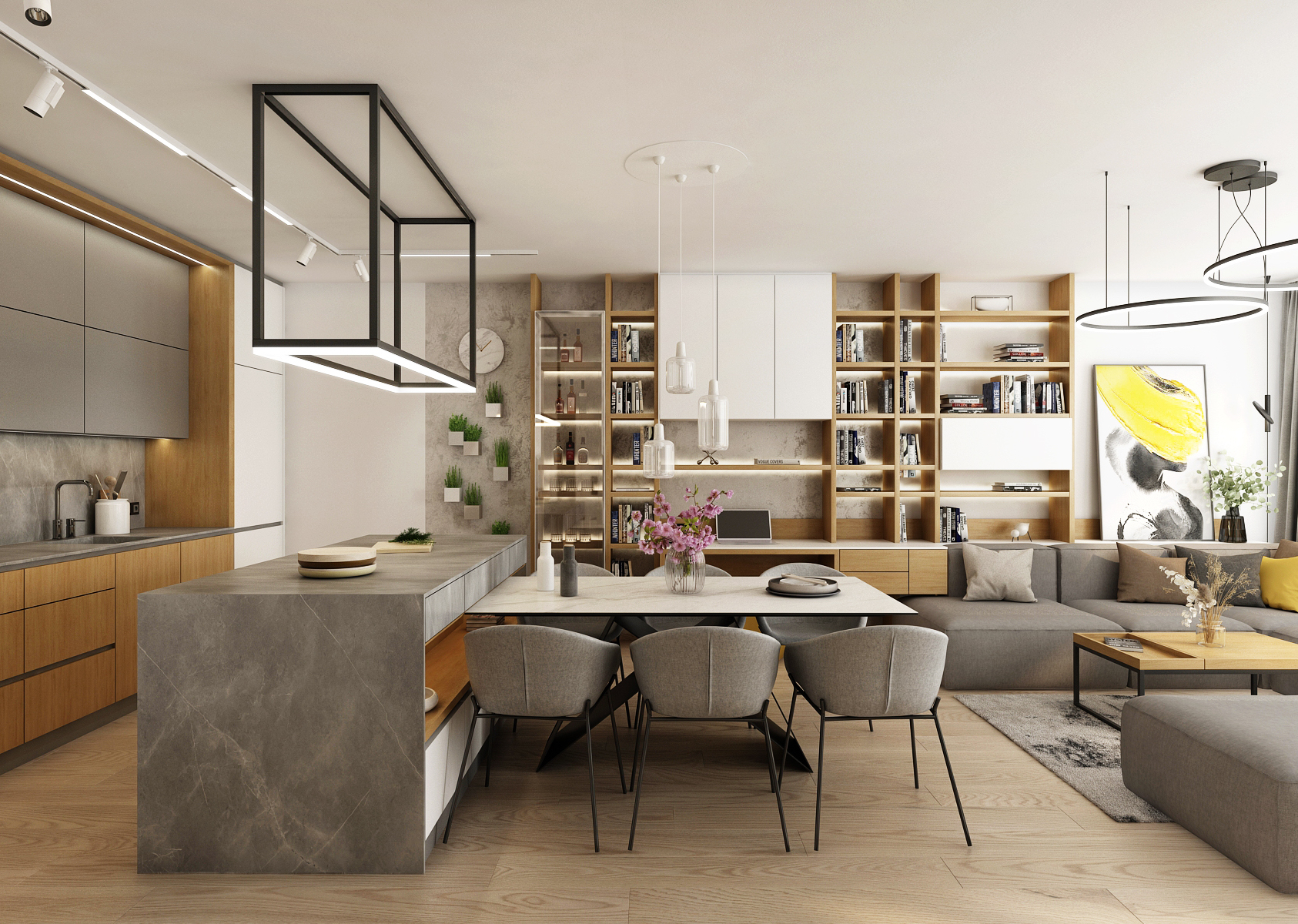 A living space with a yellow accent, which dominates the interior mainly in the form of decorations or furniture elements. A spacious kitchen with a kitchen island connected vertically to a dining table with six dining chairs.