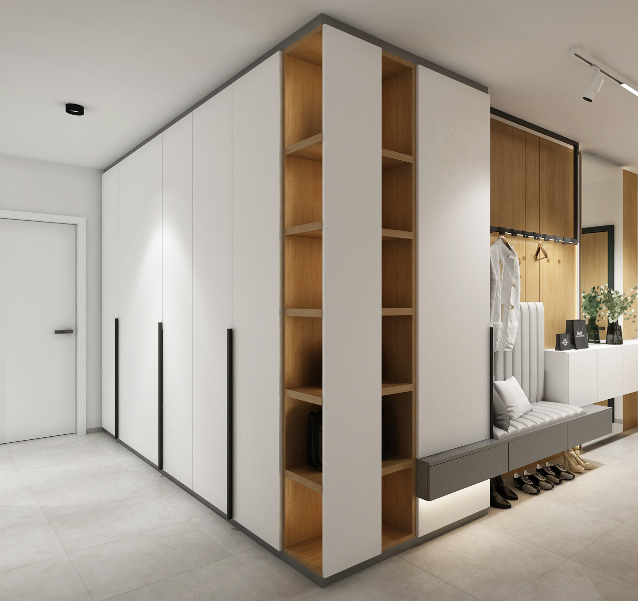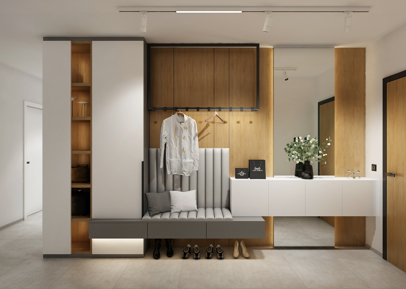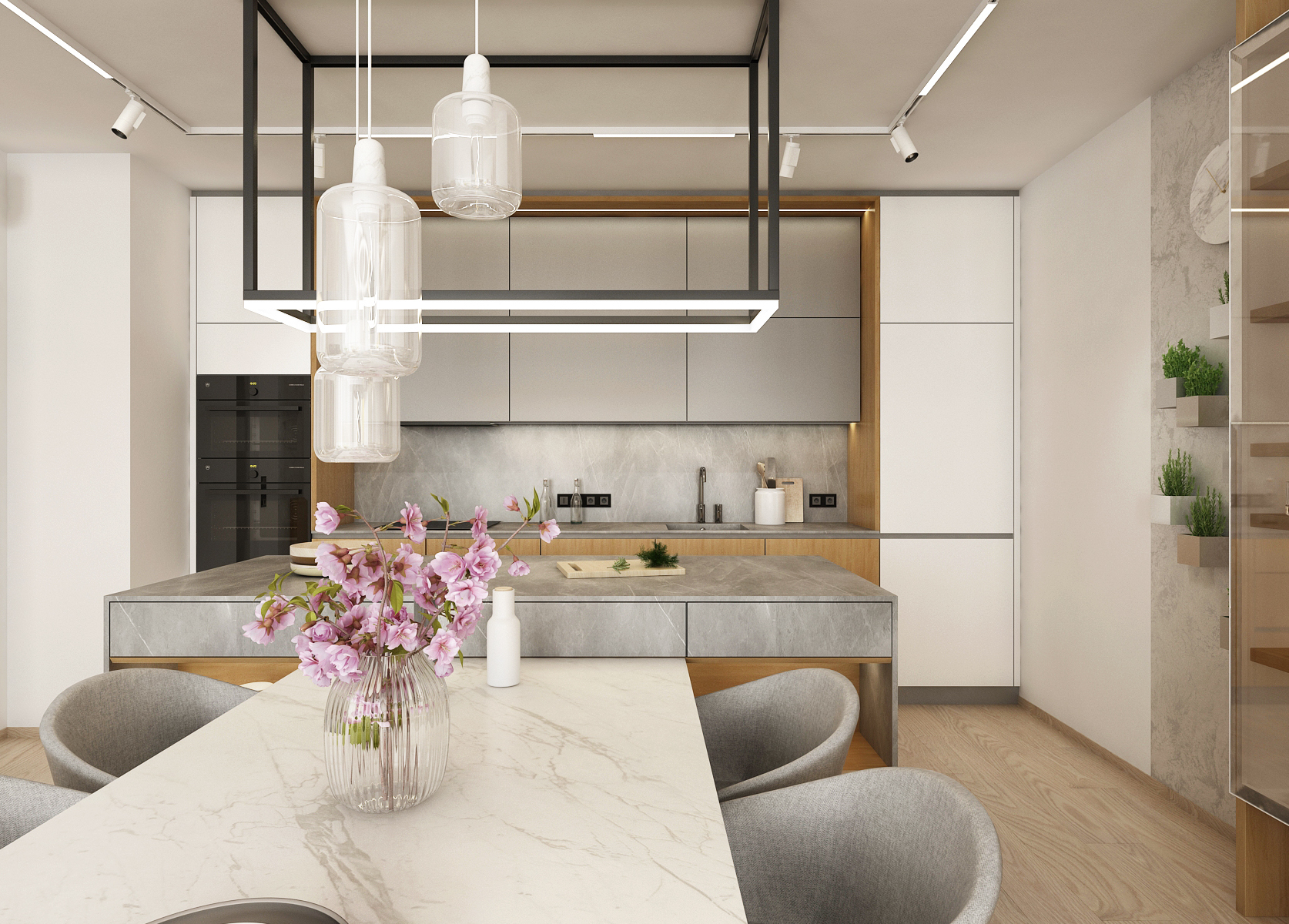 The living wall includes both lockable storage space and a spacious open bookcase on either side of the backlit workspace. The structured concrete screed that decorates the wall shines through behind the shelves. The part near the kitchen is enriched with wall-mounted flower pots.