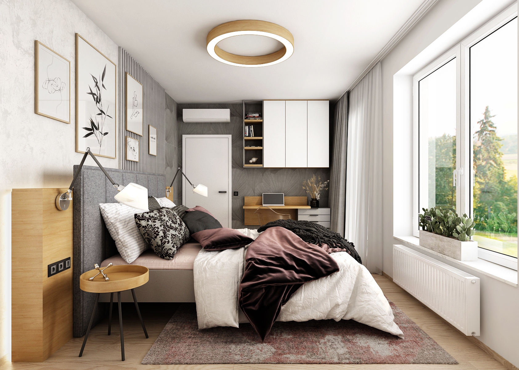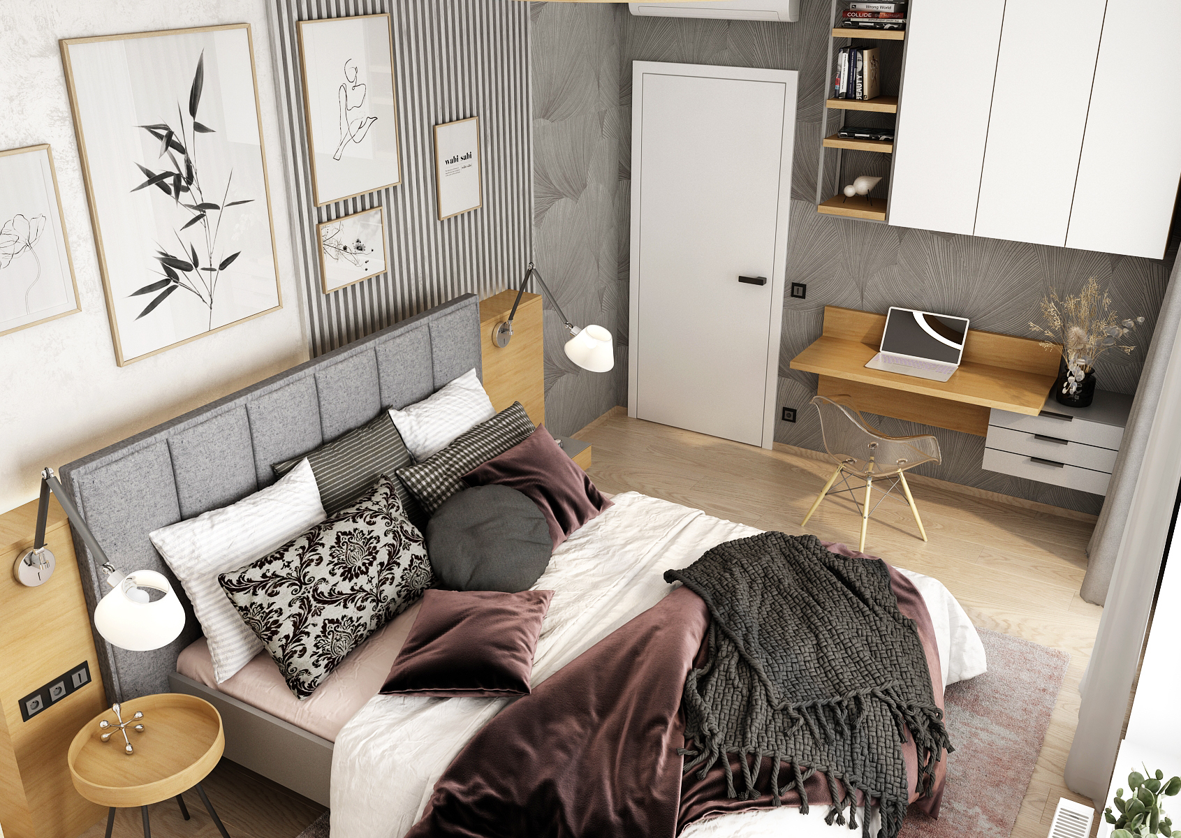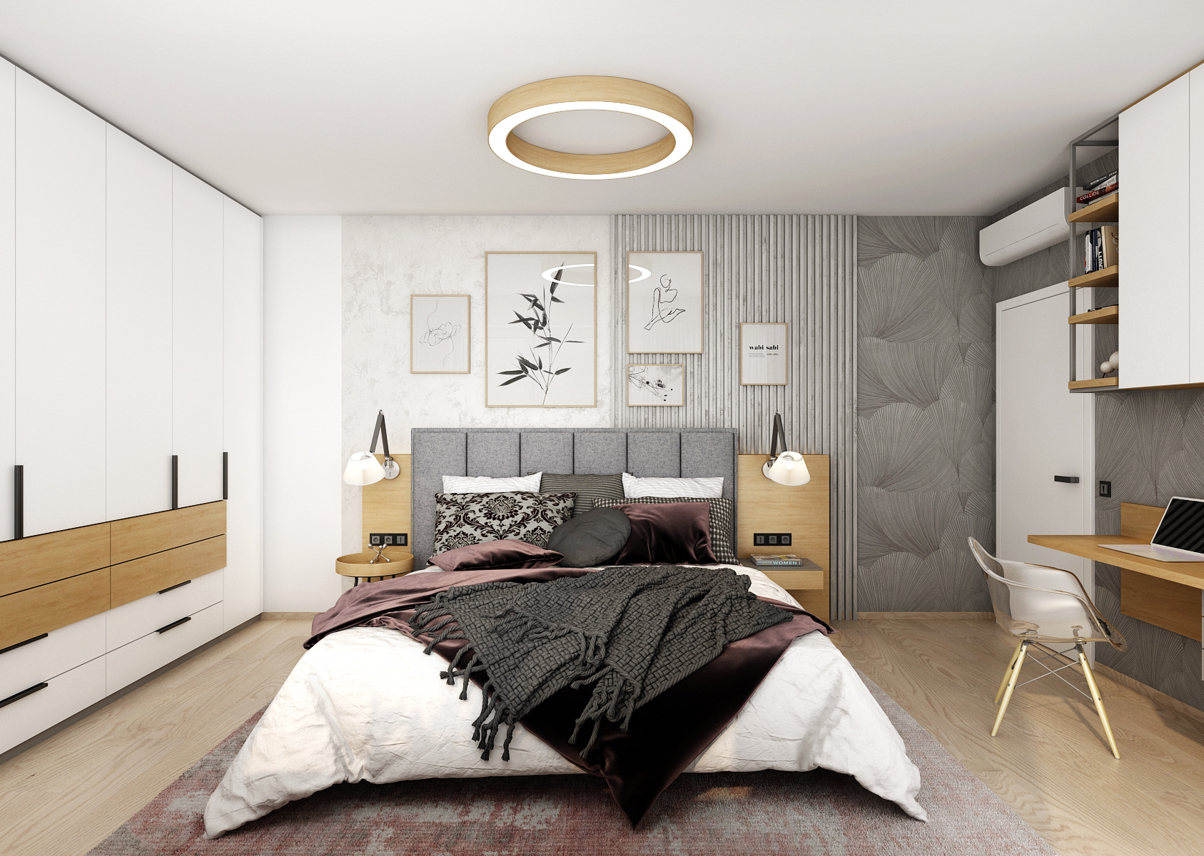 A cozy bedroom with a spacious upholstered bed is decorated with gray slats and concrete screeds in white. An interesting element is the wallpaper with a floral pattern, which is used on two walls, even behind the workplace. On the opposite side, there is a built-in white wardrobe with black details and oak wood decor.