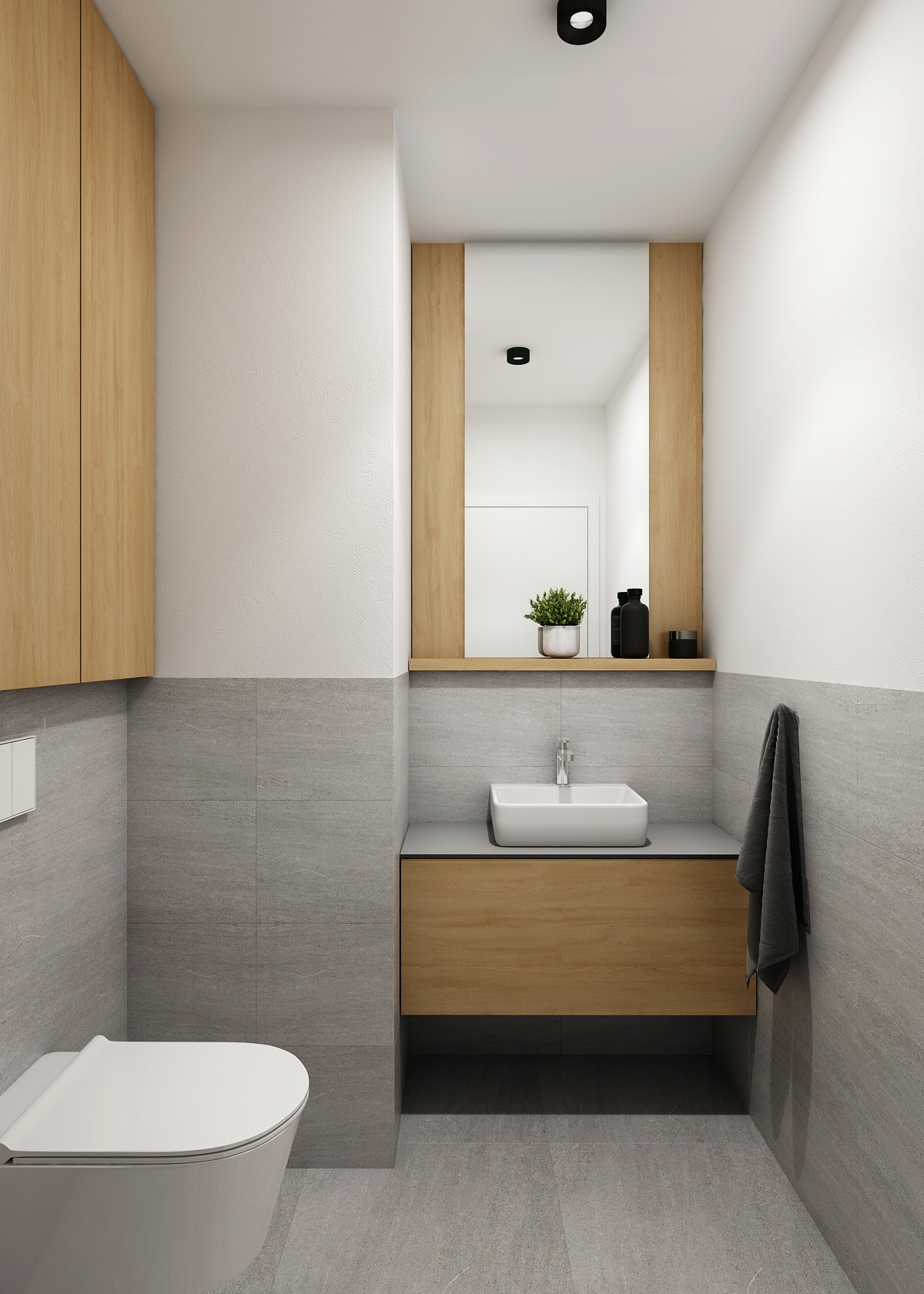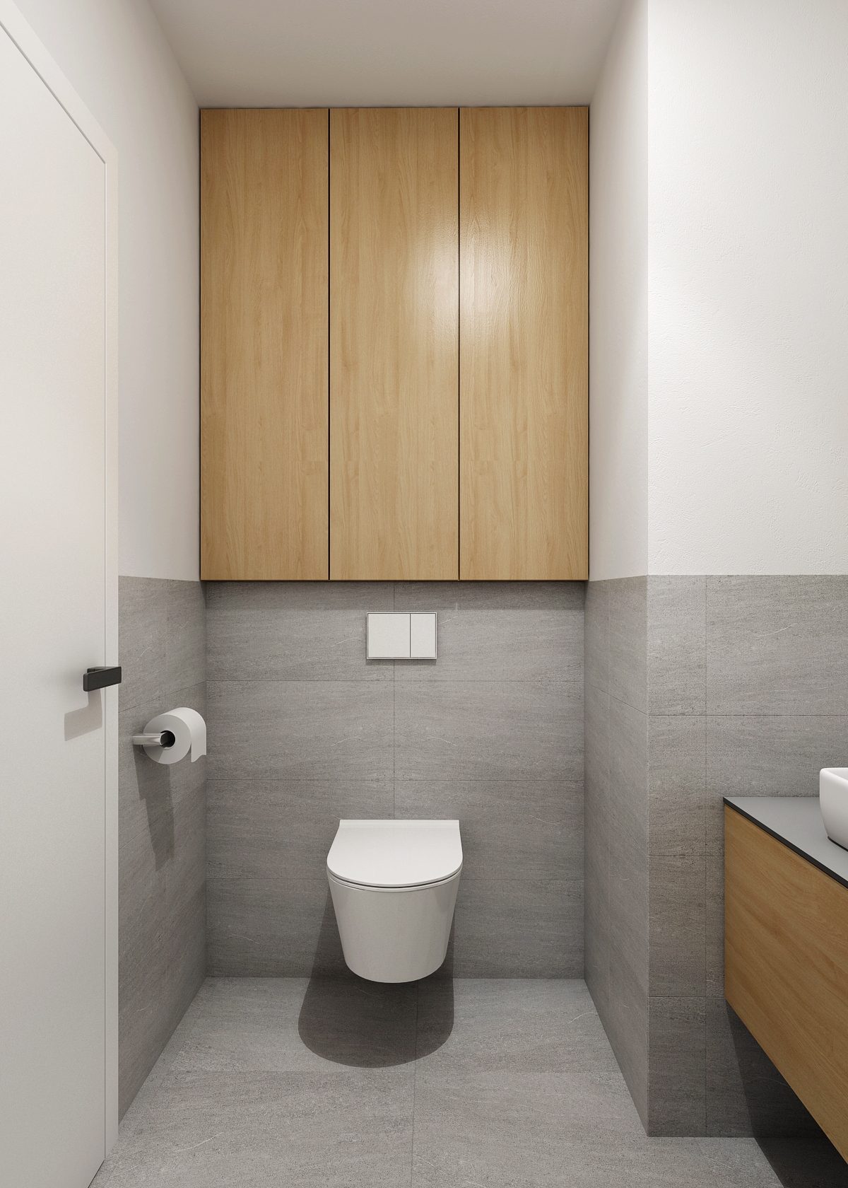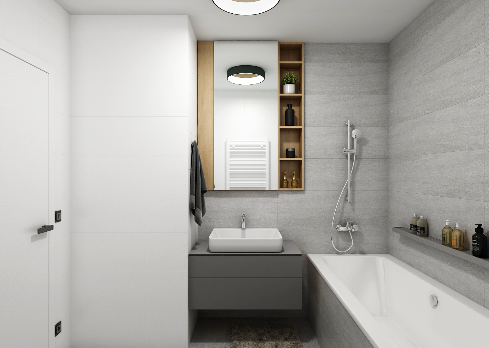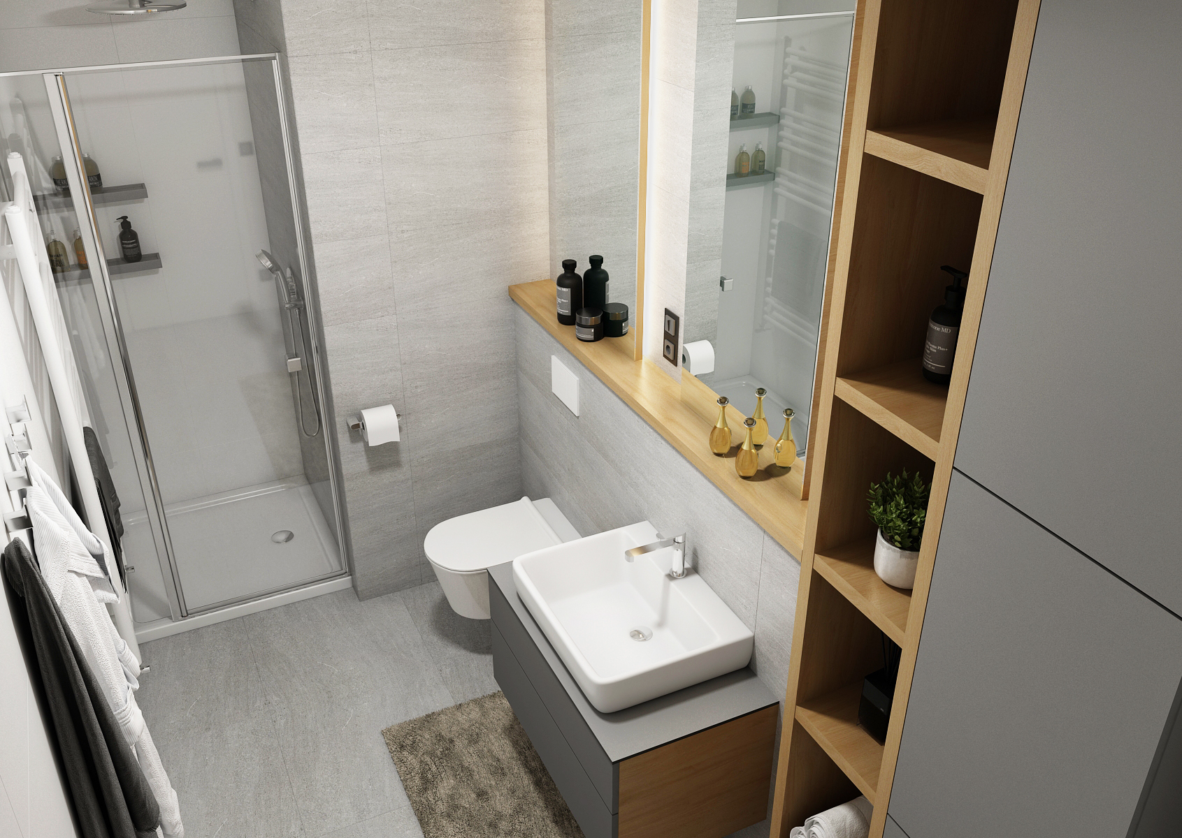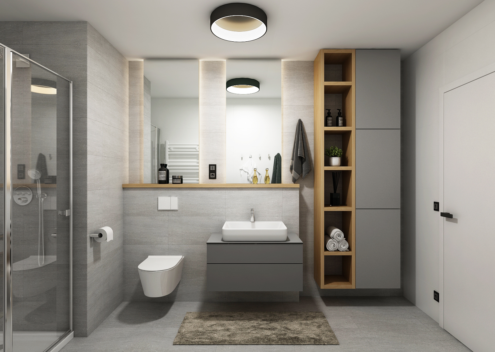 The larger and smaller bathroom with a separate toilet are matched in gray, thanks to the large-format tiles and tiles with a slight annealing. Thanks to gray and white, even the oak wood stands out on the furniture elements. An important part of the apartment is also a rooftop seating area with a shelter providing a wonderful view of the city.