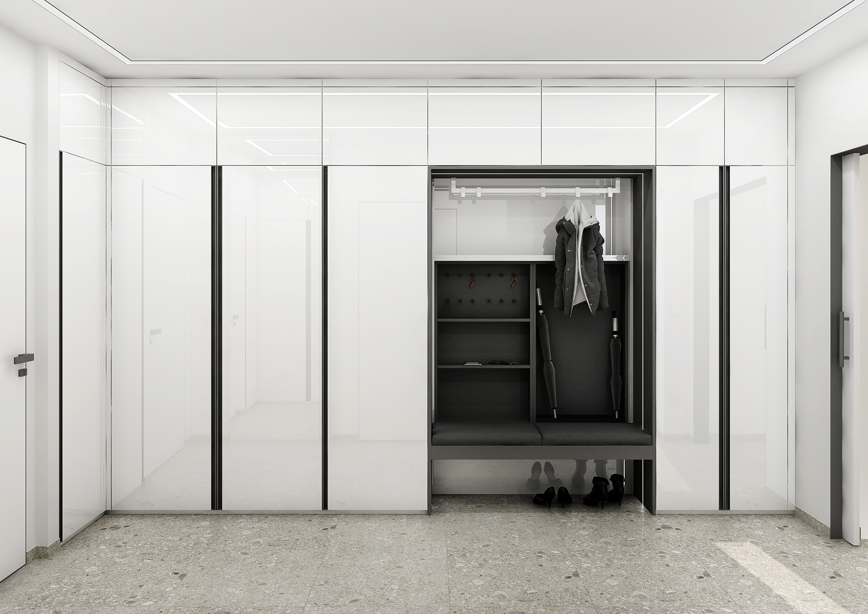 We focused here on the combination of virgin white color on the furniture elements, which makes the space properly lit and airy, with anthracite accessories. Spacious built-in wardrobes, which replace a separate dressing room, offer both a hanger section and drawers and shelving cabinets.