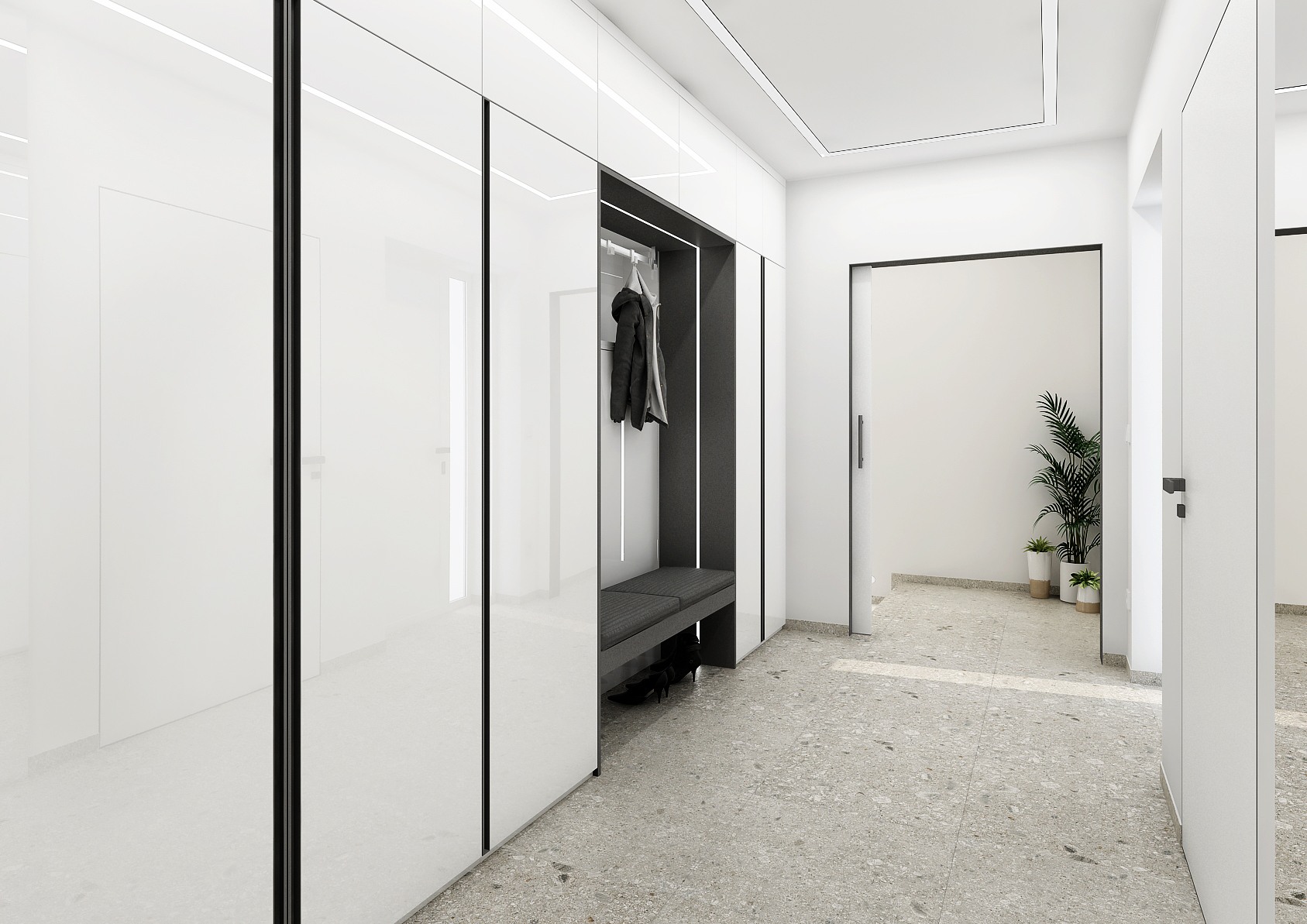 Ceramic paving, composed of tiles of size 60x60 with Teraco texture, does not disturb the design with numerous joints and looks very unified. A really interesting element here is also the unlined door with a built-in aluminum frame in the wall, thanks to which the interior looks sleek.