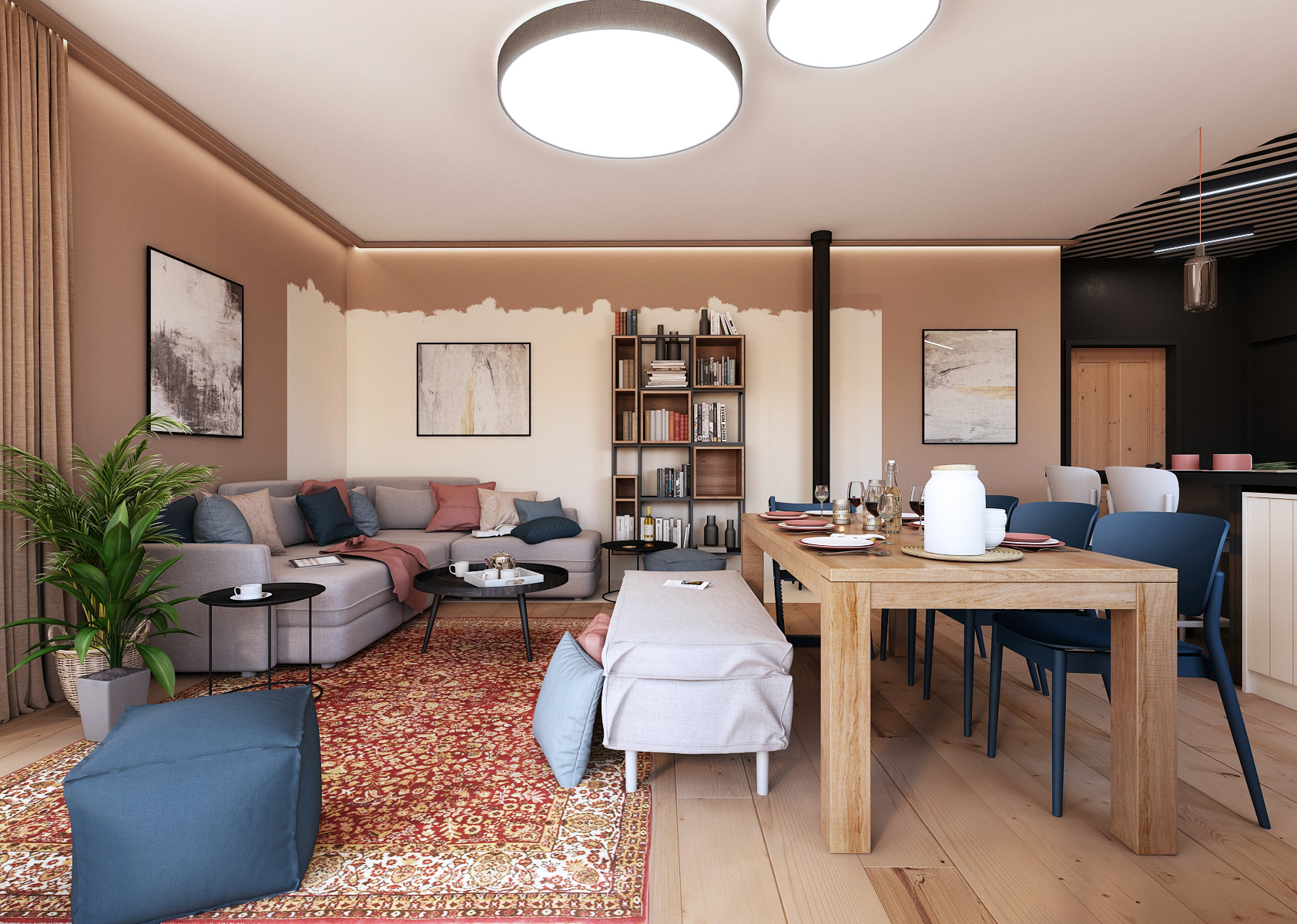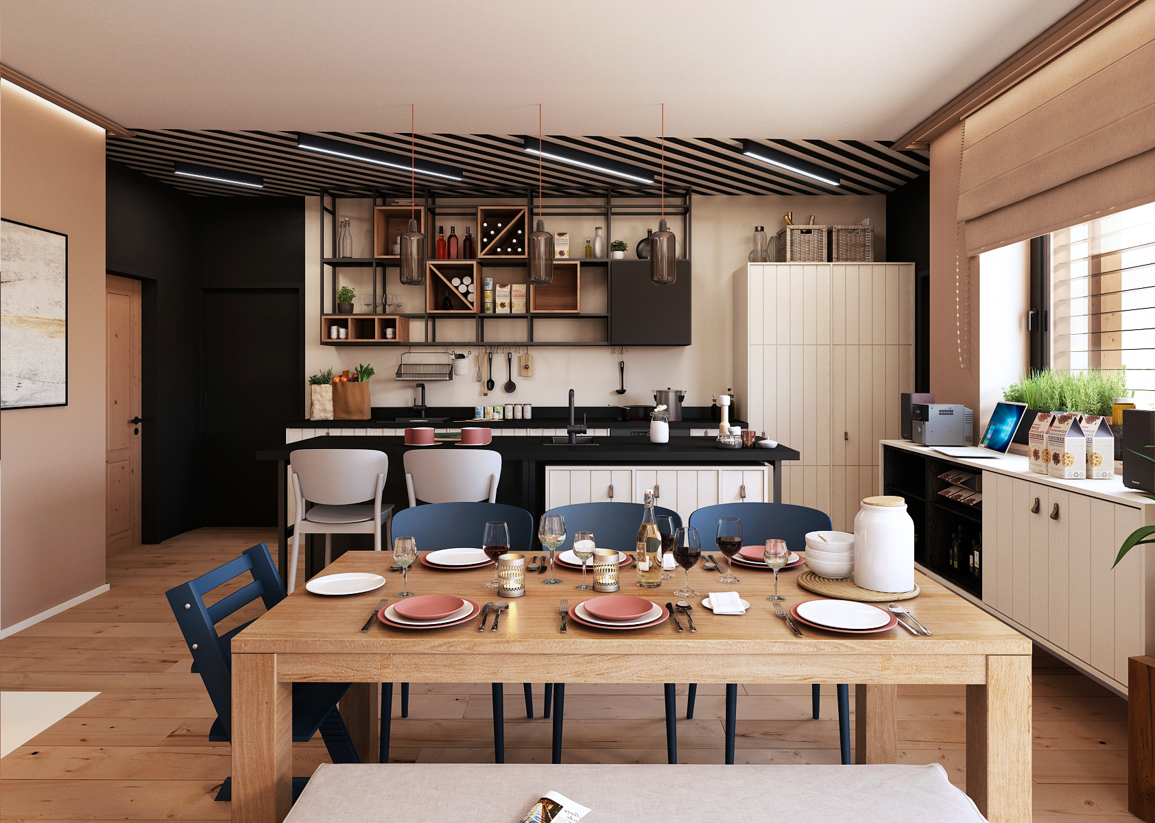 The family house in an eclectic style is tuned to beige tones with blue elements with contrasting white and black kitchen.
