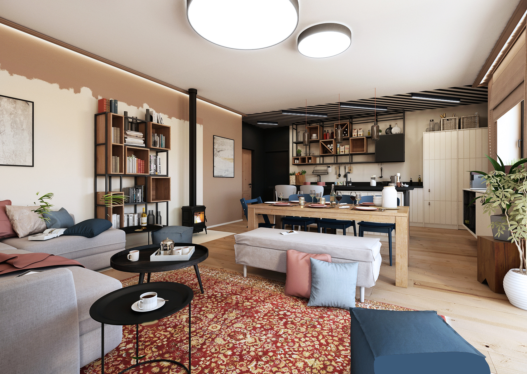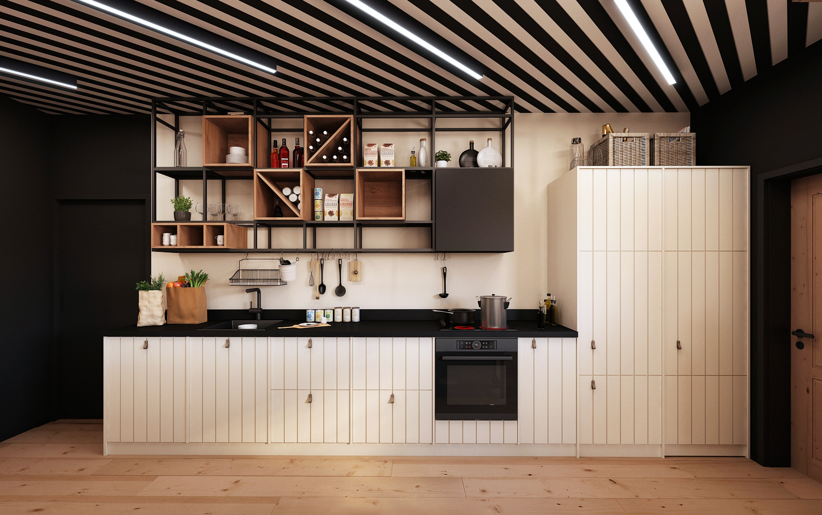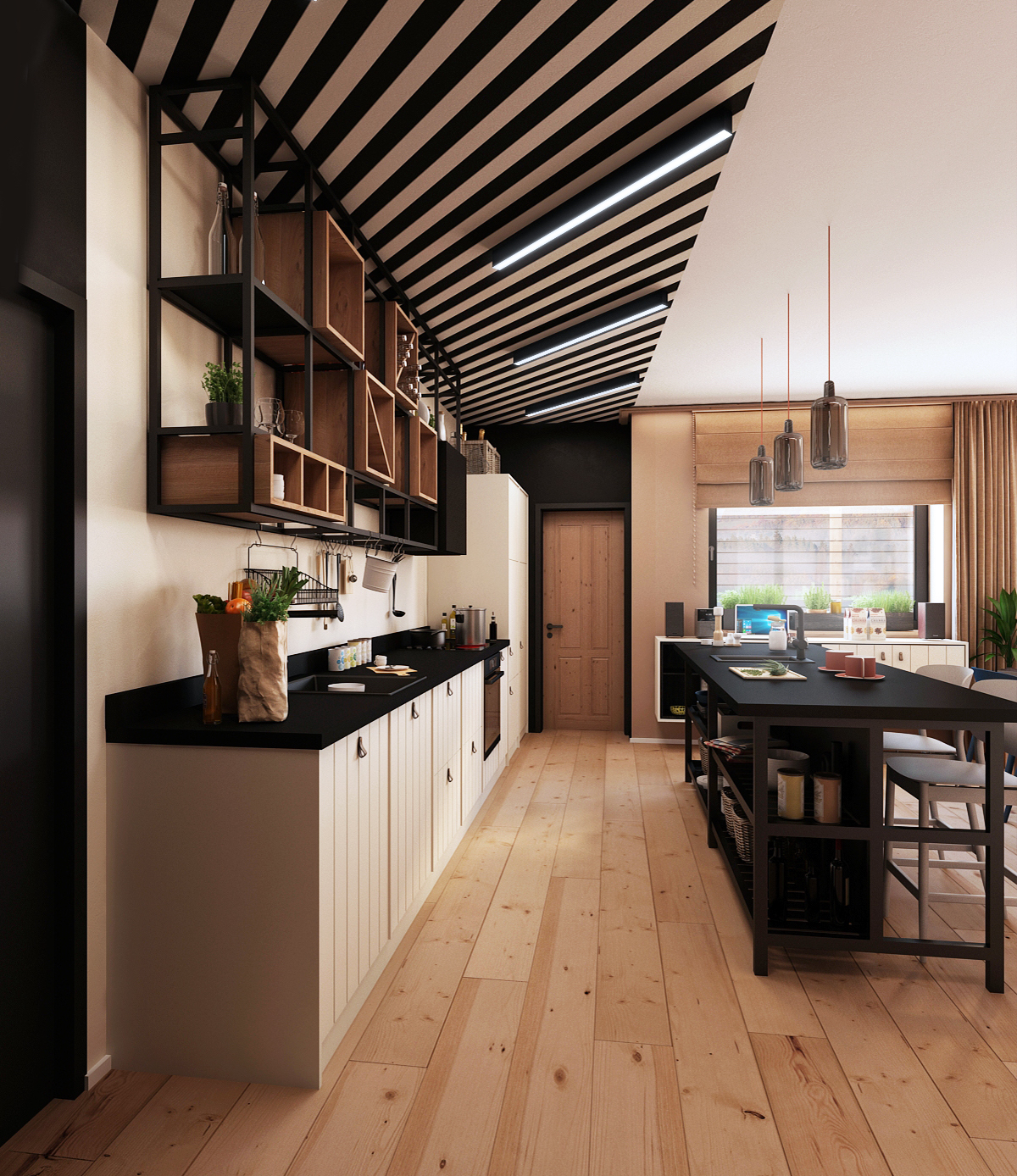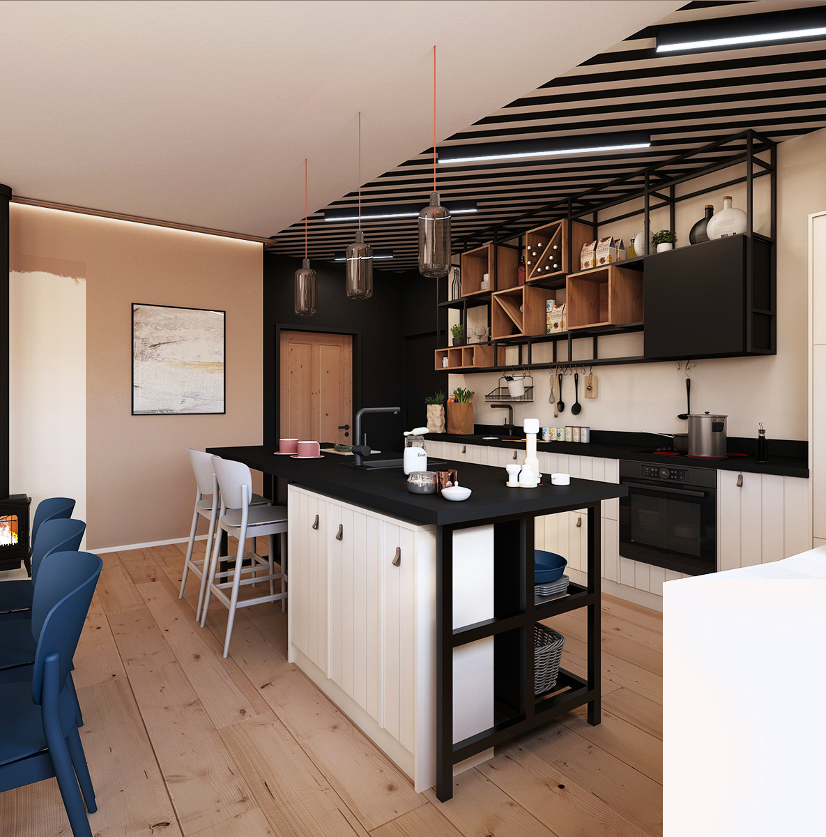 The spacious kitchen with kitchen island is visually separated from the living room and dining room by a patterned concrete ceiling. The direction of the stripes is followed by light strips, which does not disturb the design. The kitchen also offers plenty of storage space, either in the cabinets themselves or in a wall-mounted shelf that replaces the top cabinets.