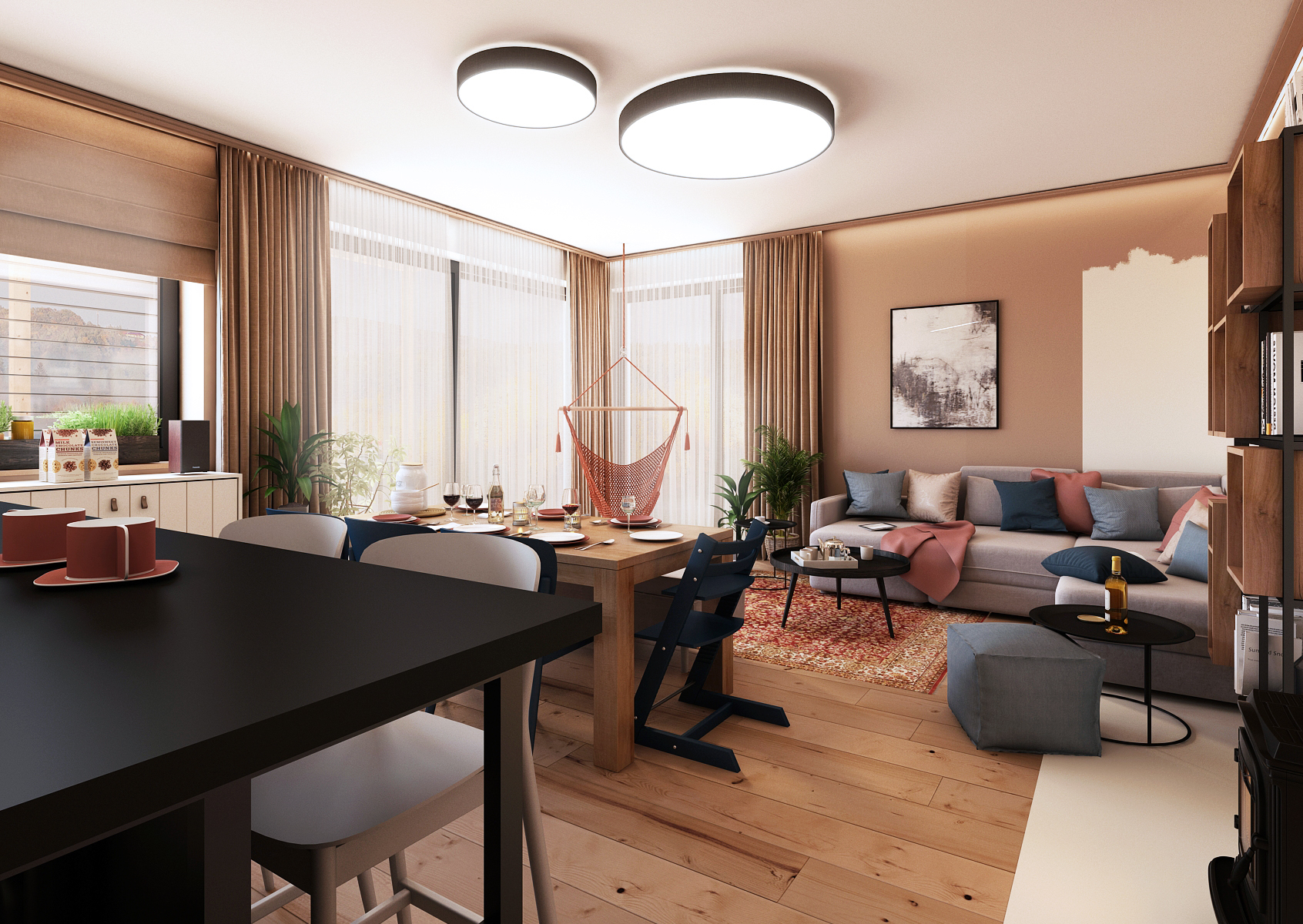 The living room with dining area is dominated by a corner sofa and a solid wooden table. The beige-white painting is finished with ceiling moldings, which ensure a smooth transition between the walls and the concrete ceiling.