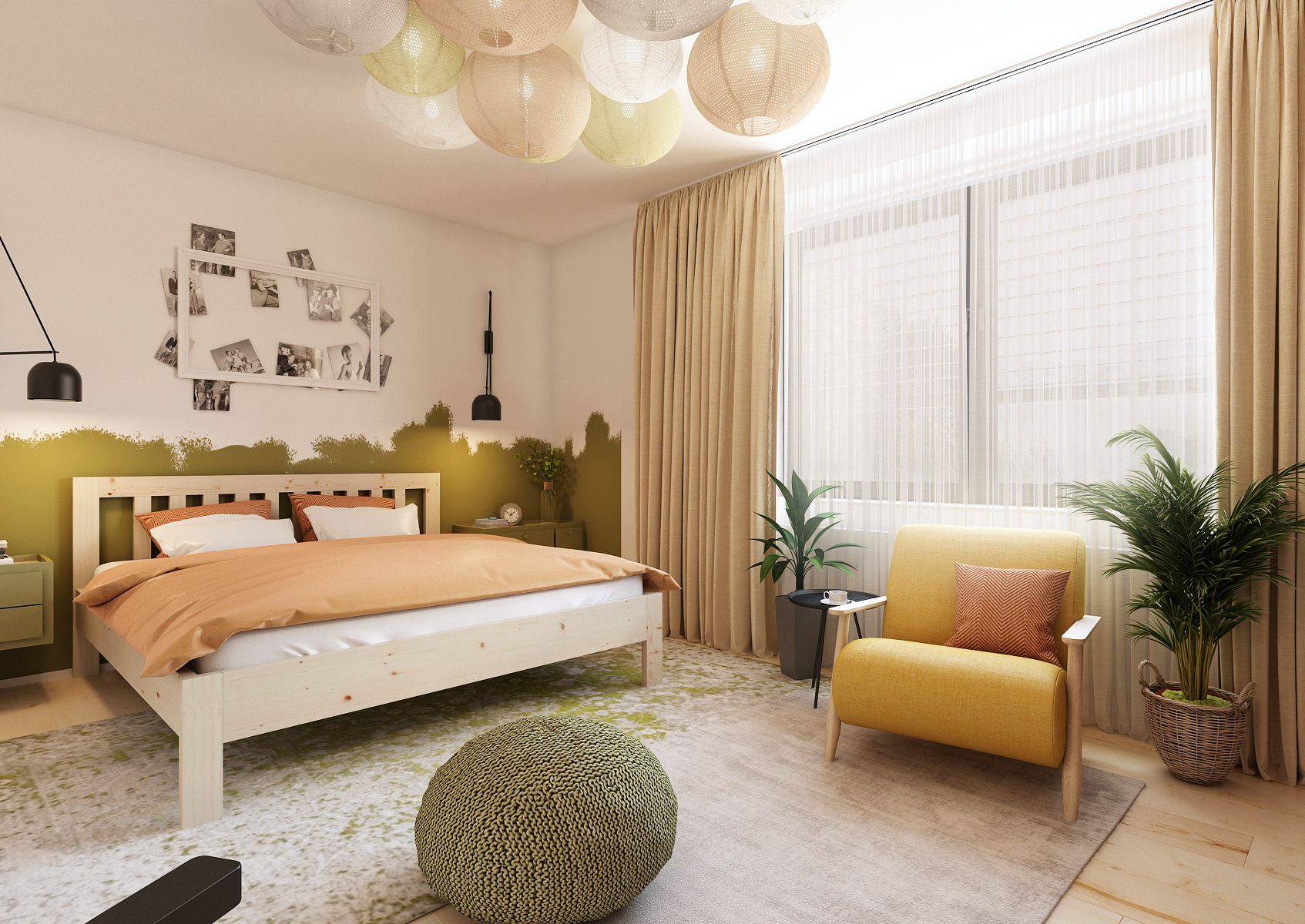 The simple color bedroom is designed in a natural style, dominated by shades of green with an accent of yellow. Solid ash wood is used not only for the floor and doors, but also for the construction of the bed, which thanks to that fits perfectly into the chosen design. Around the bed, the wall is provided with a green paint by means of blunting, which creates the impression of a grassy landscape. Furniture elements, such as a bedside table or stool, are also harmonized in green. Of interest here is the lighting in the form of several colored lanterns hanging from the ceiling.