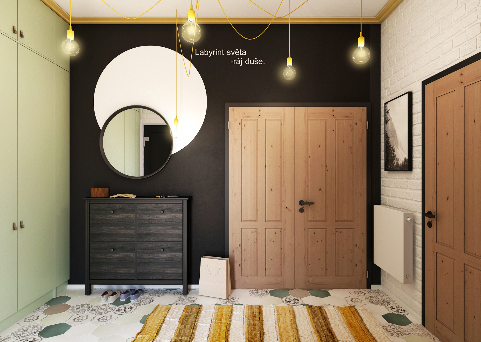 The distinctive yellow bathroom in combination with the green one boasts an interesting mosaic, which changes from paving to tiling around the bathtub. The colors here are balanced by white and black elements.