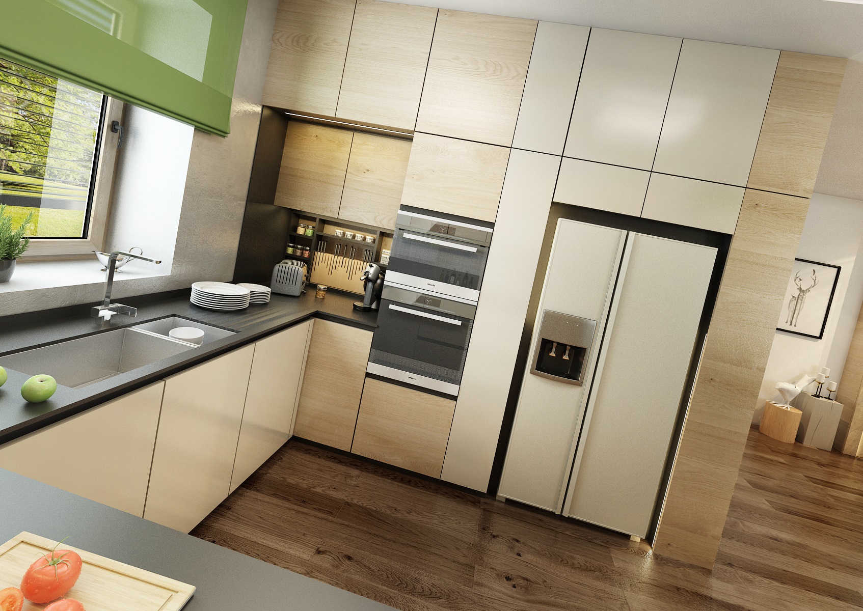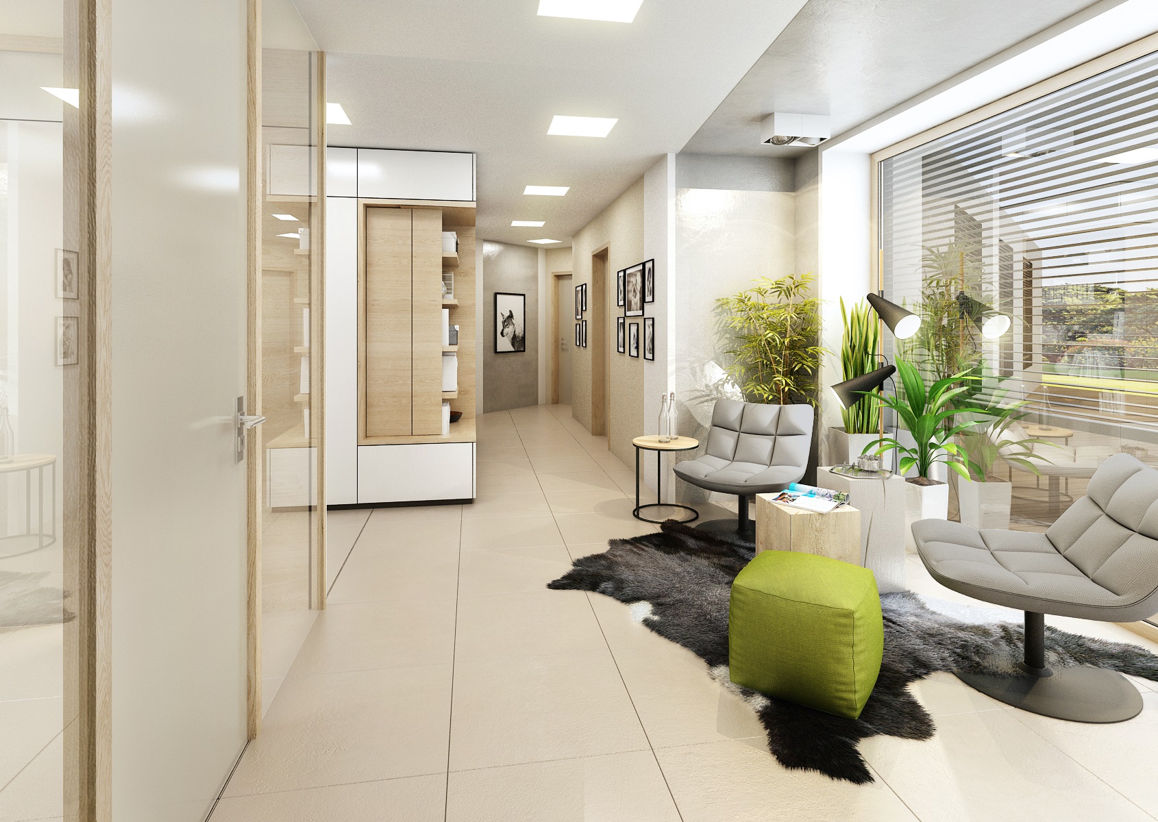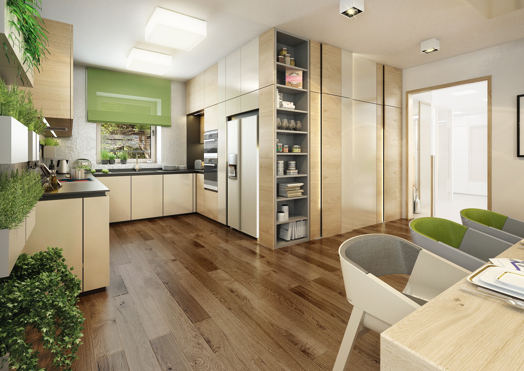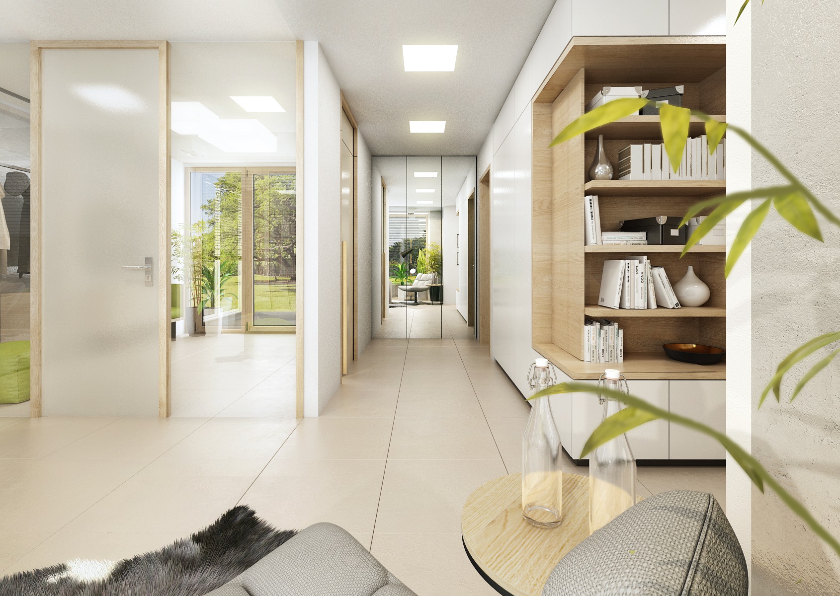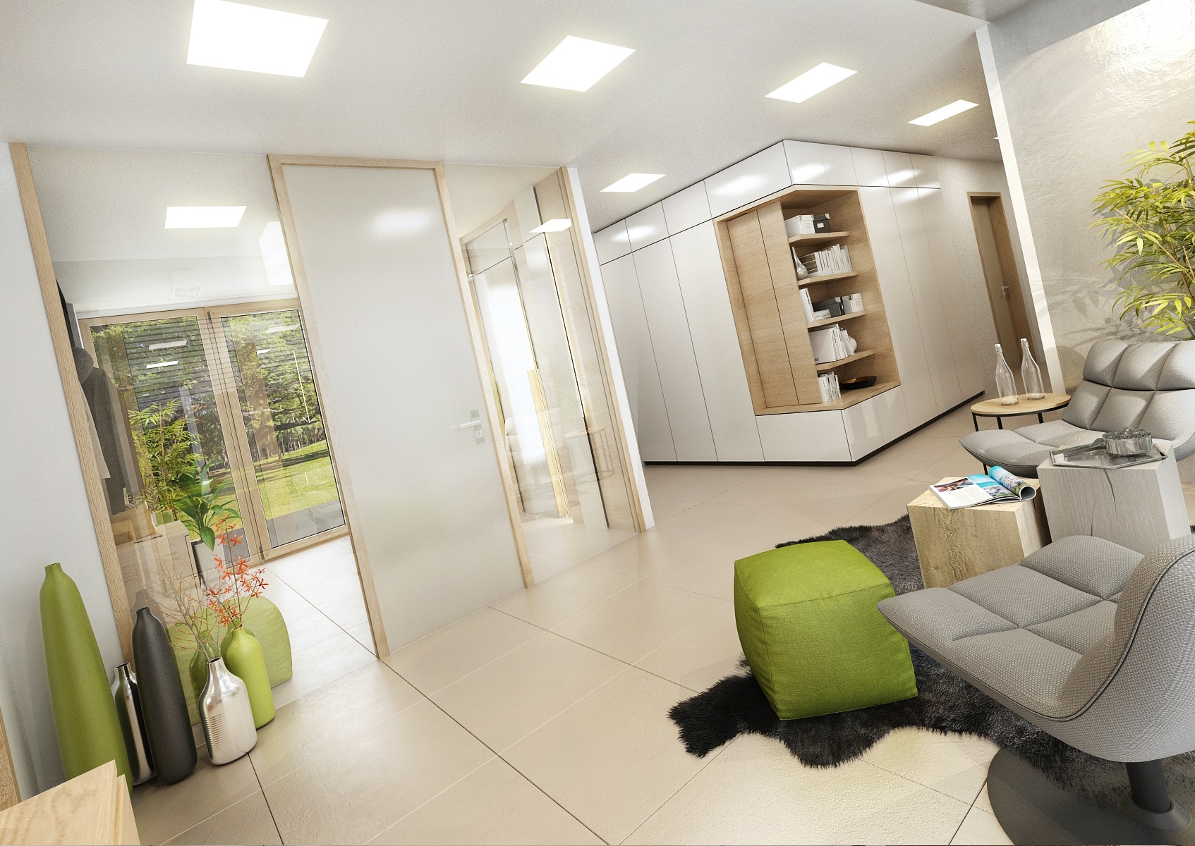 The owners wanted to incorporate enough greenery for the interior design of a house in Vysočina and we adapted the chosen color scheme.The choice fell on white, netral gray, earthy sand and brown color, natural green and oak wood decor (on furniture light oak Sorano and in contrast dark tabacco oak on the floor). The green color can be seen on the upholstered chairs and sofa, carpet or window roller. In the bedroom, for a change, the interior was harmonized in a kerosene color. We didn't even forget about the sufficency flowers and wall planters.