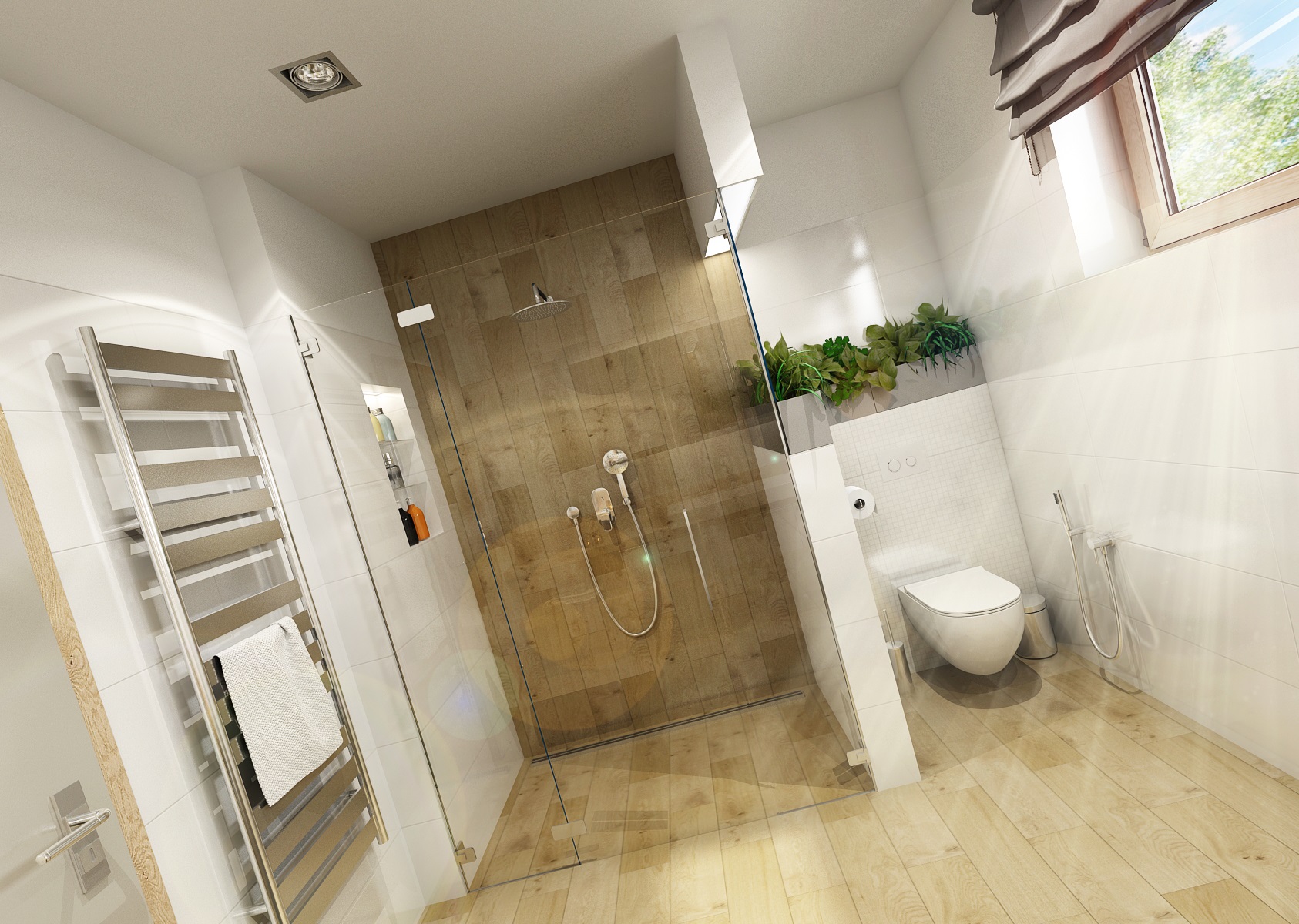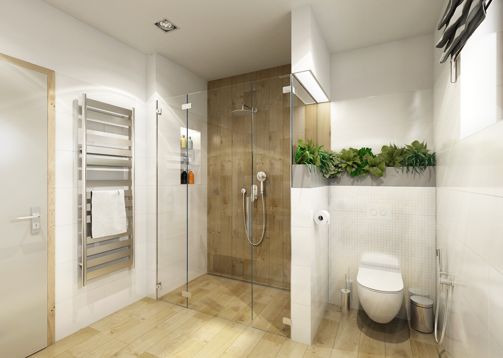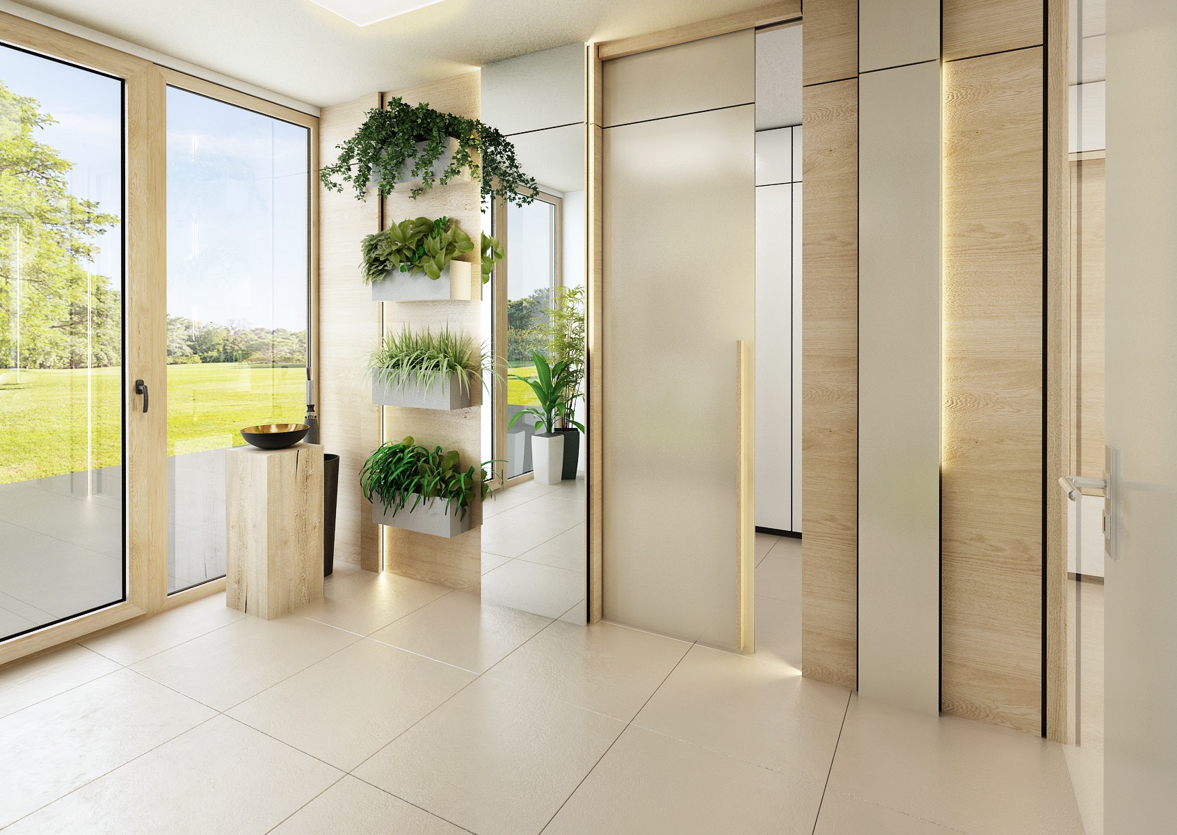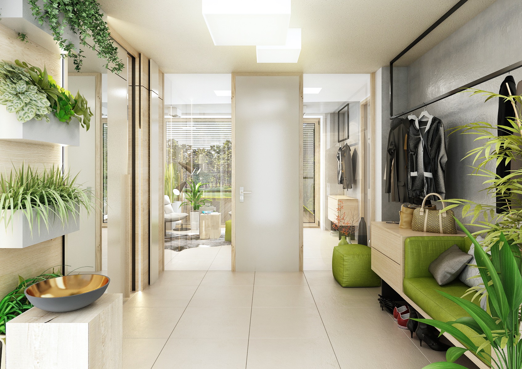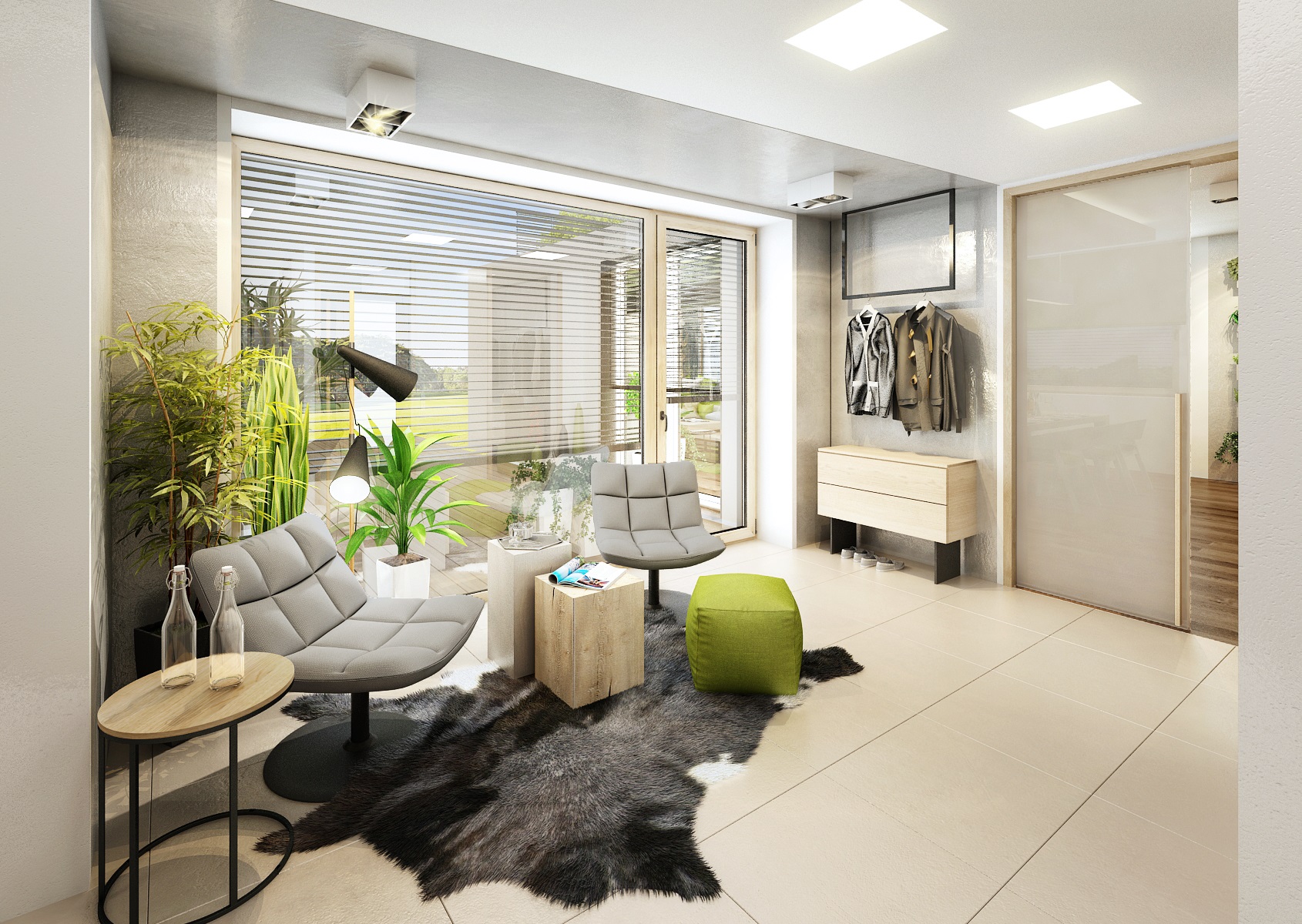 The owners wanted to incorporate enough greenery for the interior design of a house in Vysočina and we adapted the chosen color scheme.The choice fell on white, netral gray, earthy sand and brown color, natural green and oak wood decor (on furniture light oak Sorano and in contrast dark tabacco oak on the floor). The green color can be seen on the upholstered chairs and sofa, carpet or window roller. In the bedroom, for a change, the interior was harmonized in a kerosene color. We didn't even forget about the sufficency flowers and wall planters.