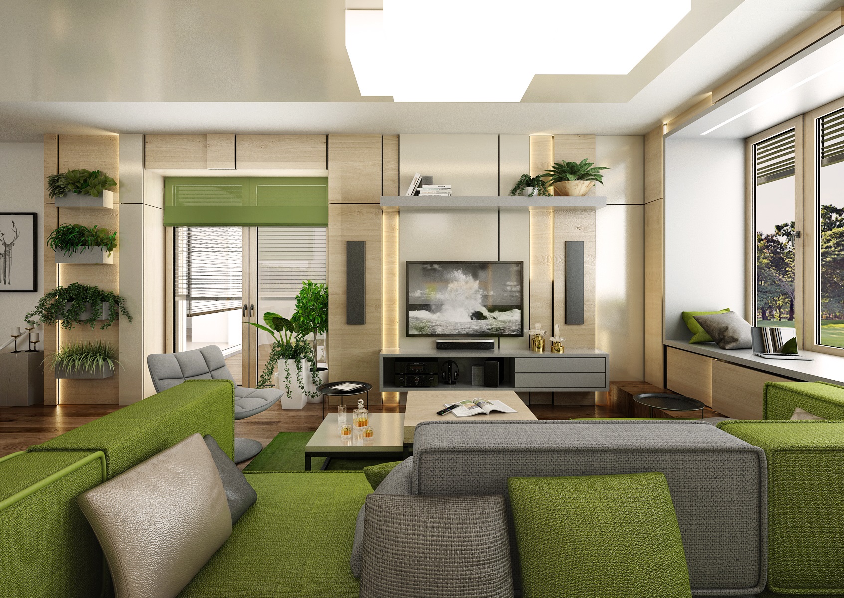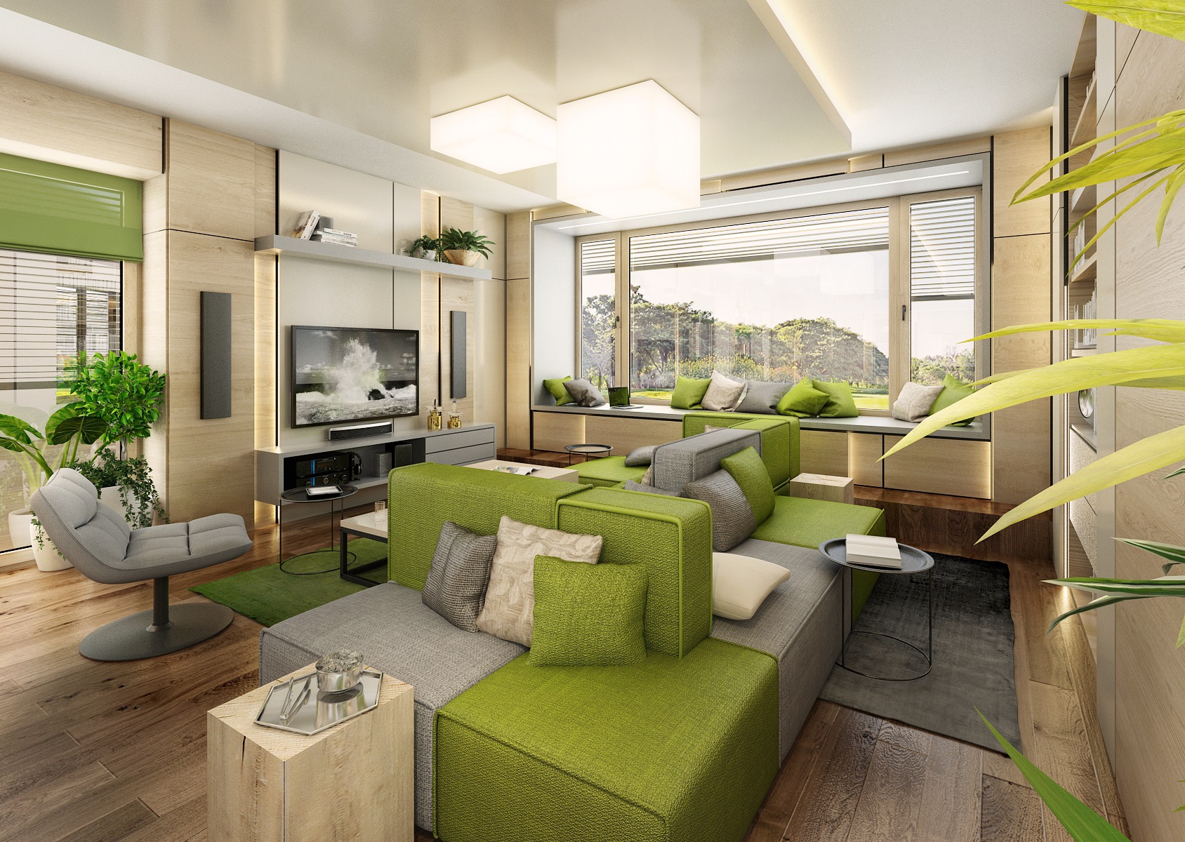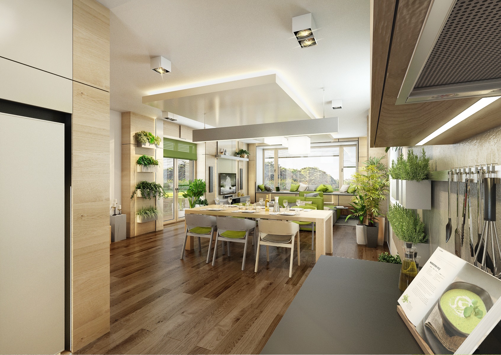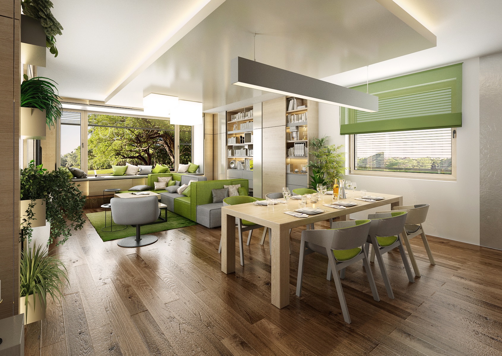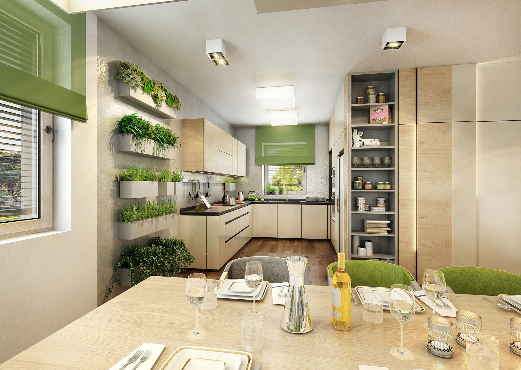 The owners wanted to incorporate enough greenery for the interior design of a house in Vysočina and we adapted the chosen color scheme.The choice fell on white, netral gray, earthy sand and brown color, natural green and oak wood decor (on furniture light oak Sorano and in contrast dark tabacco oak on the floor). The green color can be seen on the upholstered chairs and sofa, carpet or window roller. In the bedroom, for a change, the interior was harmonized in a kerosene color. We didn't even forget about the sufficency flowers and wall planters.