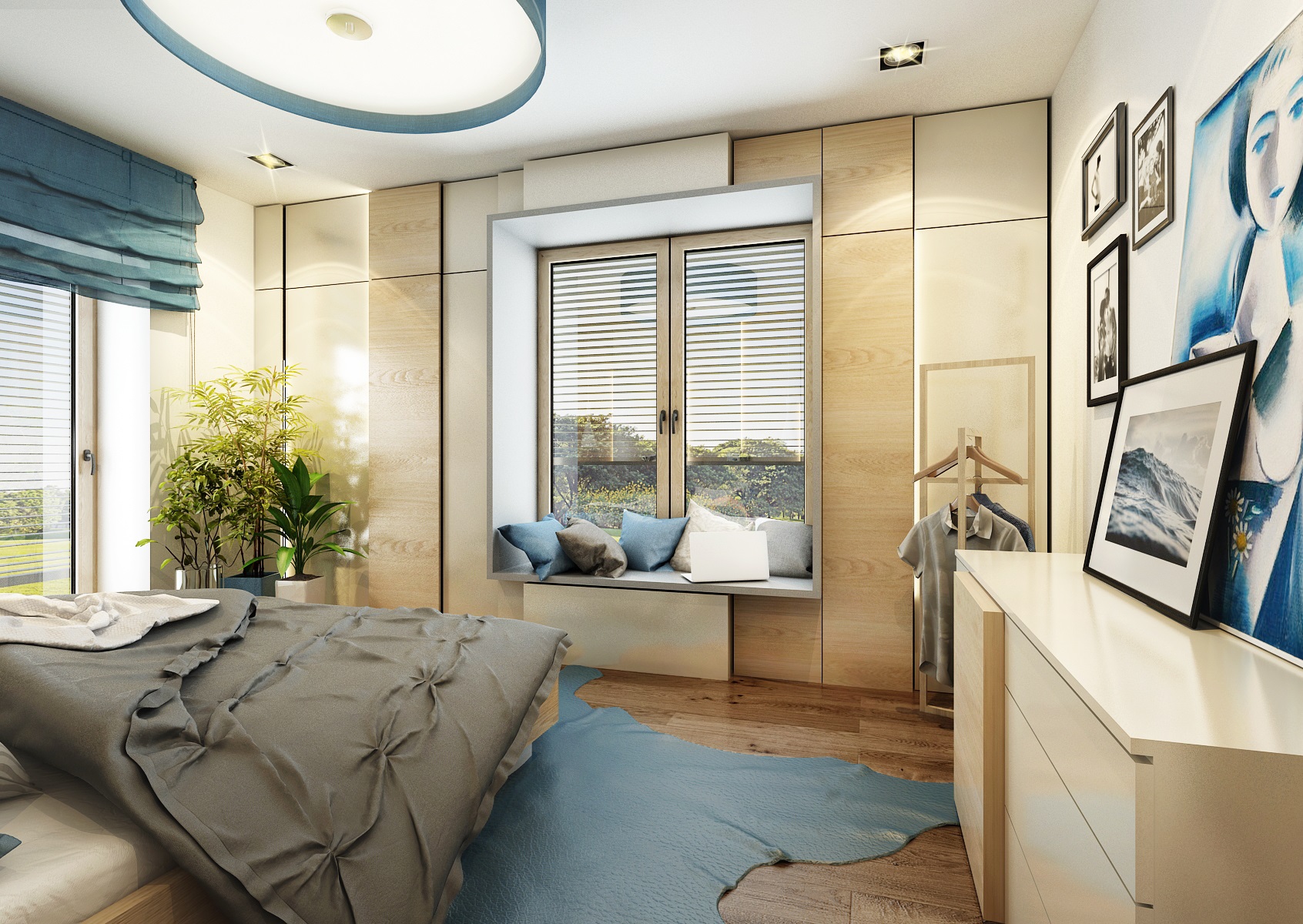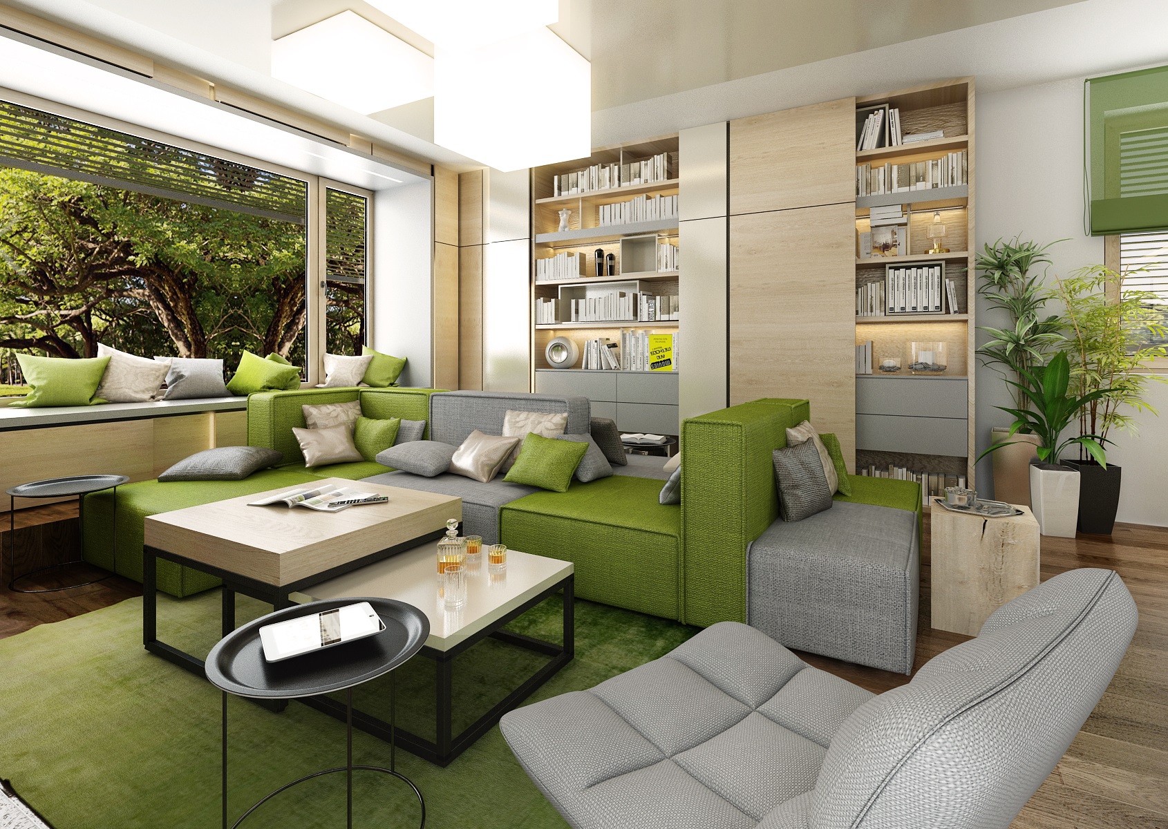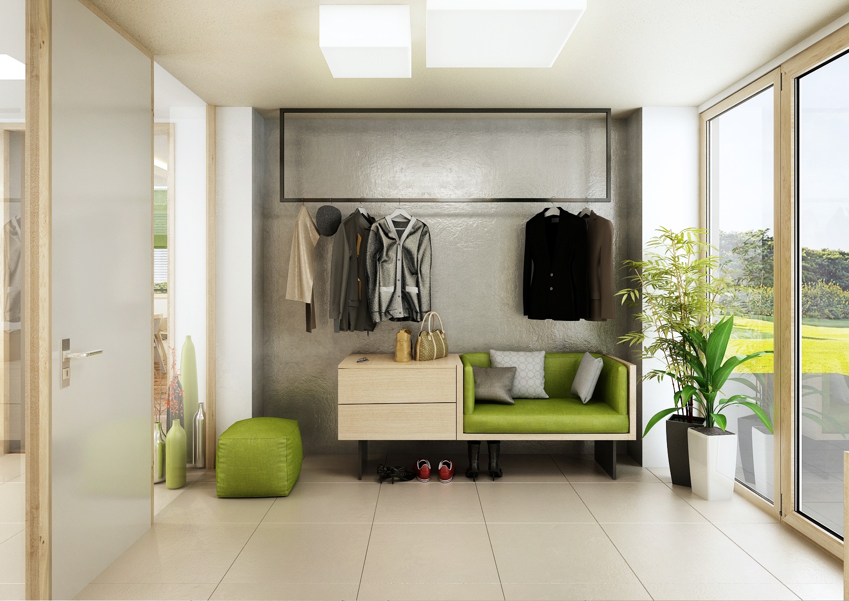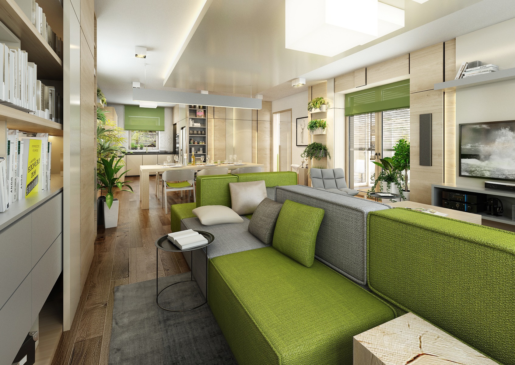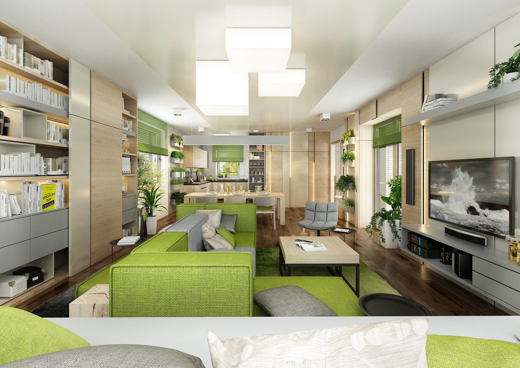 The owners wanted to incorporate enough greenery for the interior design of a house in Vysočina and we adapted the chosen color scheme.The choice fell on white, netral gray, earthy sand and brown color, natural green and oak wood decor (on furniture light oak Sorano and in contrast dark tabacco oak on the floor). The green color can be seen on the upholstered chairs and sofa, carpet or window roller. In the bedroom, for a change, the interior was harmonized in a kerosene color. We didn't even forget about the sufficency flowers and wall planters.