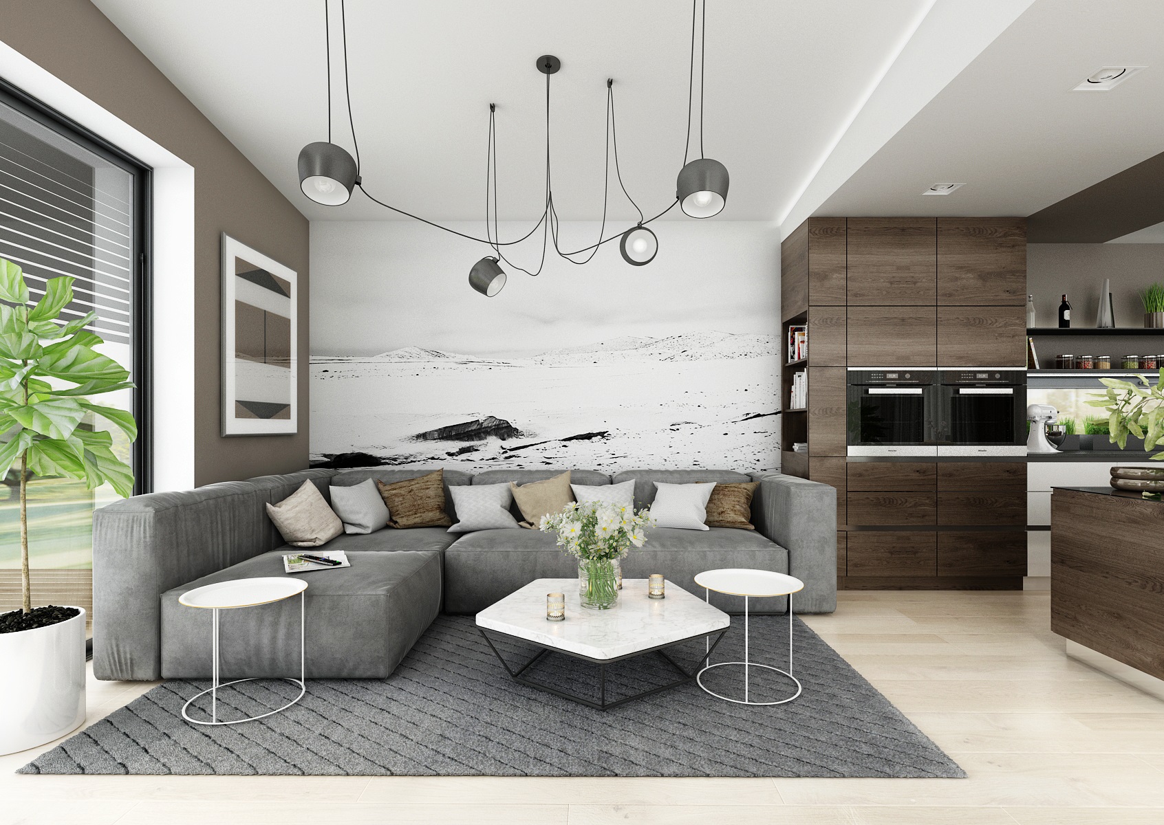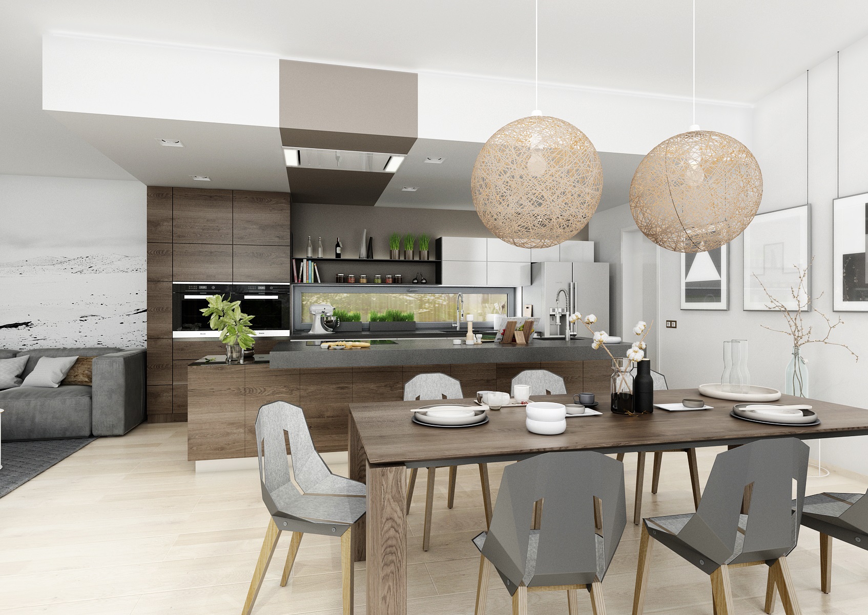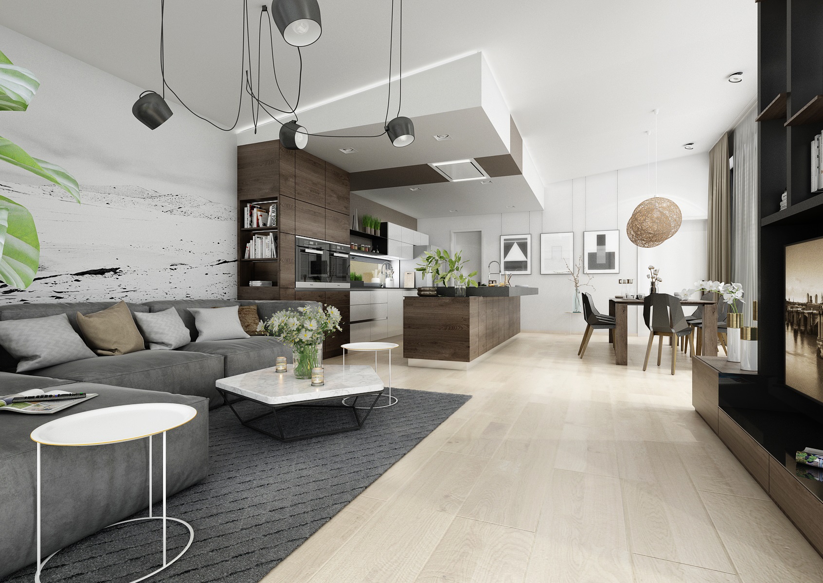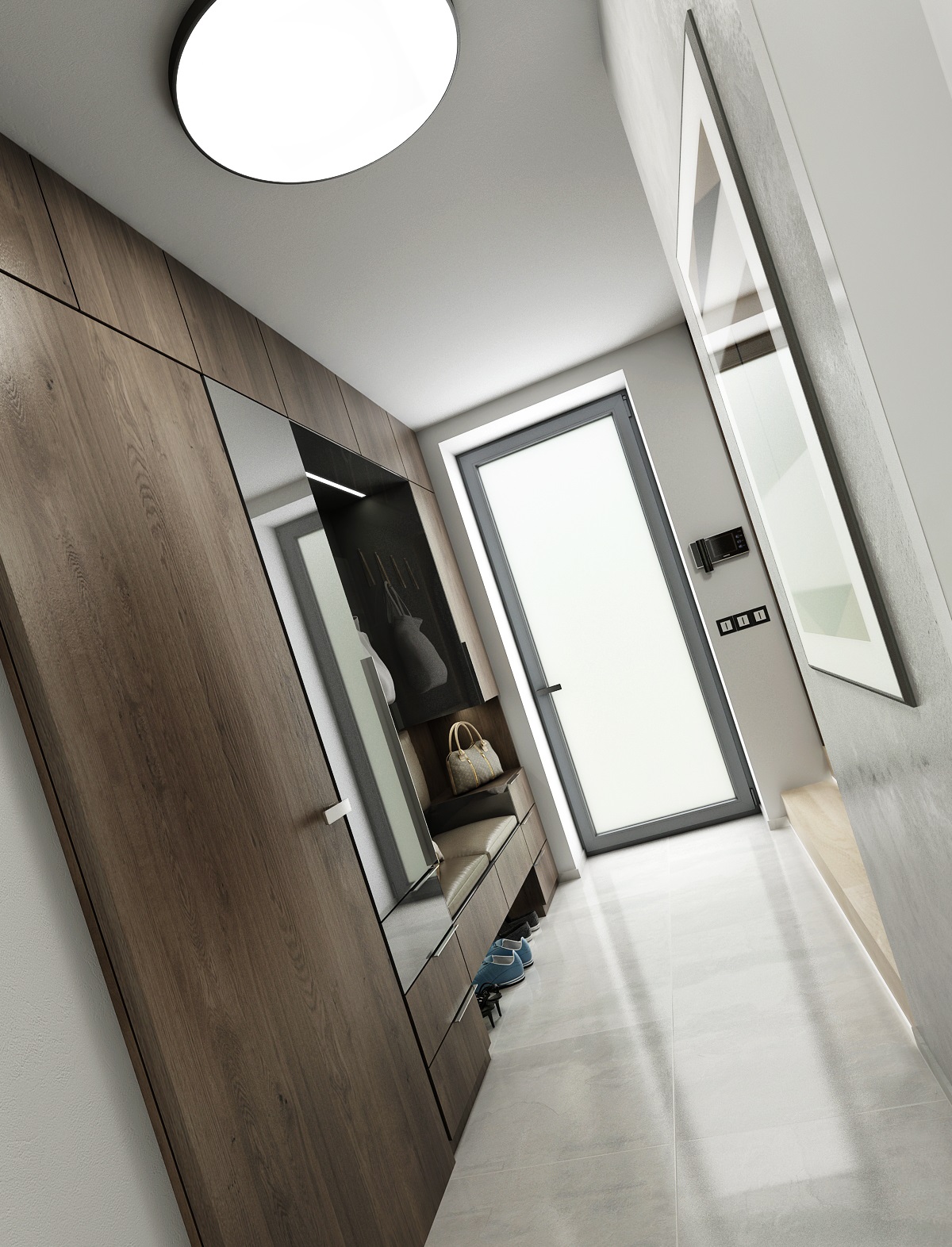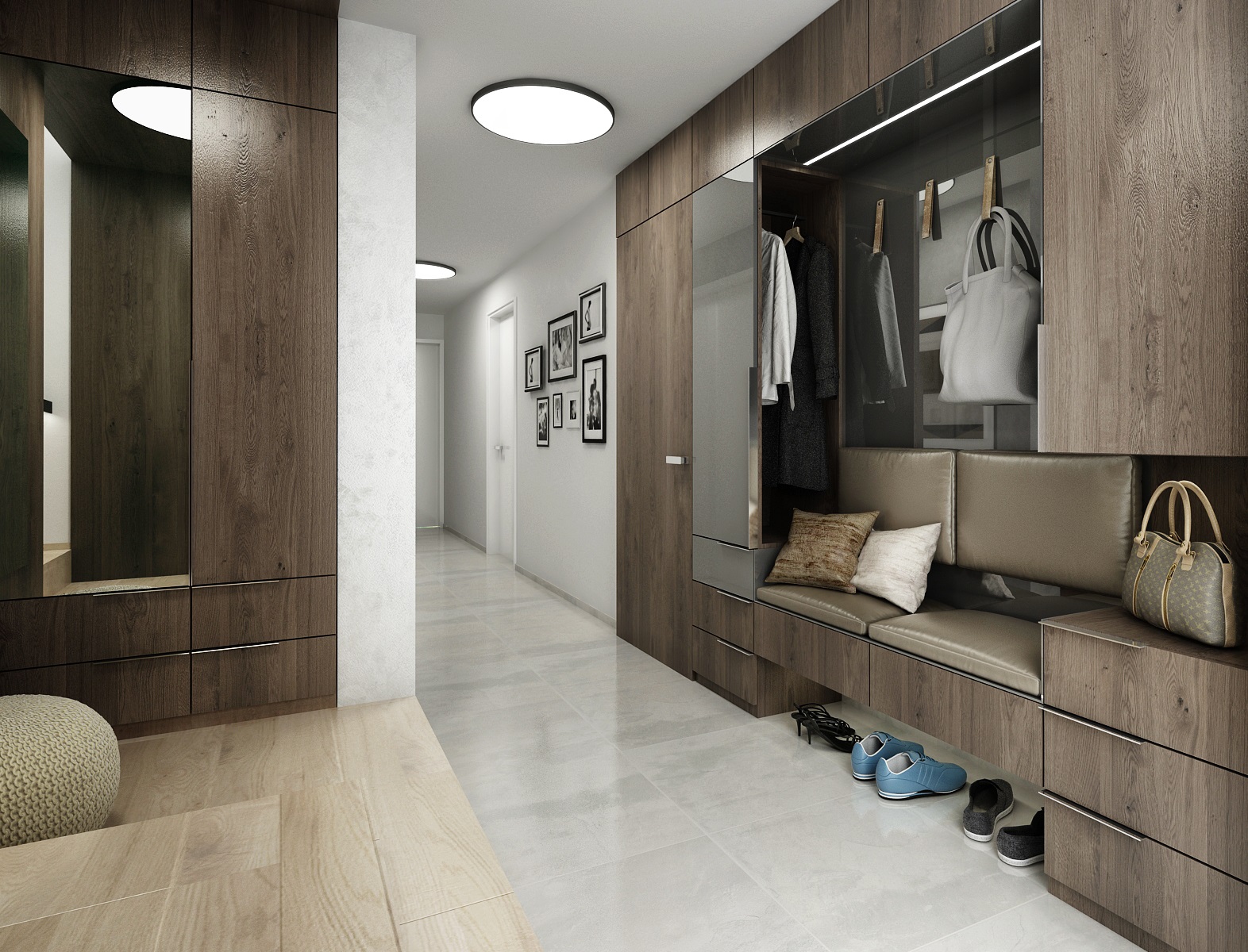 The floors were chosen in light tones in comparison to the dark veneer on the furniture - the matt finish of smoky oak. The color is complemented with anthracit and white LTD. An interesting combination of the use of smoke glass and mirrors on some furniture surfaces.