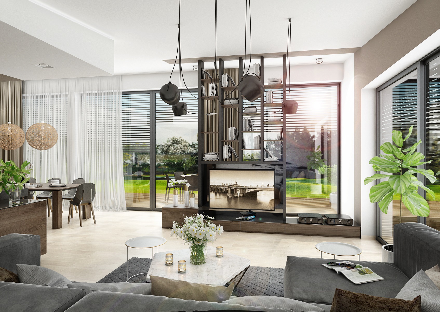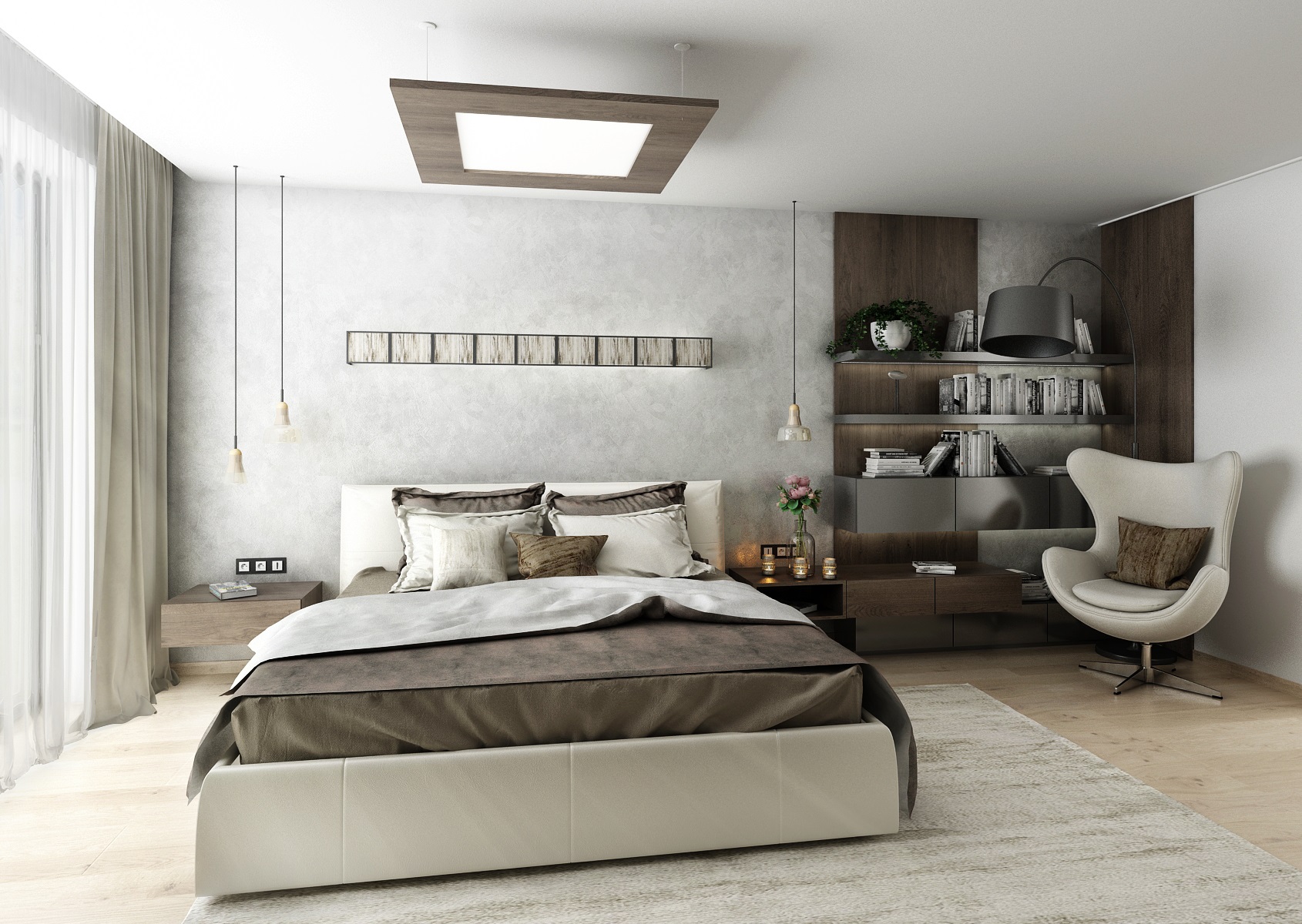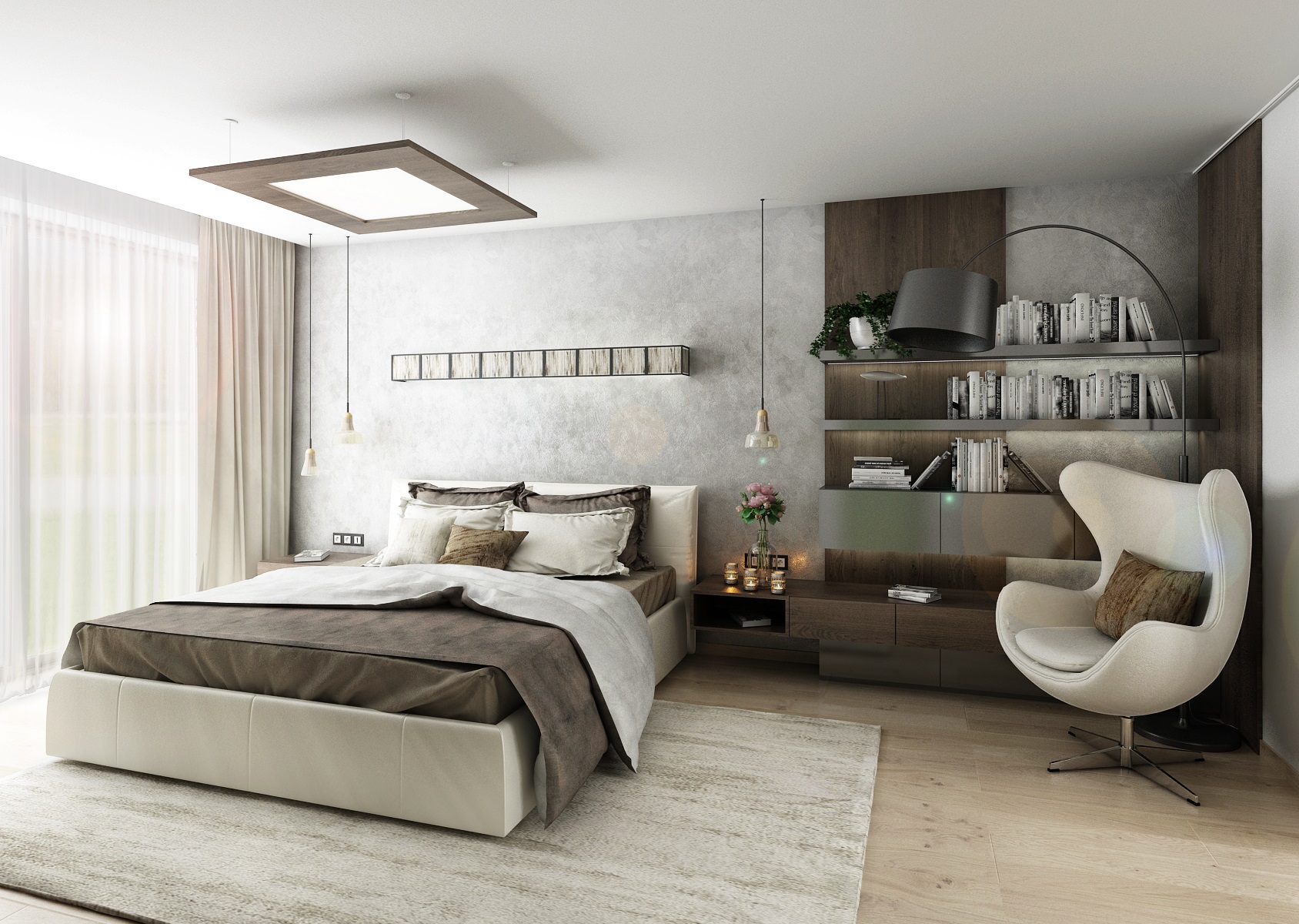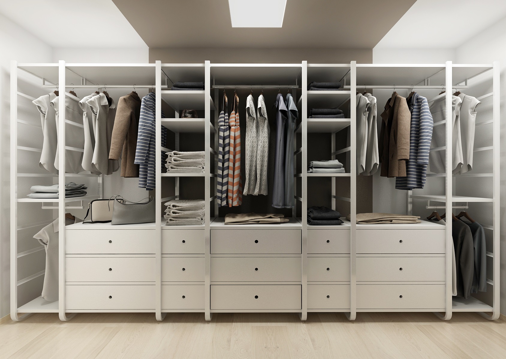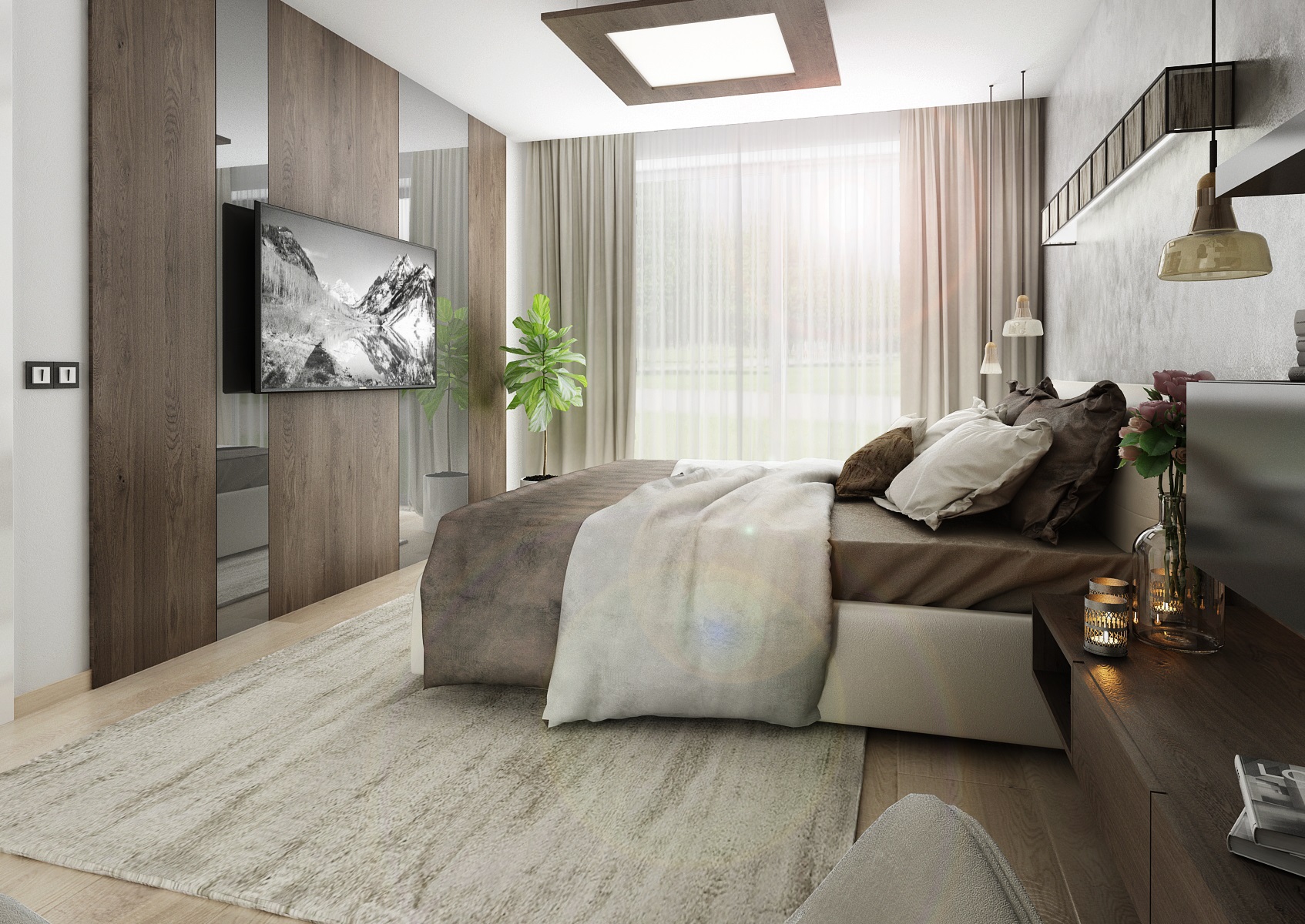 The floors were chosen in light tones in comparison to the dark veneer on the furniture - the matt finish of smoky oak. The color is complemented with anthracit and white LTD. An interesting combination of the use of smoke glass and mirrors on some furniture surfaces.