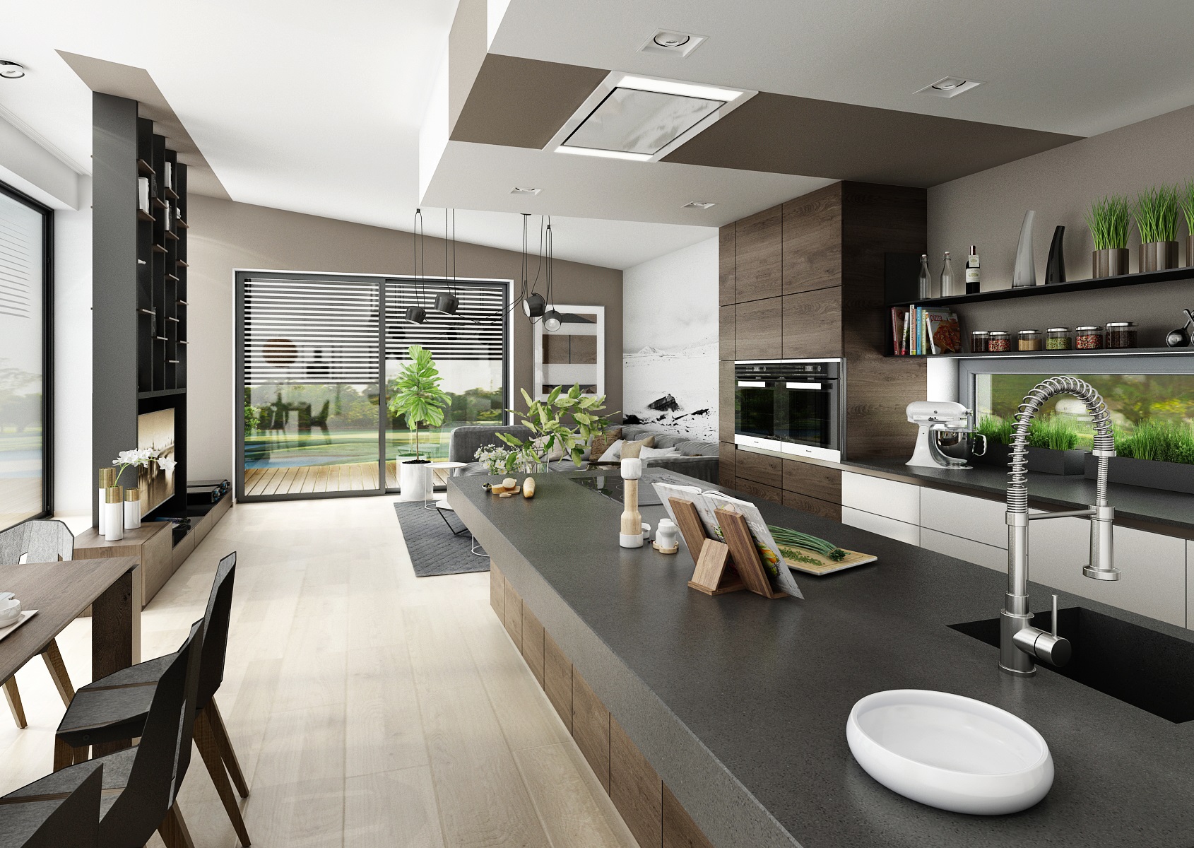 An artificial stone (for example Corial, HI-macs, Hanex...) was chosen for the kitchen worktop. It has enough advantages, such as its form, individual boars and sink are connected without visible joints and its hygenic, pleasant to the touch, etc. Thanks to the variability of its measurements, it was used here in two thicknesses variants. The commonly used three-centimeter thickness of the board (on the worktop under the window) was increased by 10 cm for the effect on the island. The overlap of the board enrlages the work surface and also represents the bar counter.