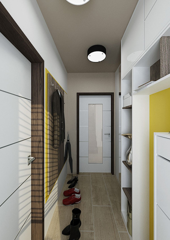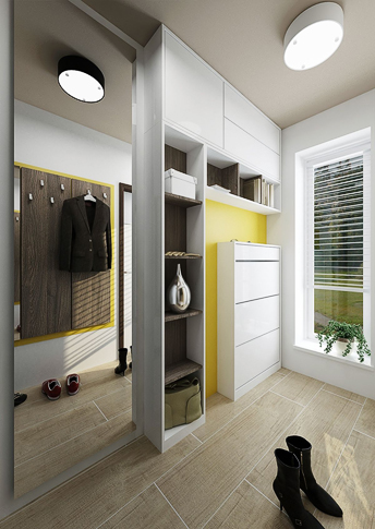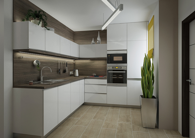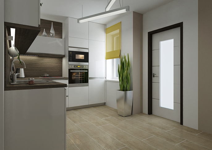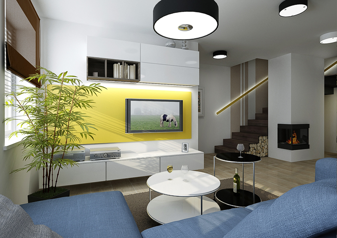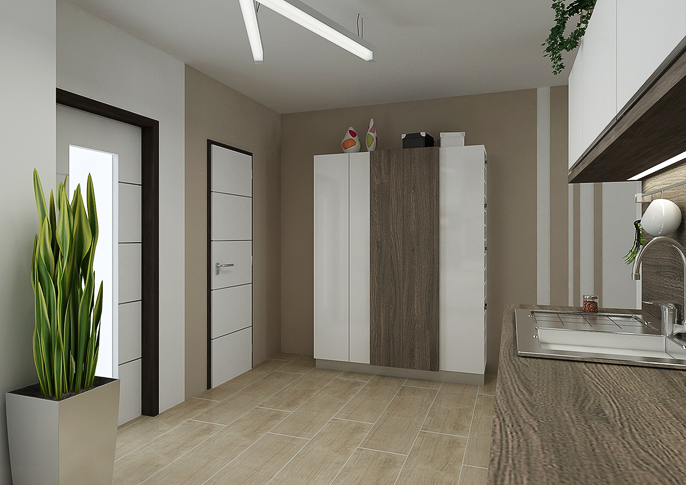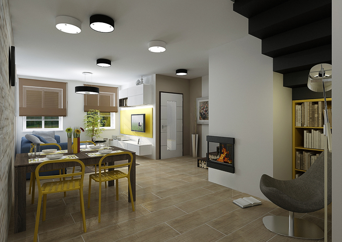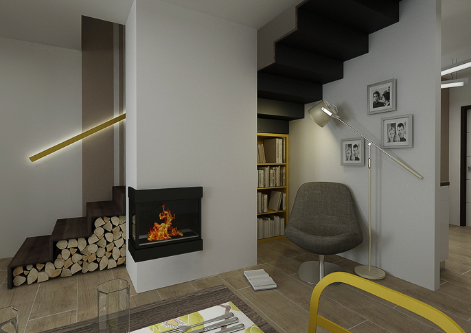 Design of a reconstructed kitchen connected to the living room of the family house. The color scheme was based on earthy colors. There is a newly placed fireplace in the hallway and the wall is lined with stone cladding.