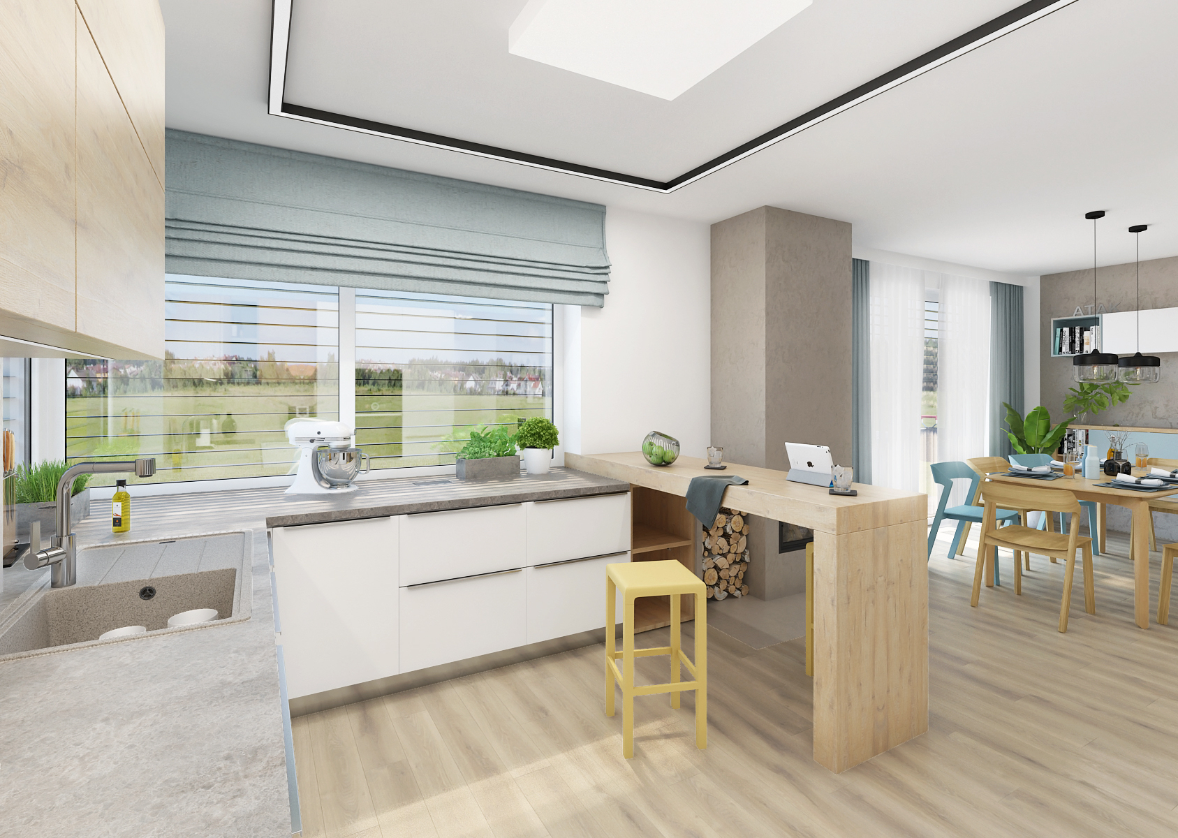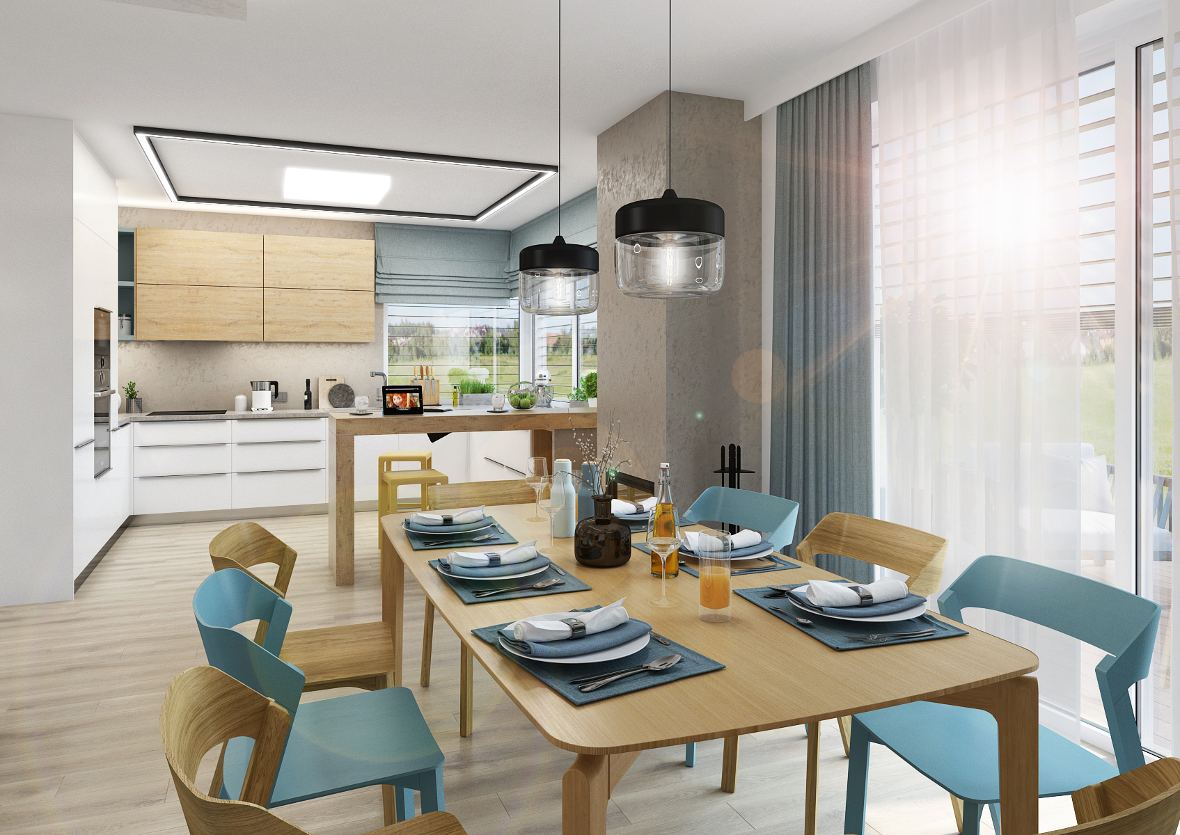 The interior design of the ground floor of the house is proud of the abundant use of turquoise color, especially on accessories in combination with oak wood.