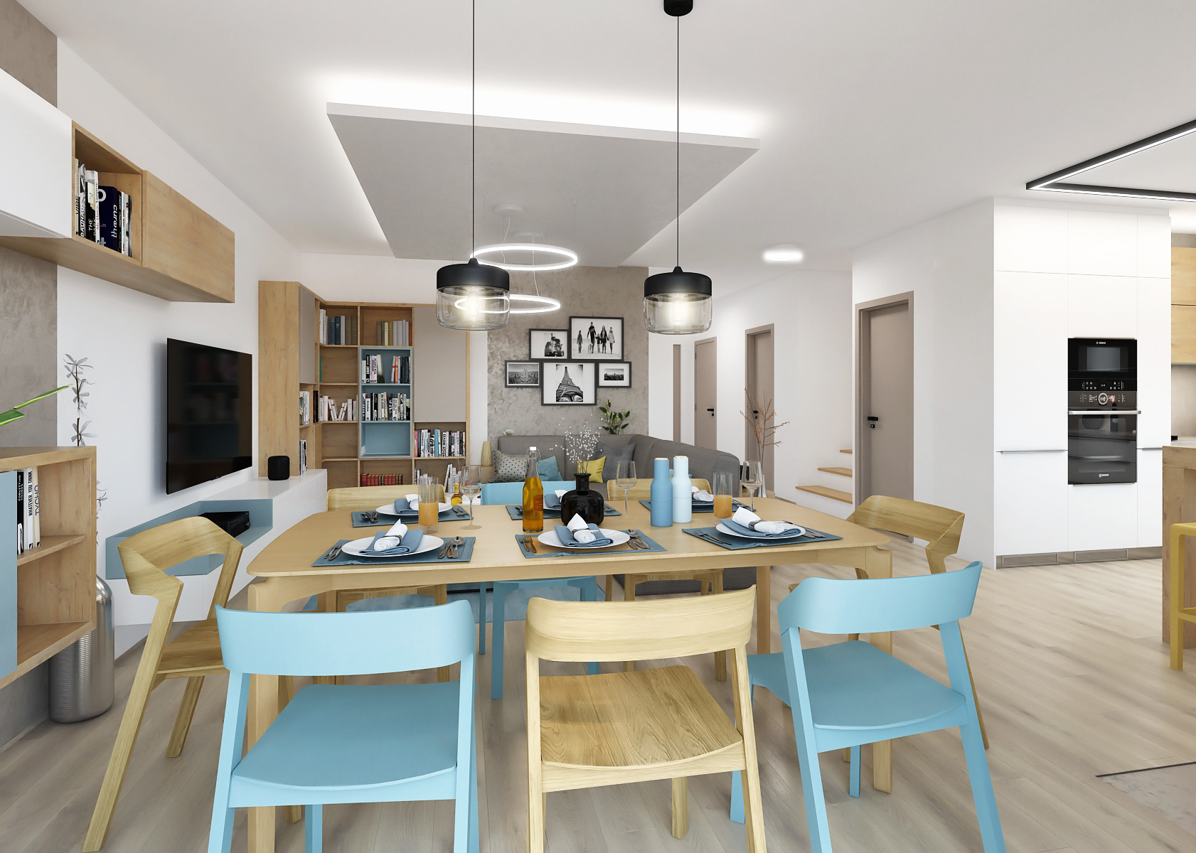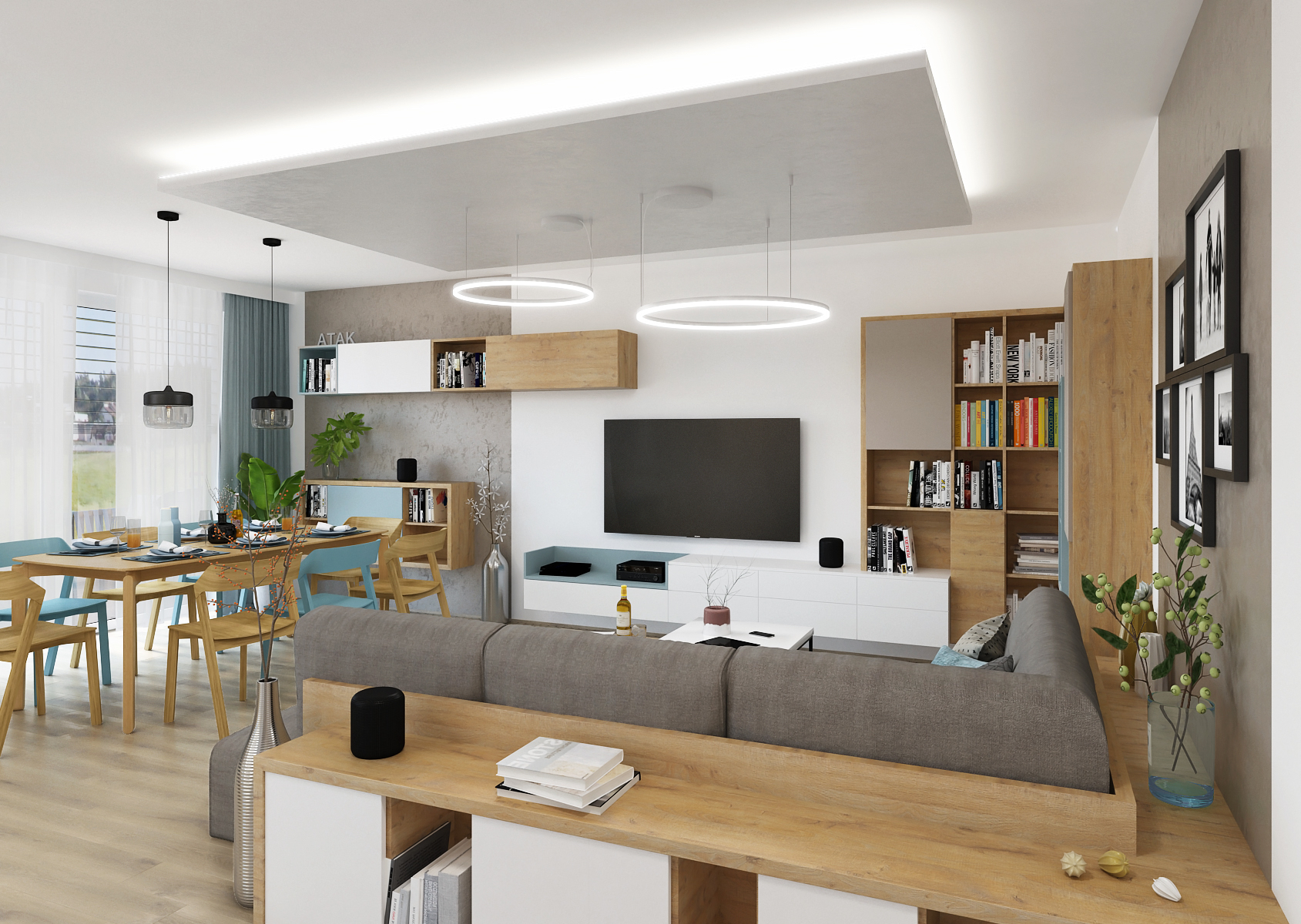 The turquoise color is found not only on home textiles, but also on furniture elements, such as dining chairs, where oak wood alternates with the mentioned color, or on the handleless doors of the cabinet wall in the living room. An interesting element here is also the ceiling soffit, where an LED strip is used as ambient lighting evoking a pleasant atmosphere.