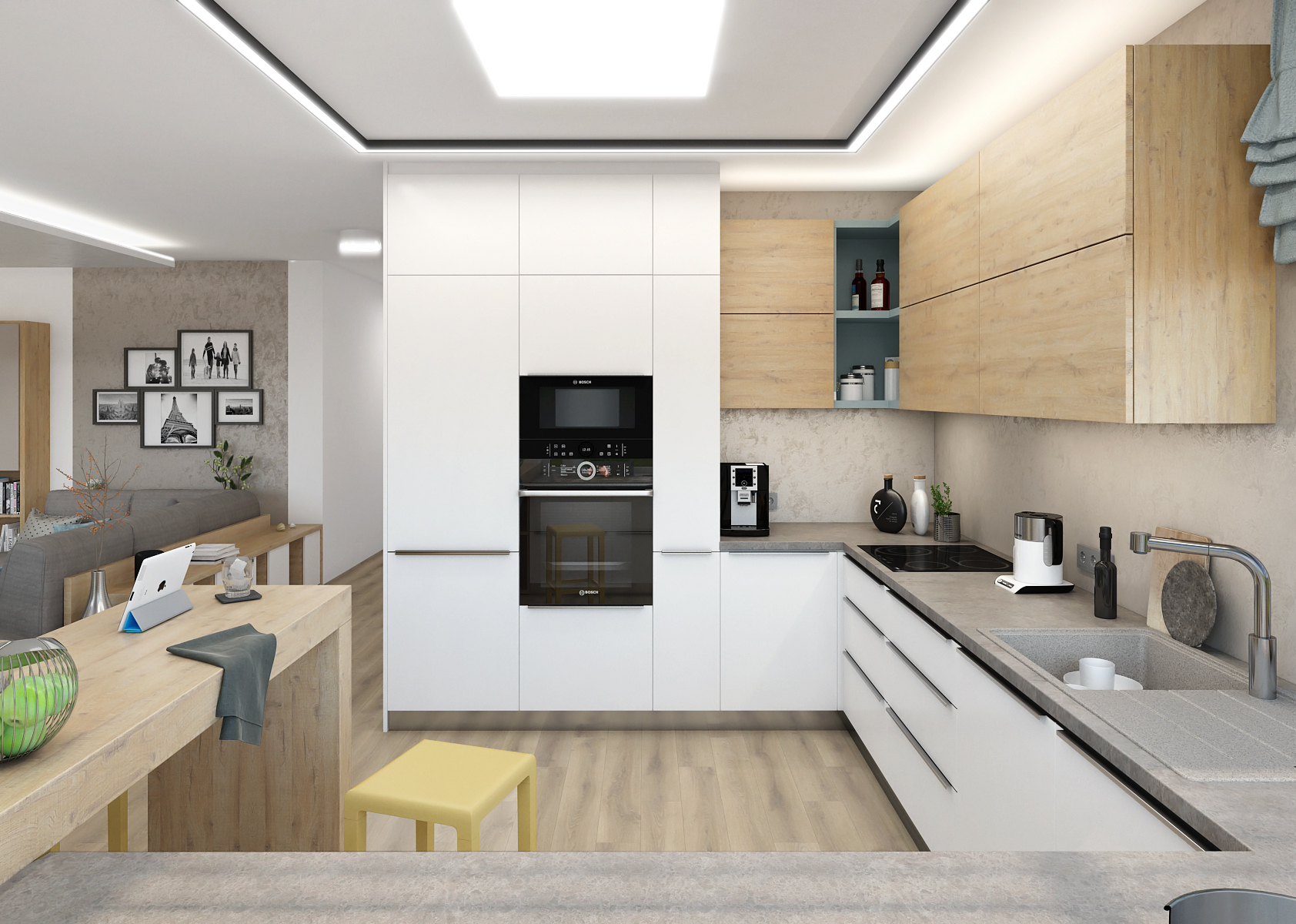 A stone kitchen top with a granite sink adjoins an oak bar counter, behind which is hidden a built-in fireplace stove with a firewood storage. The space is lit by framed ceiling lighting.