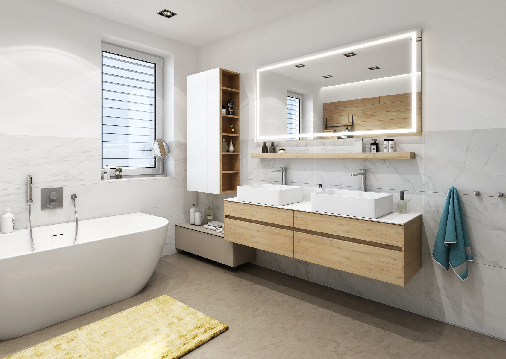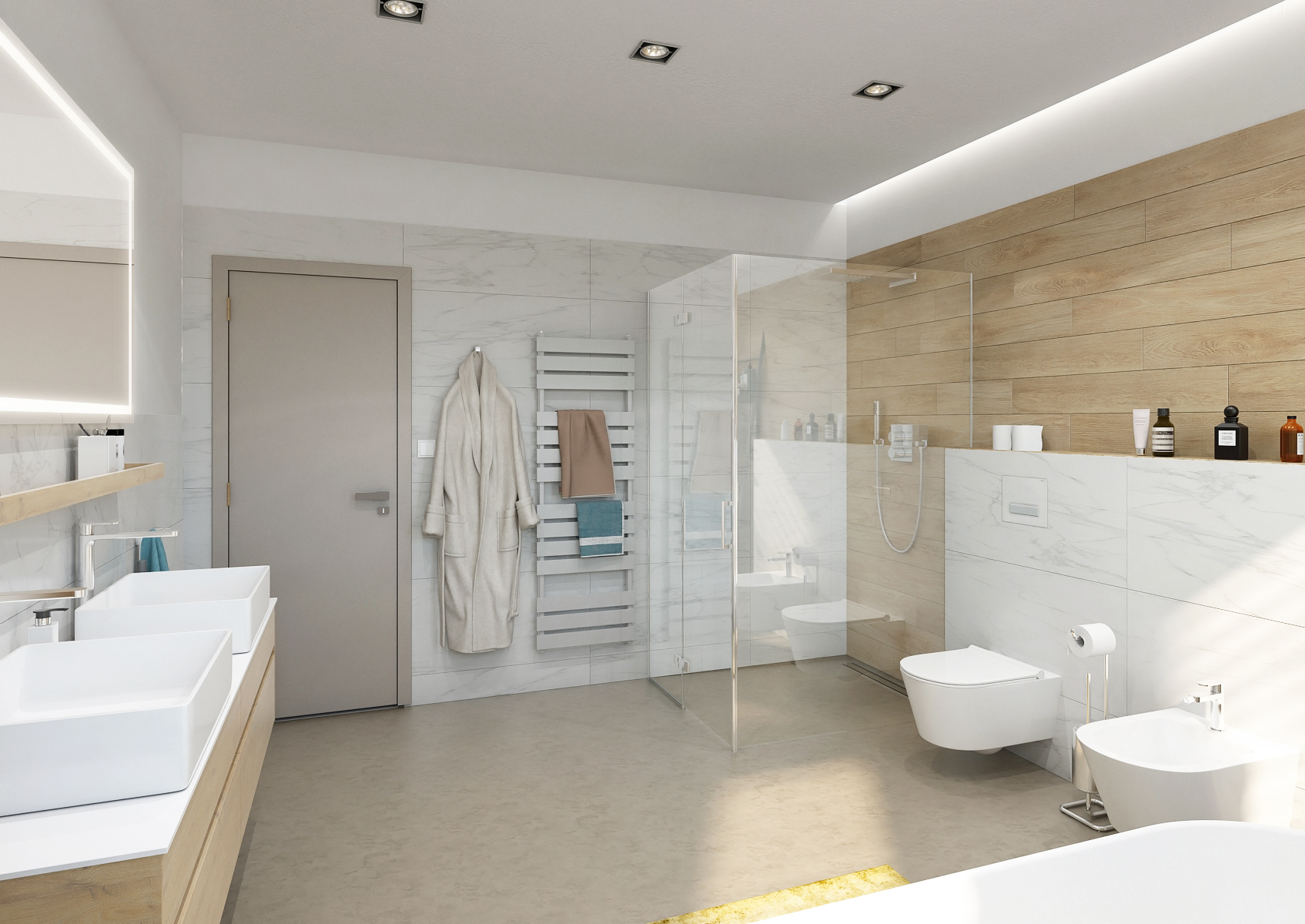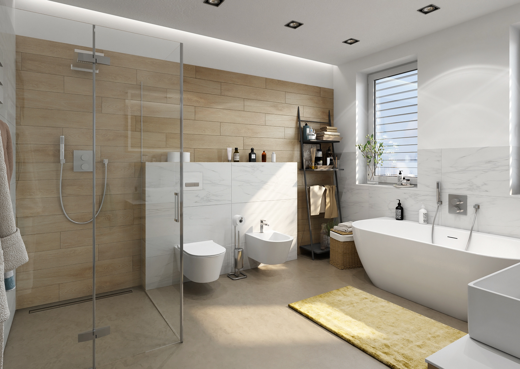 The wall in the bathroom is brightened up with a wood-patterned tiling in combination with a large-format marble tiling and a cast floor. There is also a spacious walk-in shower.