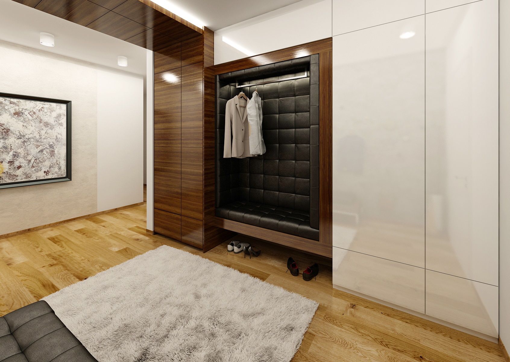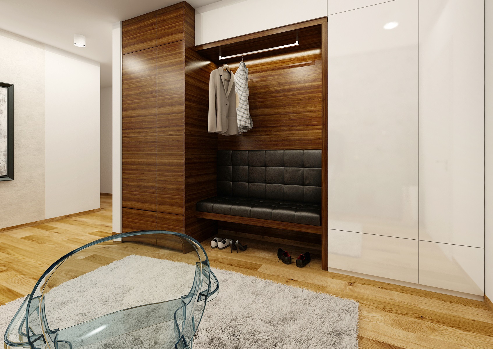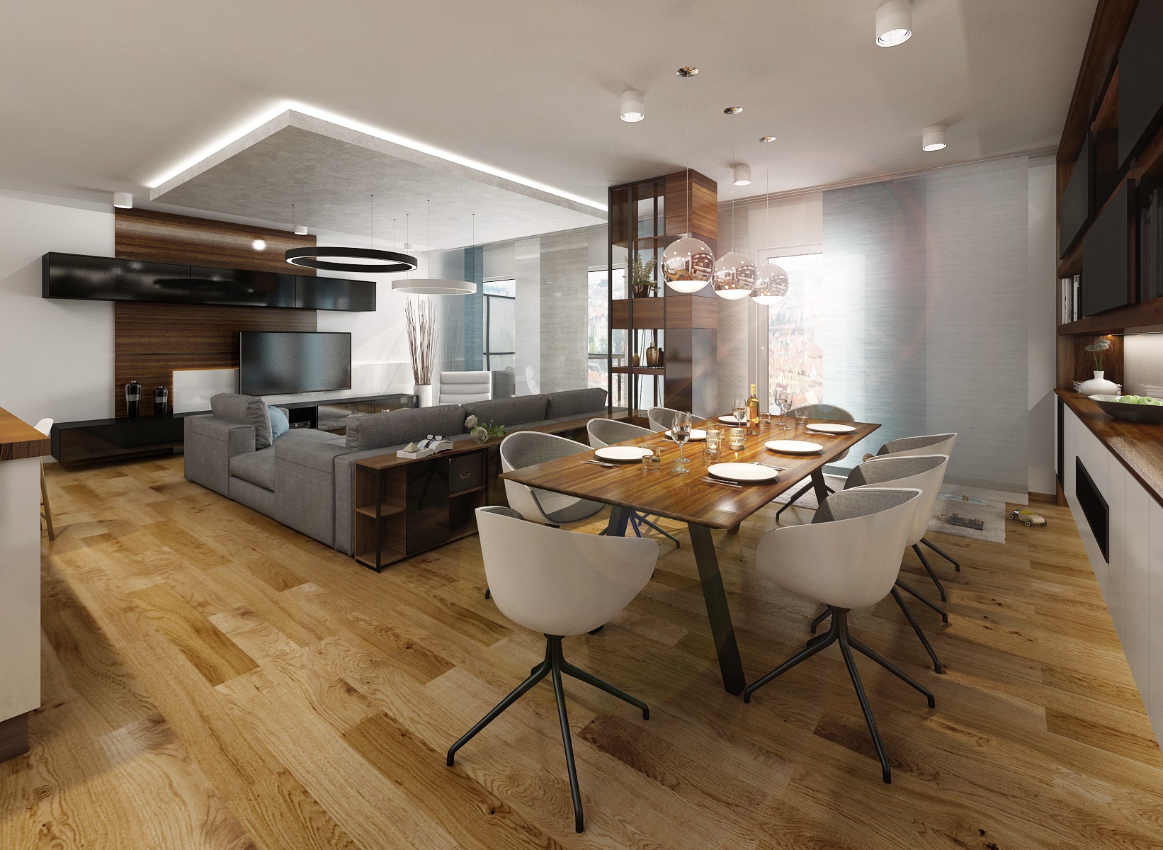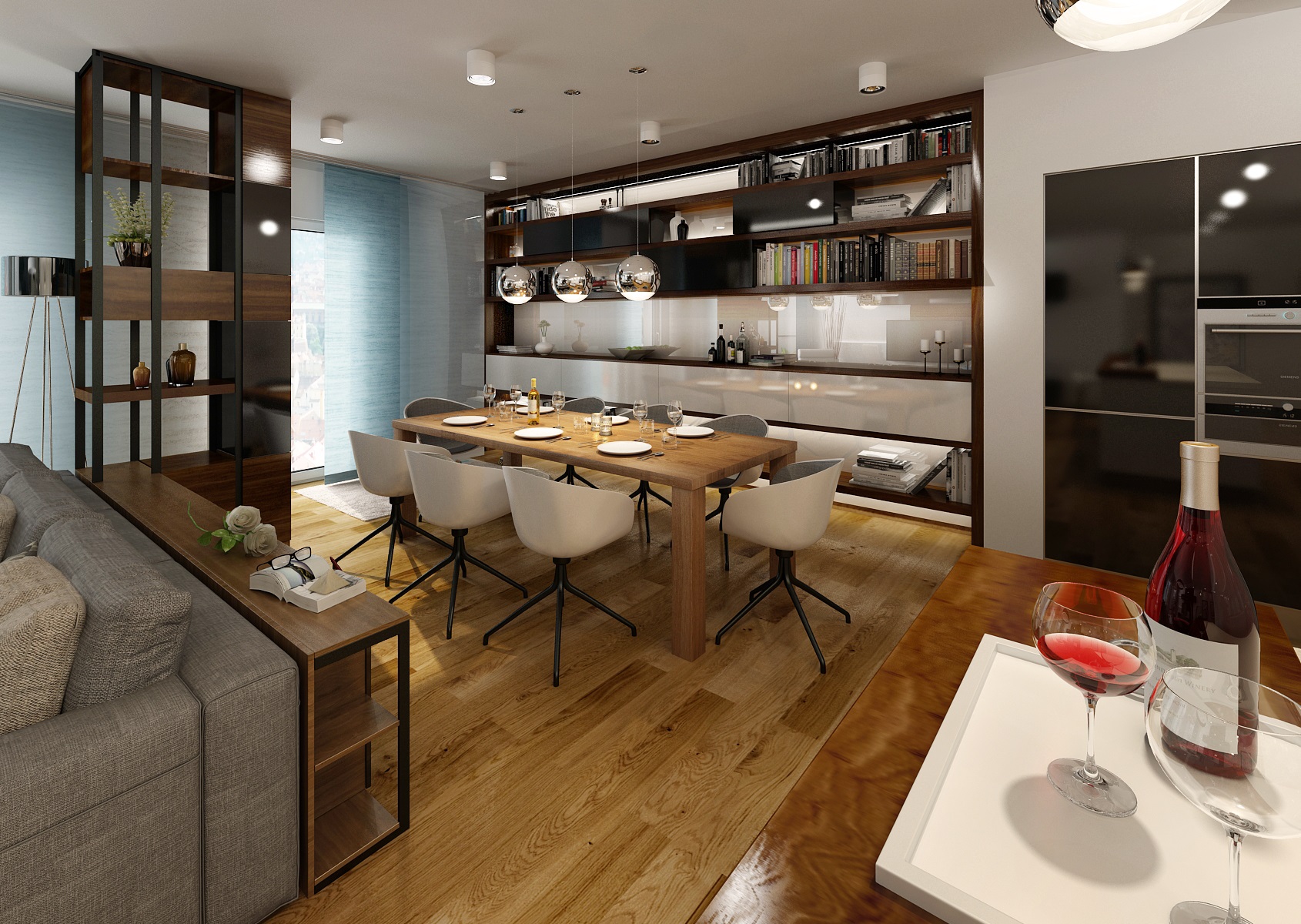 We worked with the materials that were already used in common area of a living room and kitchen, which is in white, black high gloss and walnut veneer. The dining room incorporates an ARKI dining table in a walnut-black combination, complemented by armchairs from HAY.