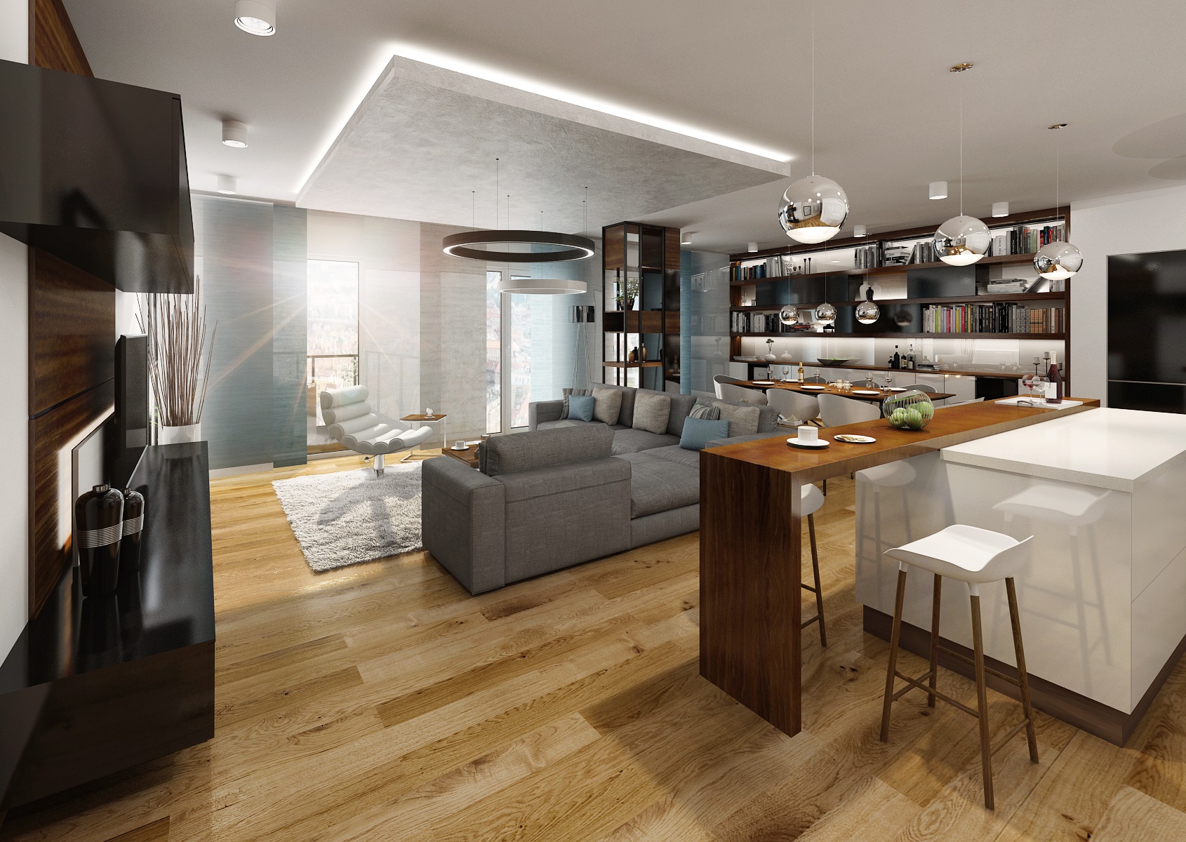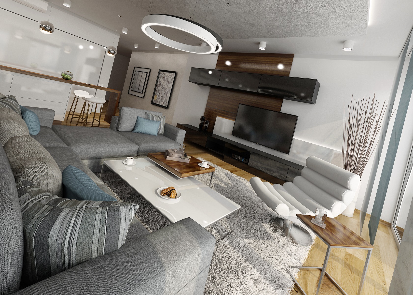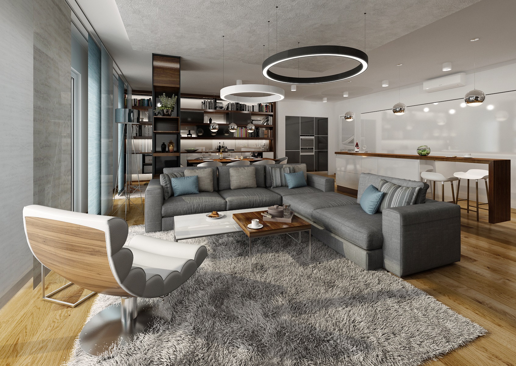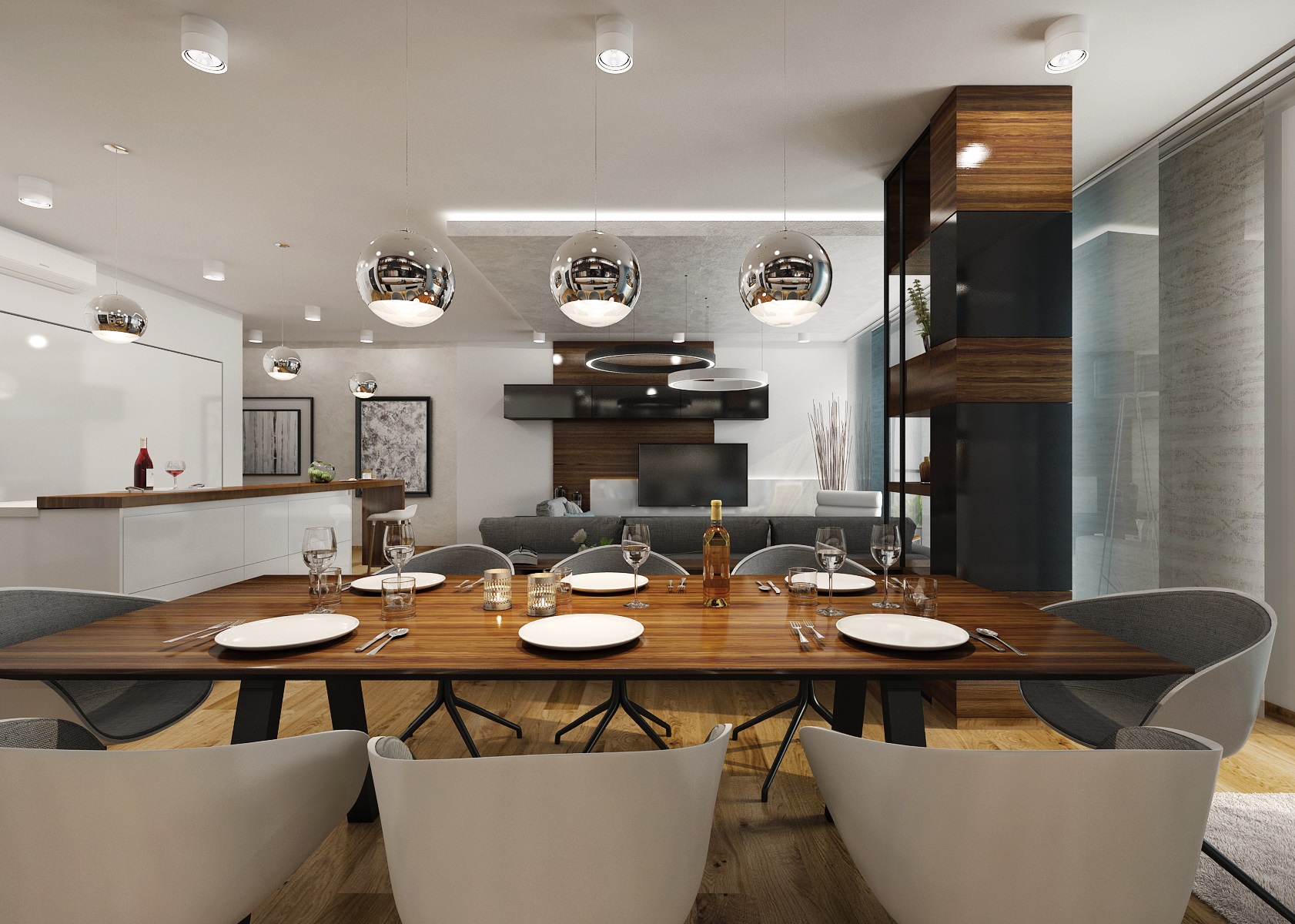 We worked with the materials that were already used in common area of a living room and kitchen, which is in white, black high gloss and walnut veneer. The dining room incorporates an ARKI dining table in a walnut-black combination, complemented by armchairs from HAY.