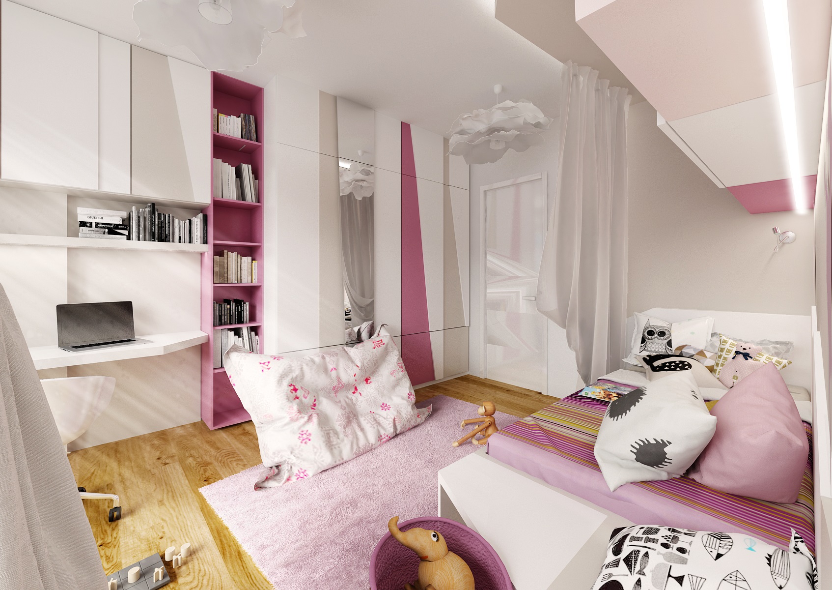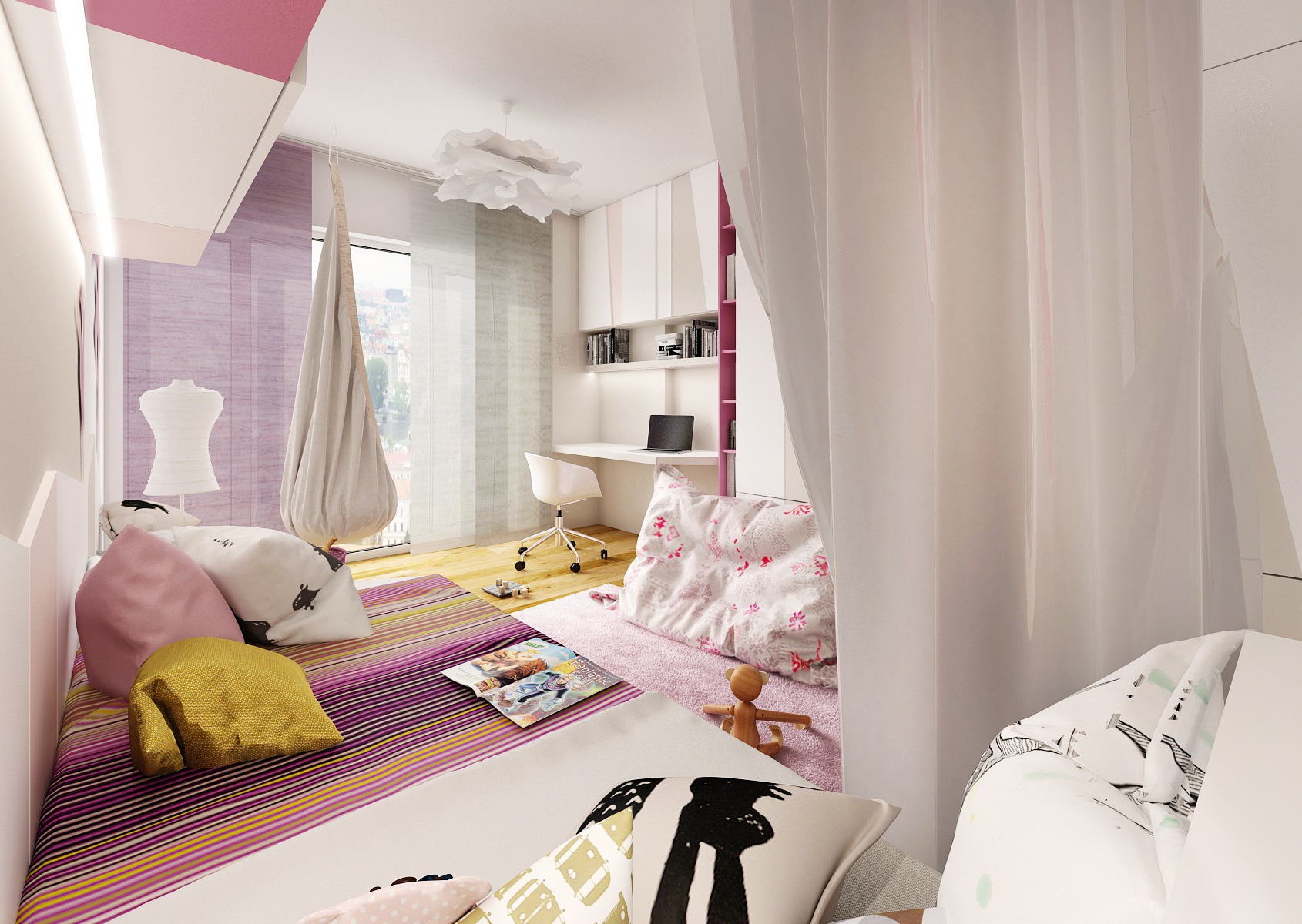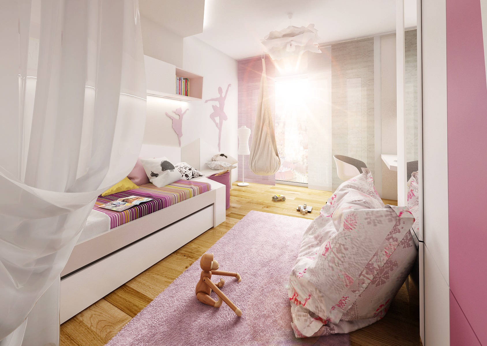 The children's room for a small beginning ballerina is in the colors pink, white, champagne and will captivate you with, for example, a translucent canopy by the bed or a rocking bag.
