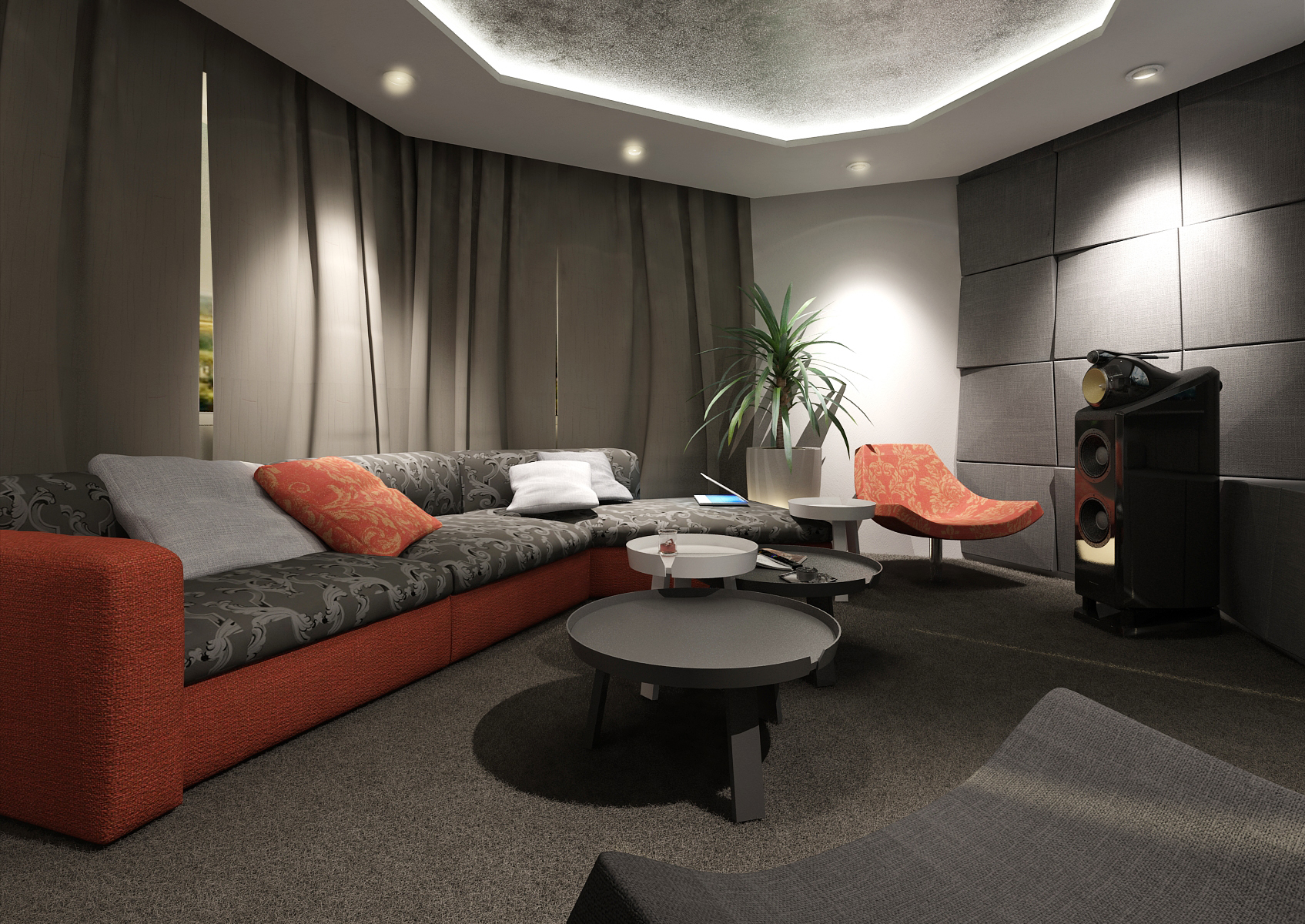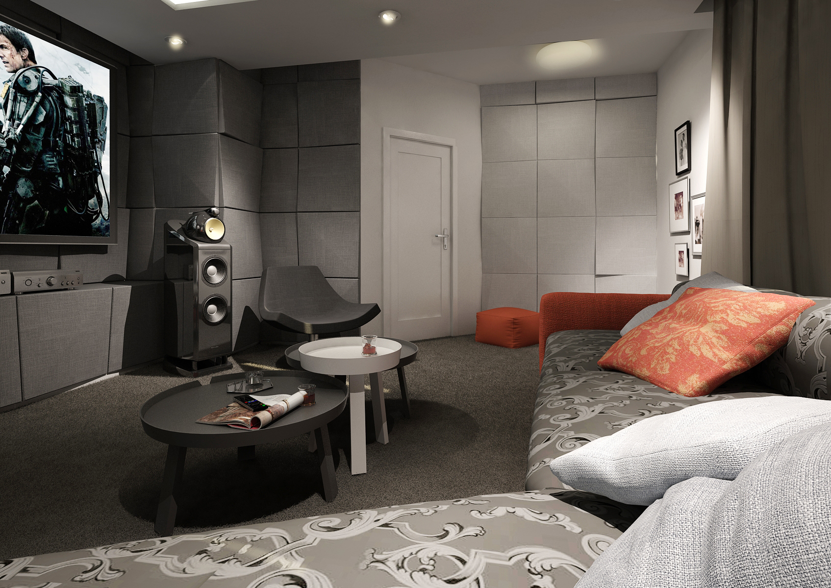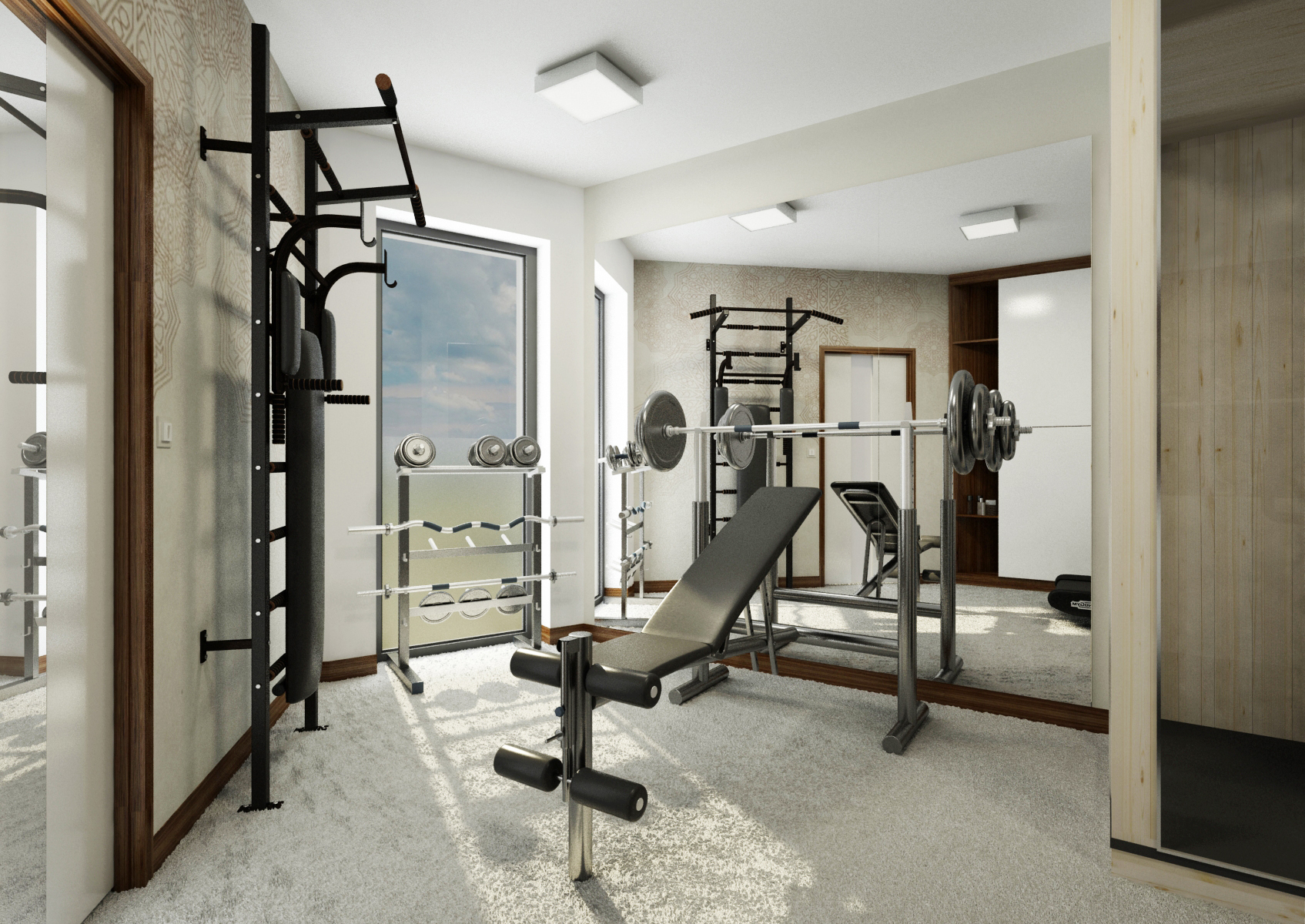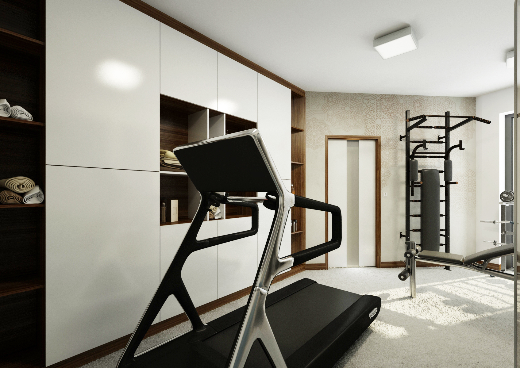 The house may also include rooms that serves as a home theater or a gym. In this case, we used a giant TV with a quality audio system, acoustic panels, dark shades of carpet, seating and curtains, so that it won't create disturbing color accents. In the gym, we can find a built-in cabinet, fitness bench and a treadmill facing the TV, so it makes running more enjoyable.