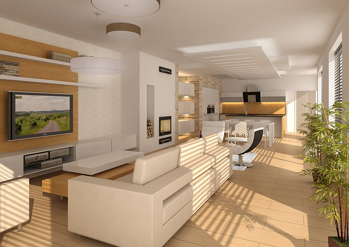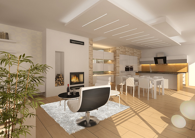 Design of a family house,where the emphasis was on spatially free layout. The central motif of the entire interior is a distinctive decor in the veneer of an Indian apple tree and stone cladding. Natural materials dominate this interior. The fireplace console with cabinets is designed by world designer Petr Malý for the Conmoto company.