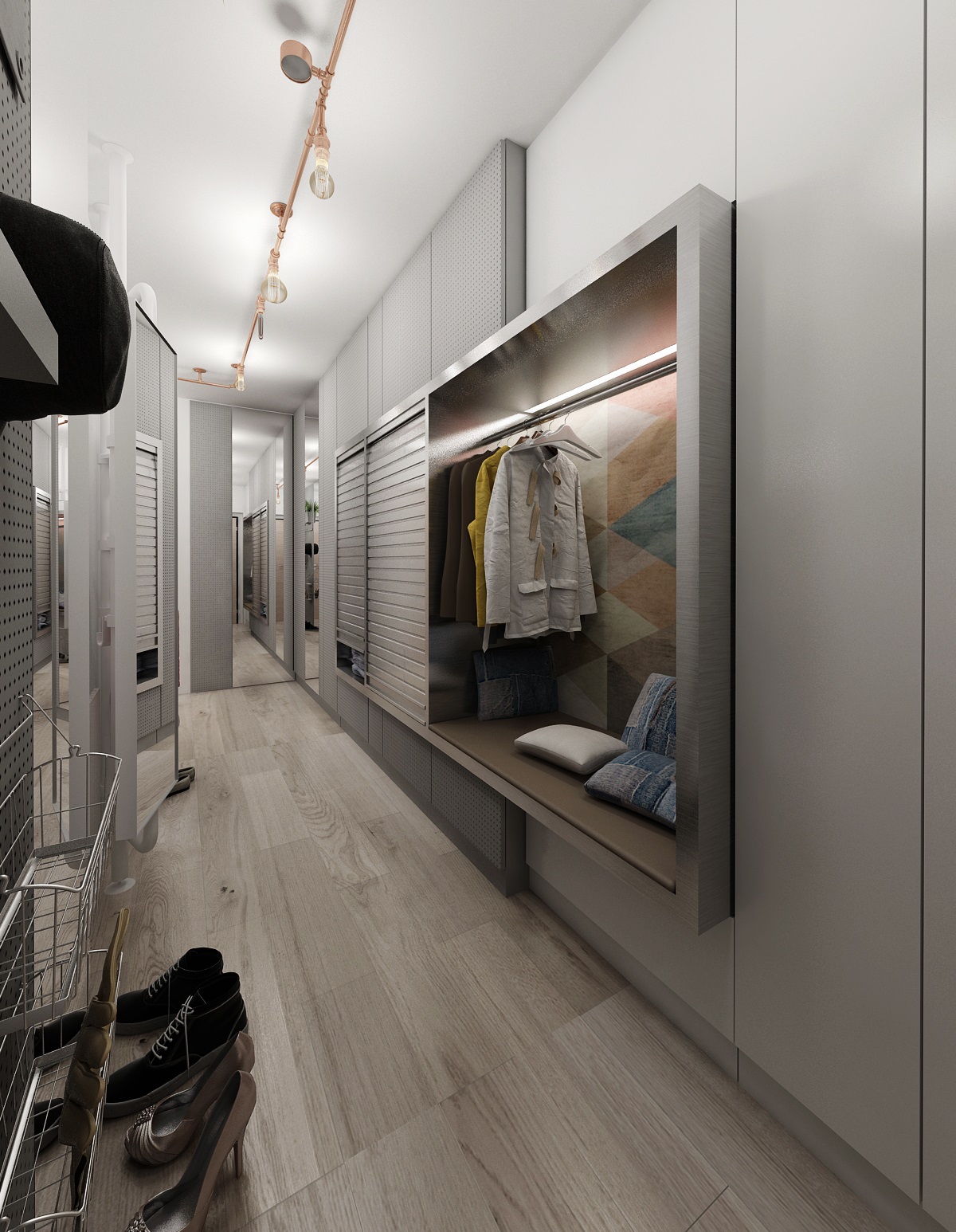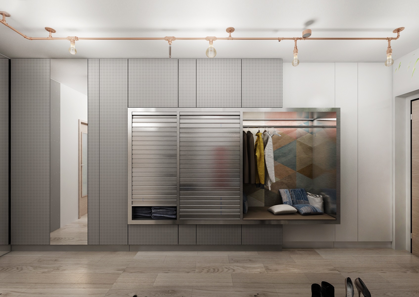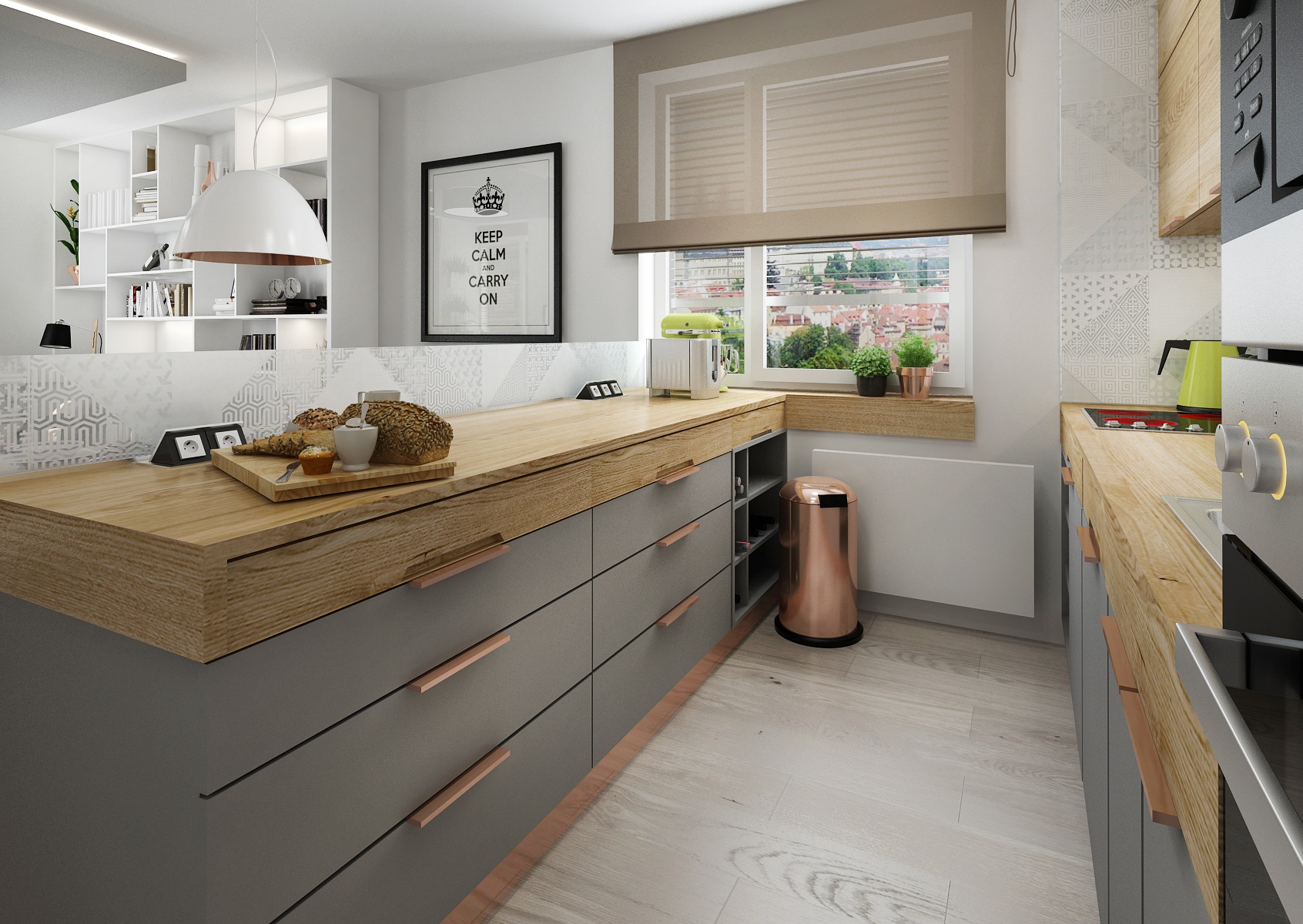 The assignment of the apartment design from the client was: modern retro with industrial elements. So we used color-neutral white and gray LTD for the furniture, which are icel coplemented by oak wood decor and copper retro accessories. Similar graphic motifs as on the tiling behind the kitchen unit are also used on the glass strim on the island. The wardrobe in the hallway has a door behing gray lacquered aculite (perforated hardboard).