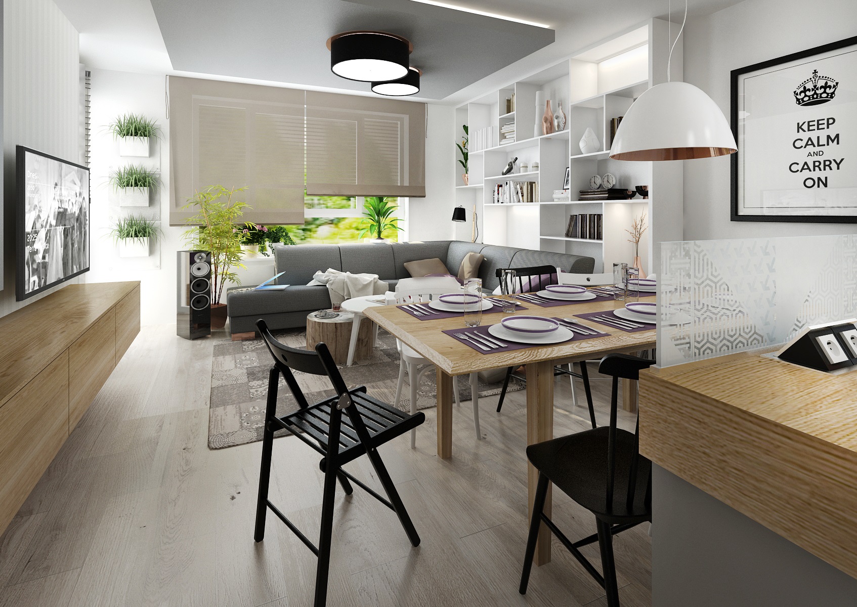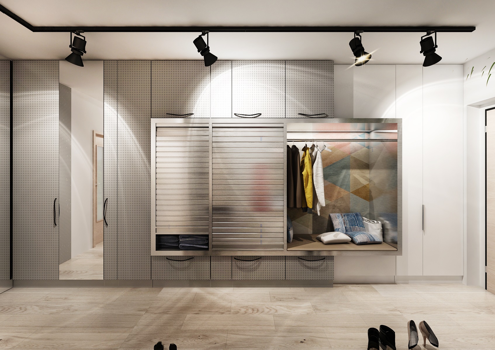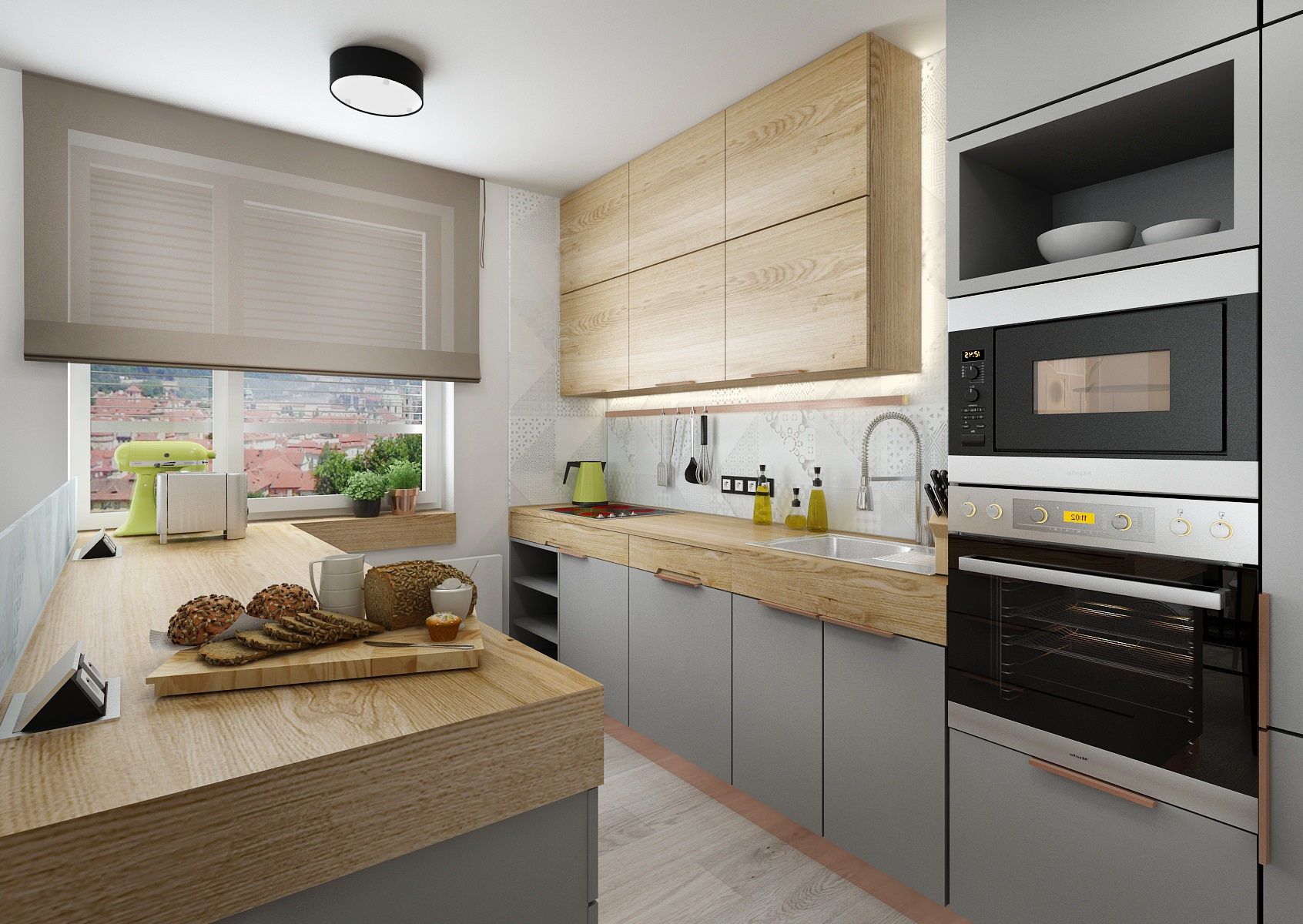 The assignment of the apartment design from the client was: modern retro with industrial elements. So we used color-neutral white and gray LTD for the furniture, which are icel coplemented by oak wood decor and copper retro accessories. Similar graphic motifs as on the tiling behind the kitchen unit are also used on the glass strim on the island. The wardrobe in the hallway has a door behing gray lacquered aculite (perforated hardboard).
