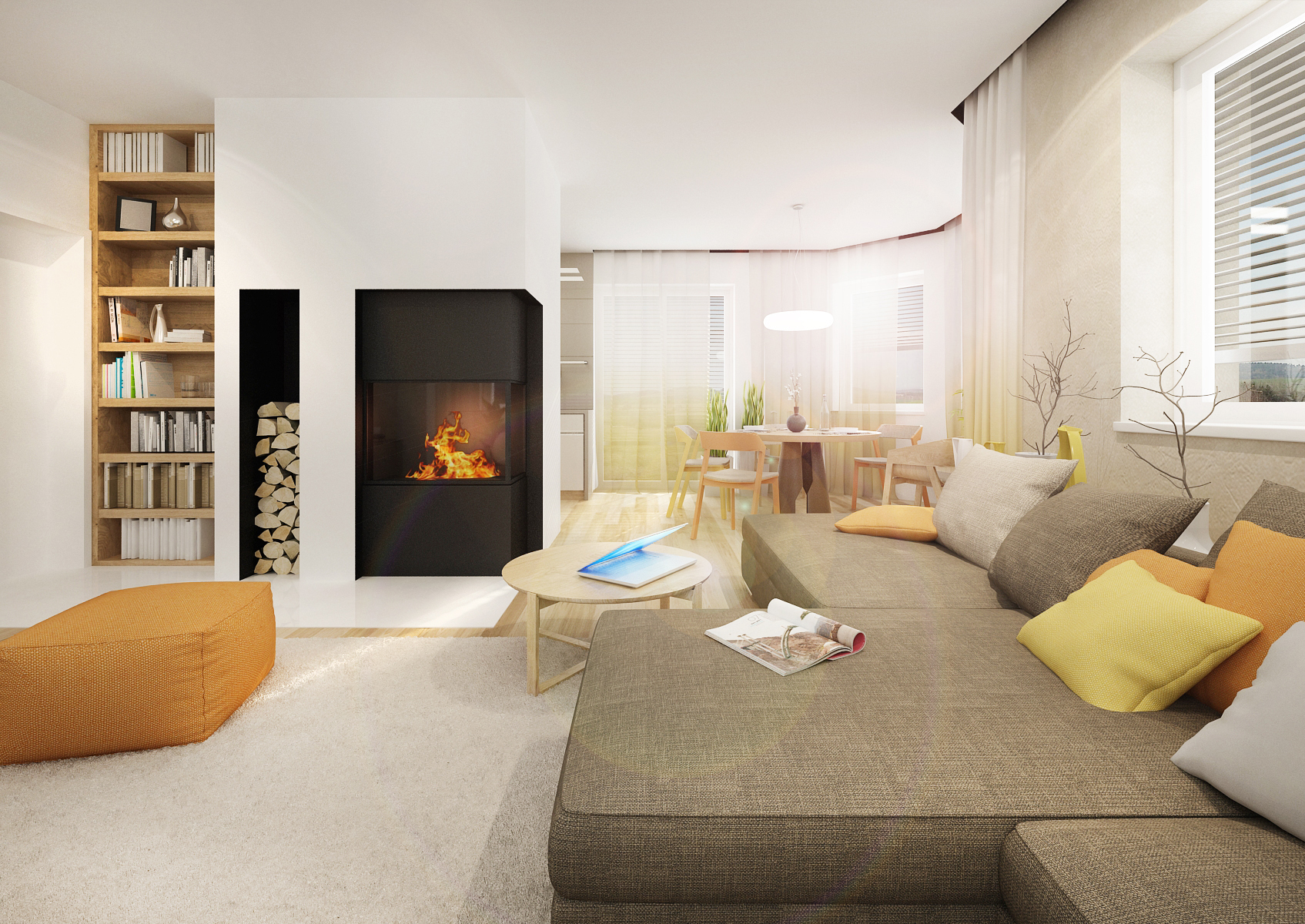 Interior of a family house in beige tones with a common livng room, dining room and kitchen. The light oak floor is complemented with a laminate in natural oak decor and coffee color. In the kitchen the cladding behind the worktop is solved with glass lacobel cladding in the shade according to the furniture. Dining chairs are from the Merano series by TON.