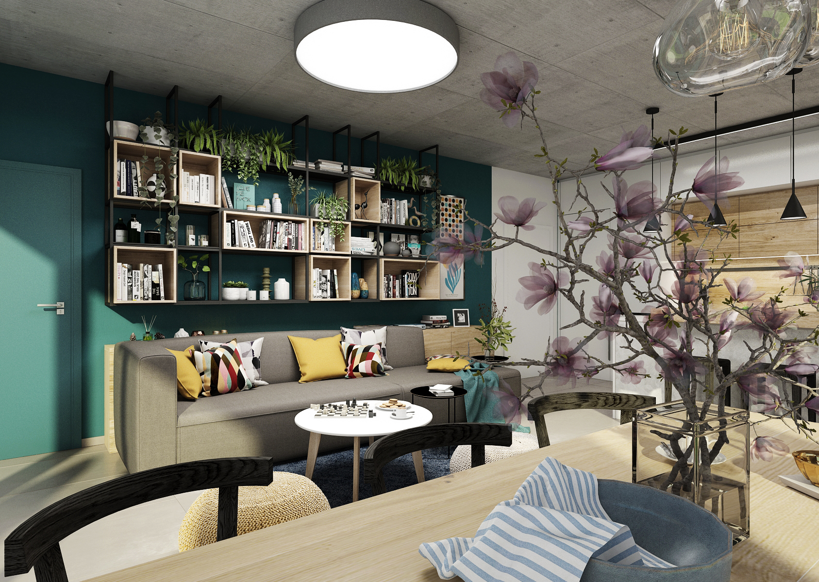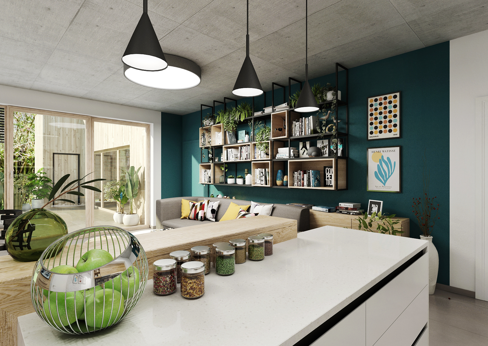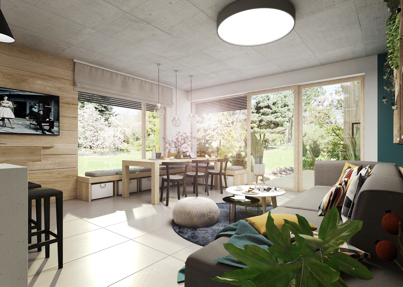 The living space is sufficiently lit thanks to the French windows, which provide not only a view of the garden, but also access to the terrace using portal doors. In addition to the chosen color, the concrete ceiling is an interesting element.