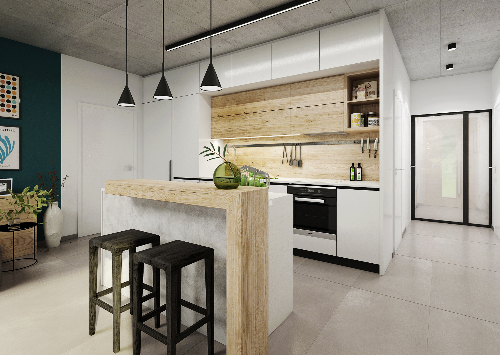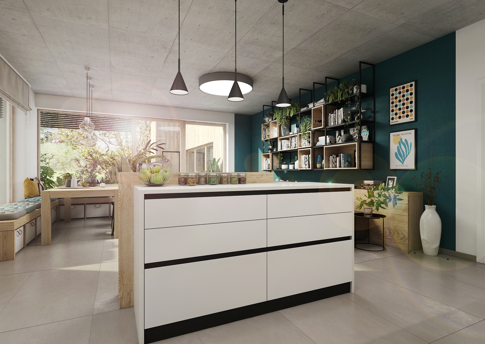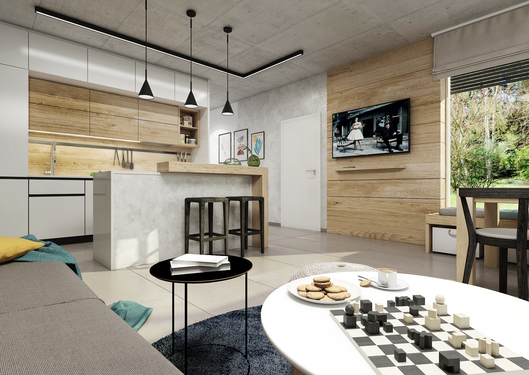 The living space is sufficiently lit thanks to the French windows, which provide not only a view of the garden, but also access to the terrace using portal doors. In addition to the chosen color, the concrete ceiling is an interesting element.