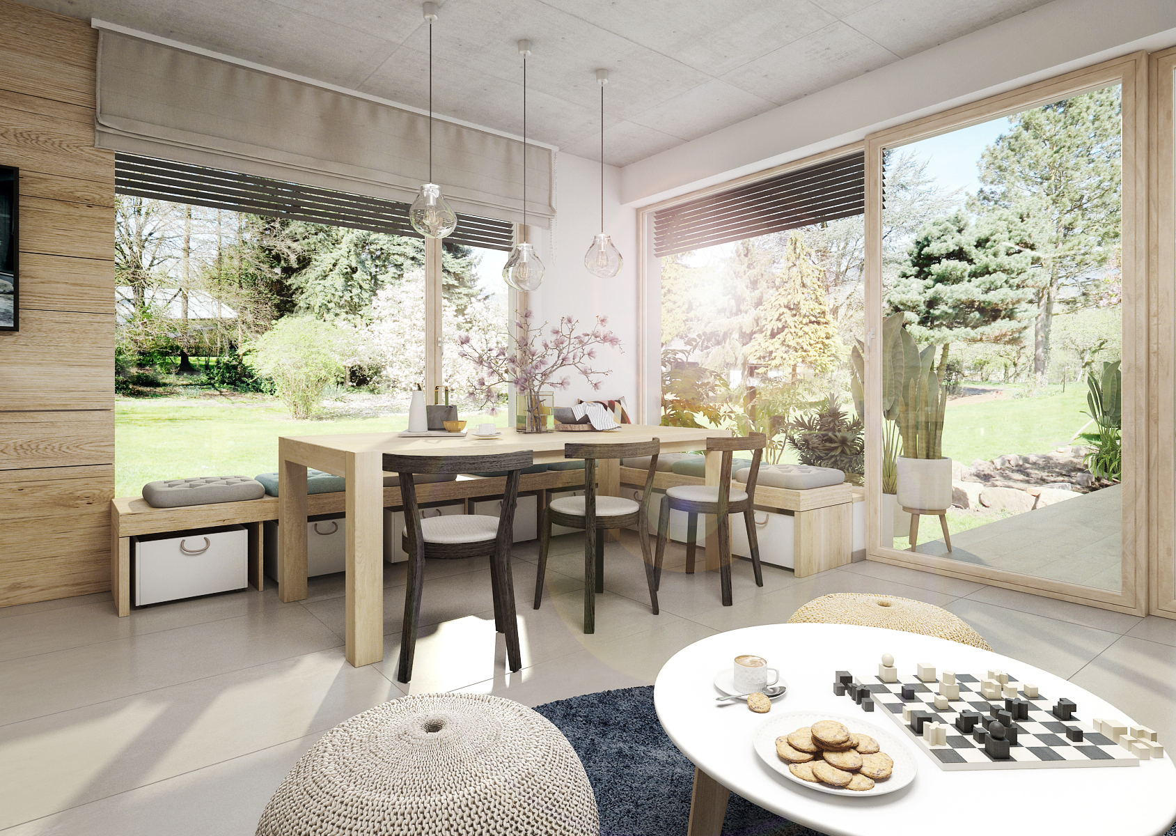 The interior is also brightened thanks to the white kitchen, which uses oak wood. Oak is also found on the wall in the form of a wall panel behind the television and with a shelf. It visually follows the seating in the form of a bench with storage space at the dining table.