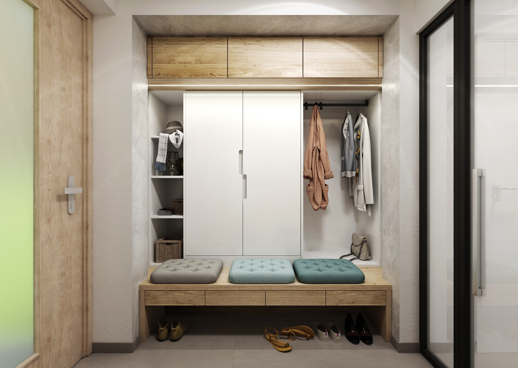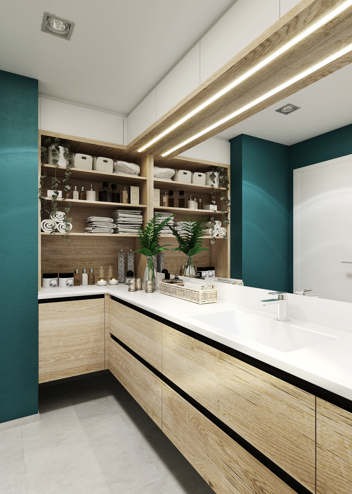 The bright interior of the family house is complemented by bottle green color, which makes the space look timeless and luxurious.