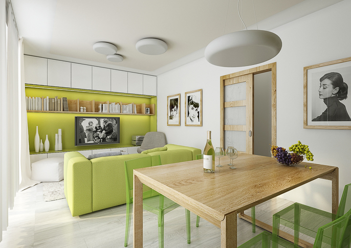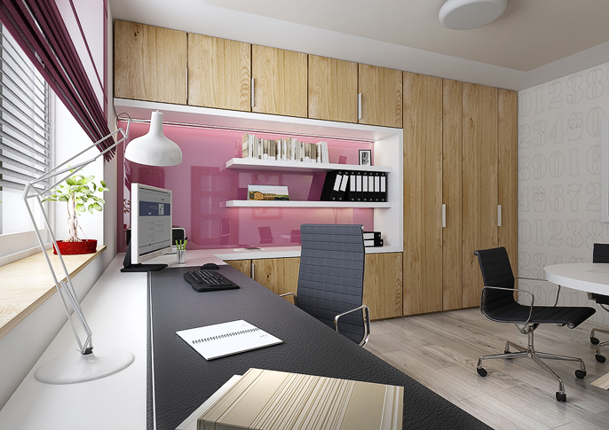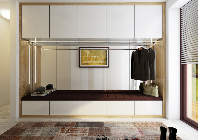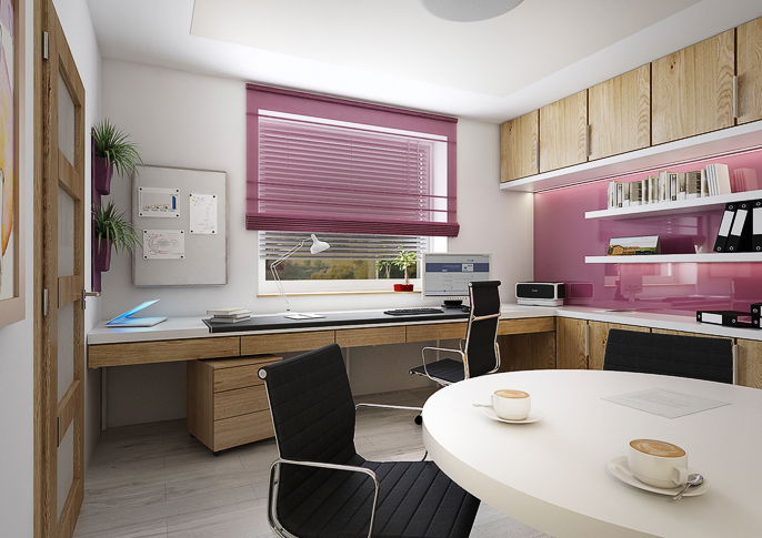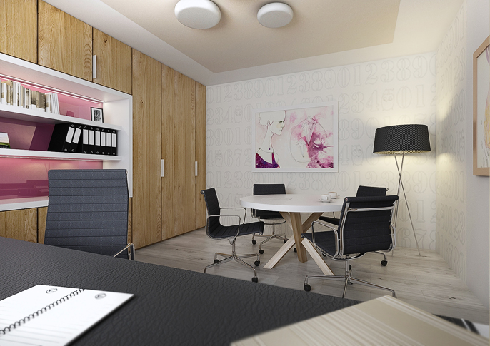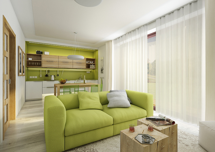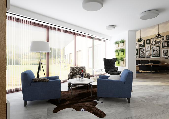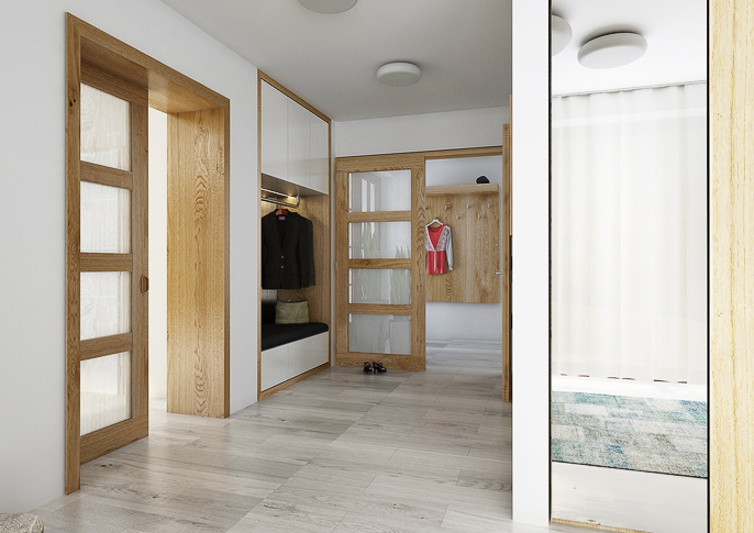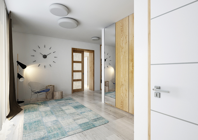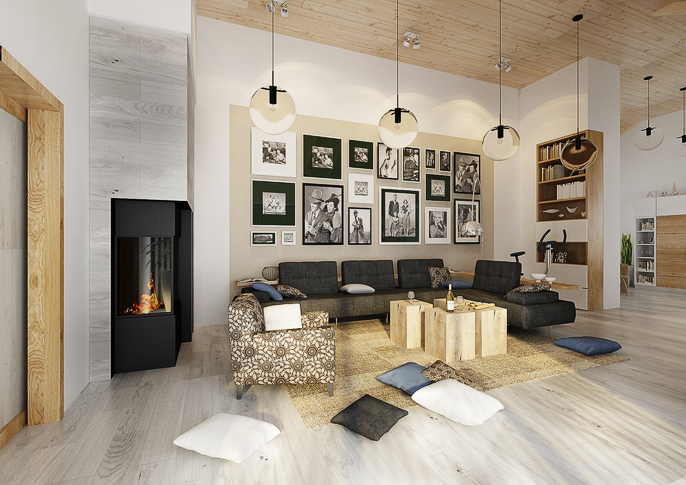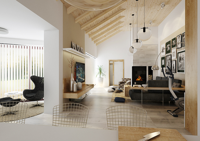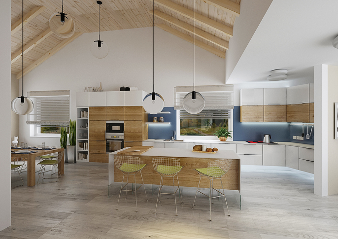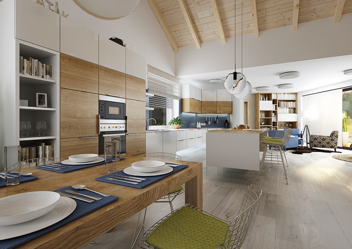 Interior design of a family house in the countryside. Large common area with kitchen and living room with wooden ceiling. The uniform flooring in gray oak decor and honey oak wood decor on the furniture runs through all rooms. The house has a study room and even a seperate apartment for grandmother with its own kitchen.