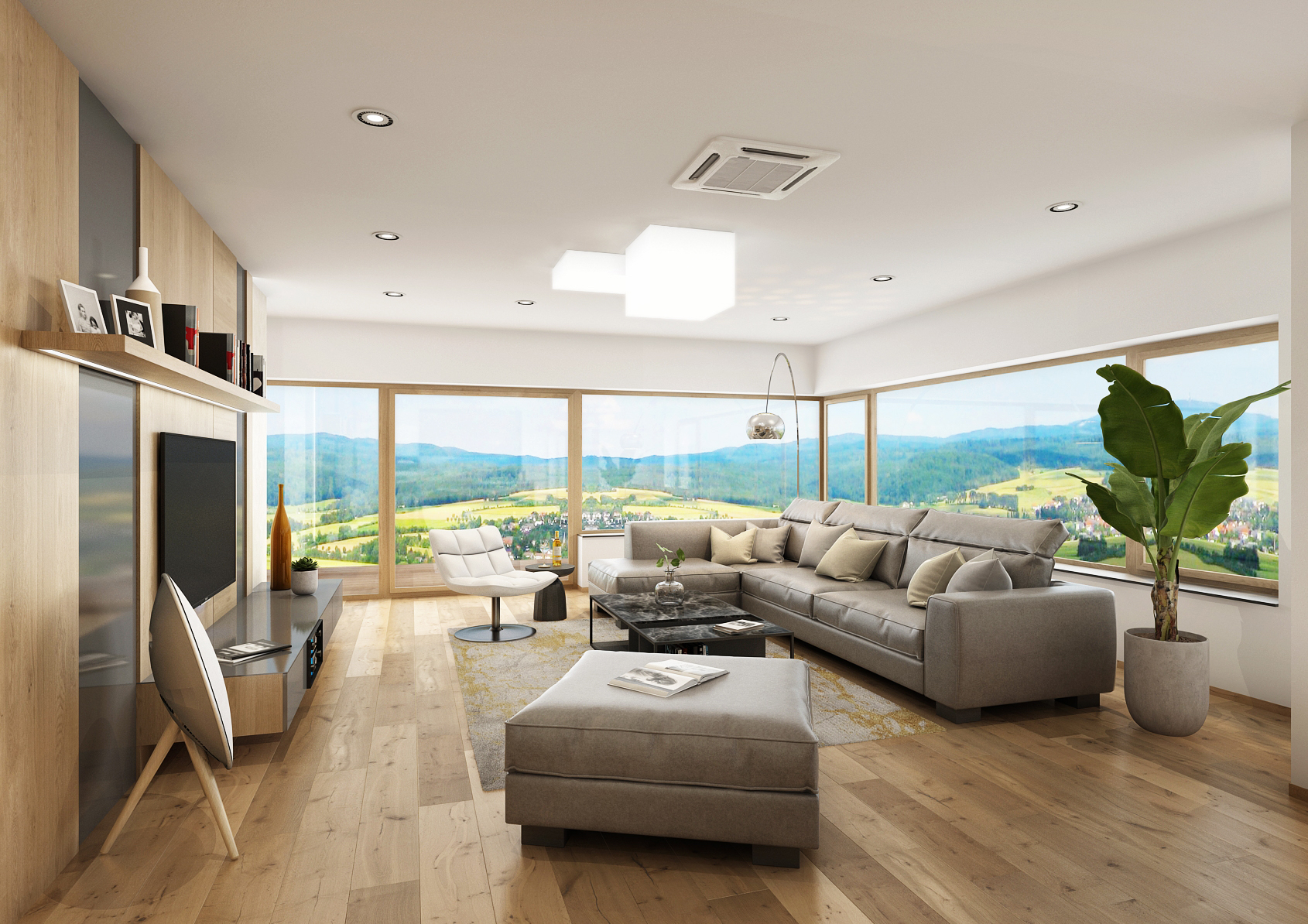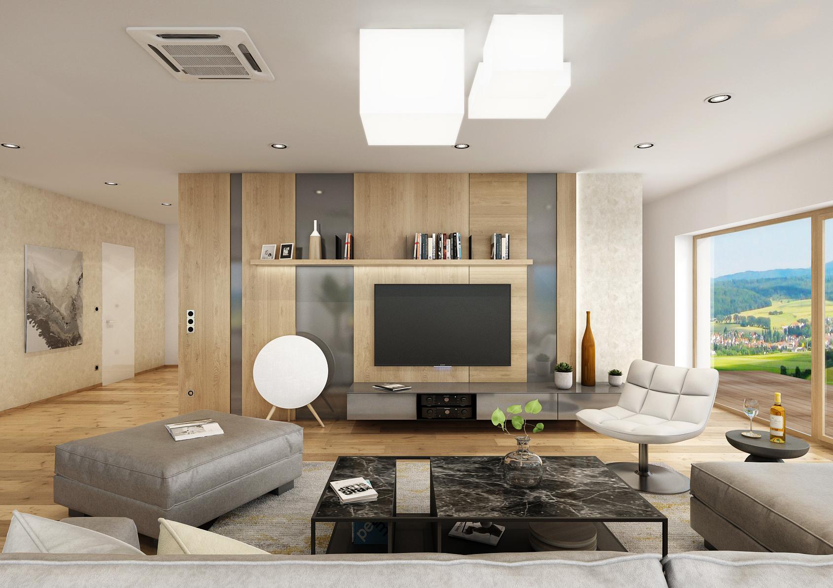 Of course, the spacious living room also has a large upholstered sofa with adjustable armrests and a marble coffee table in black. The TV wall boasts maple tiles combined with gray stripes in semi-gloss. This entire interconnected space is illuminated at the same time by spotlights and designer suspended ceiling lights.