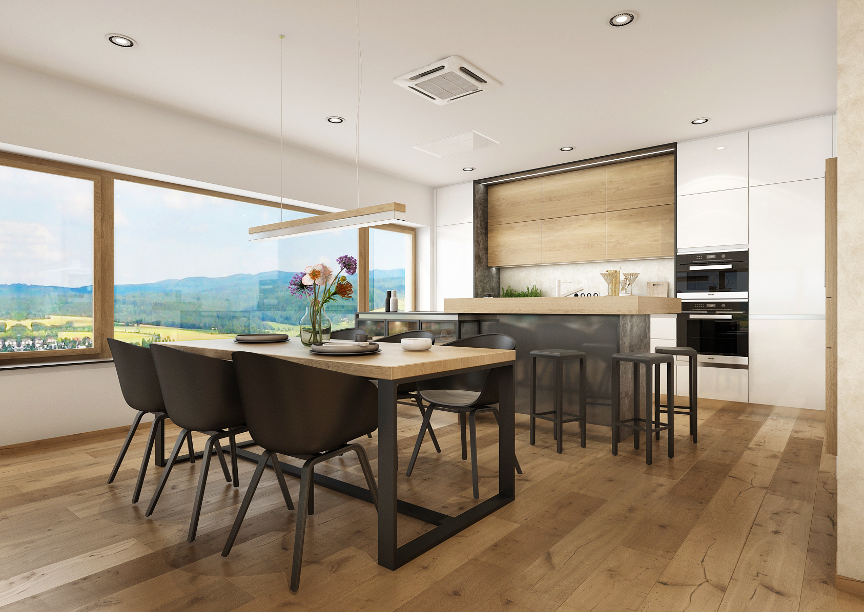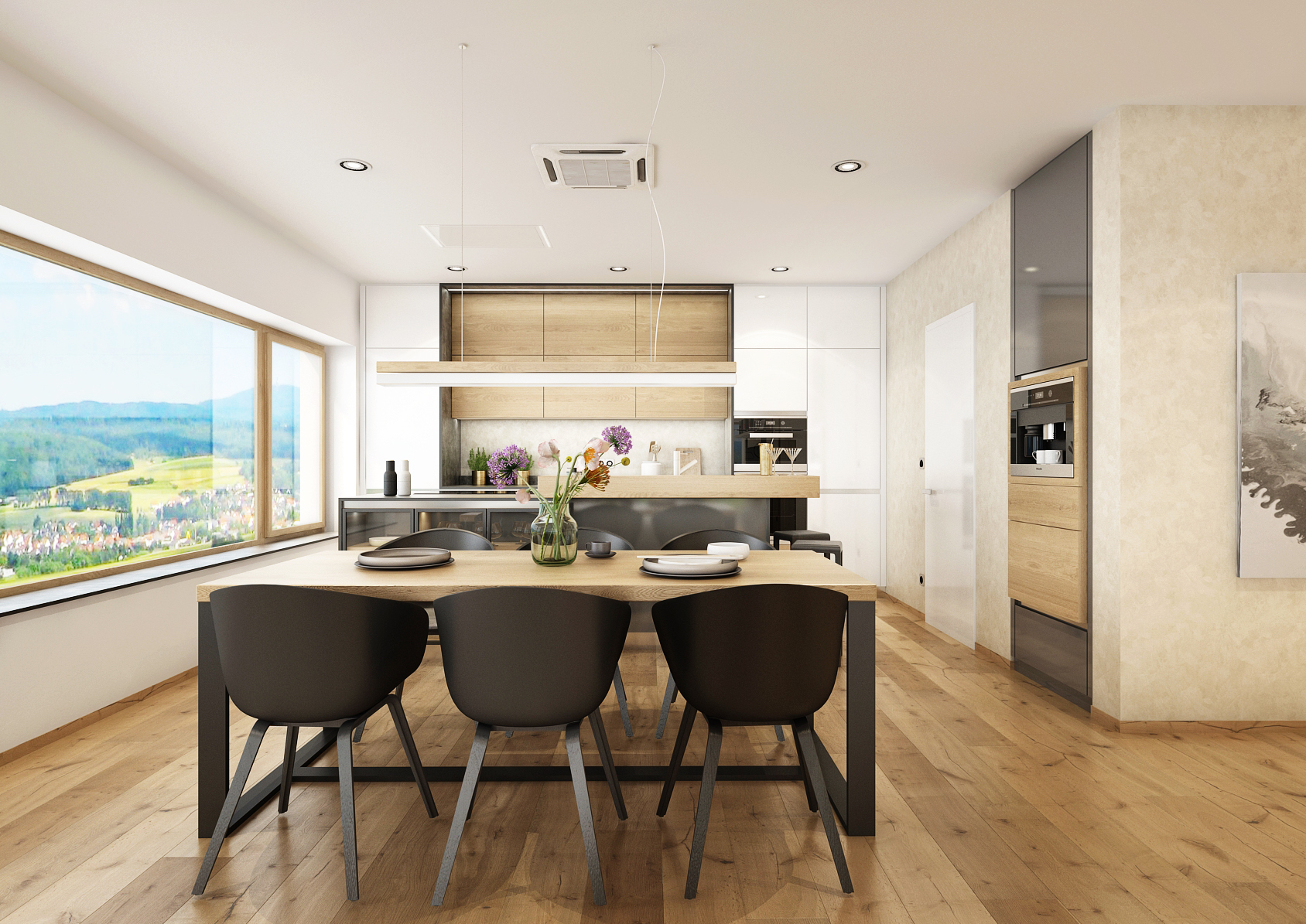 The kitchen is followed by a large dining table with a metal base and a light solid wood top. Six comfortable black dining chairs were chosen for this combination.