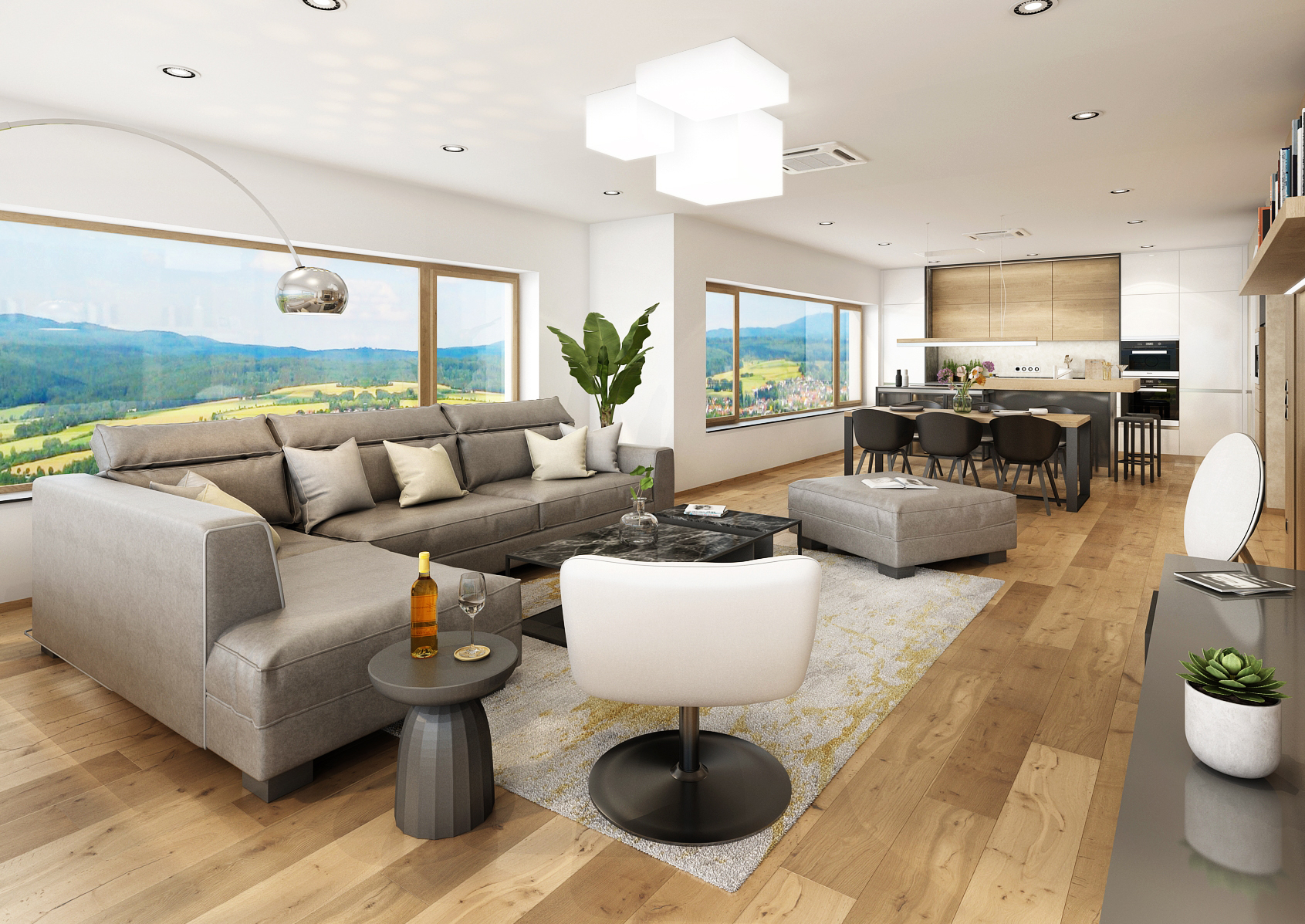 The main living area of this villa provides a wonderful view thanks to the large windows stretching from the kitchen to the living room, which naturally illuminates the entire interior. The whole space is tuned to earthy tones of colors in combination with maple veneer.