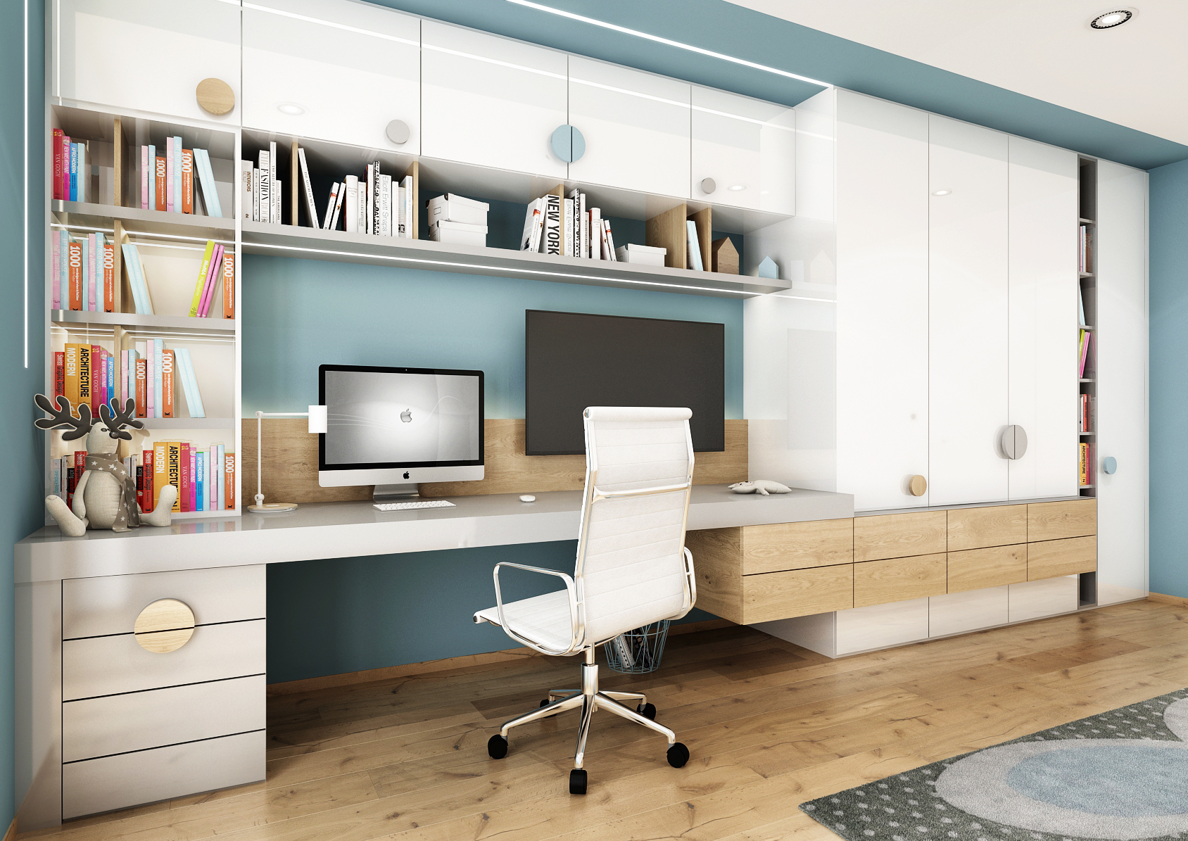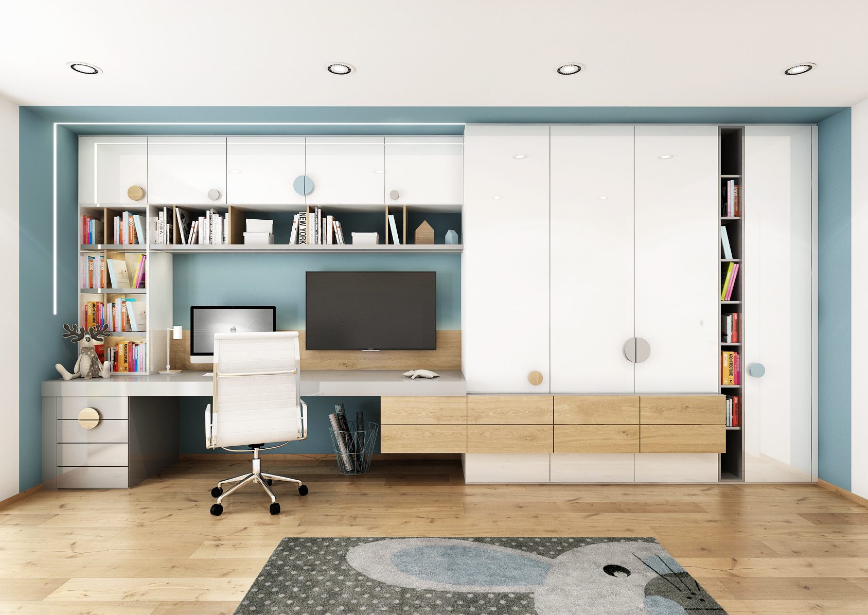 The children's room with its own corner for the student is decorated in blue tones together with white lacquer and maple veneer. Instead of handles, there are colored wheels, thanks to which the built-in cabinets look playful. These are connected as a whole to a spacious desk with a bookcase.