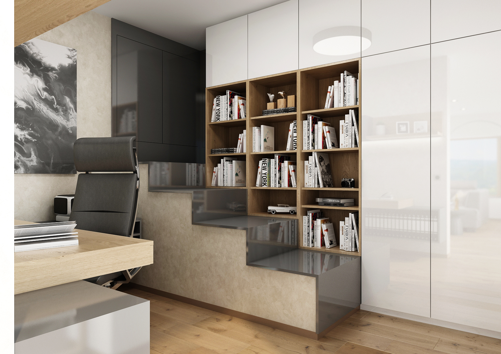 The TV wall perfectly separates the study from the rest of the interior, so the inhabitants of the house are not disturbed by each other at work or relaxation.